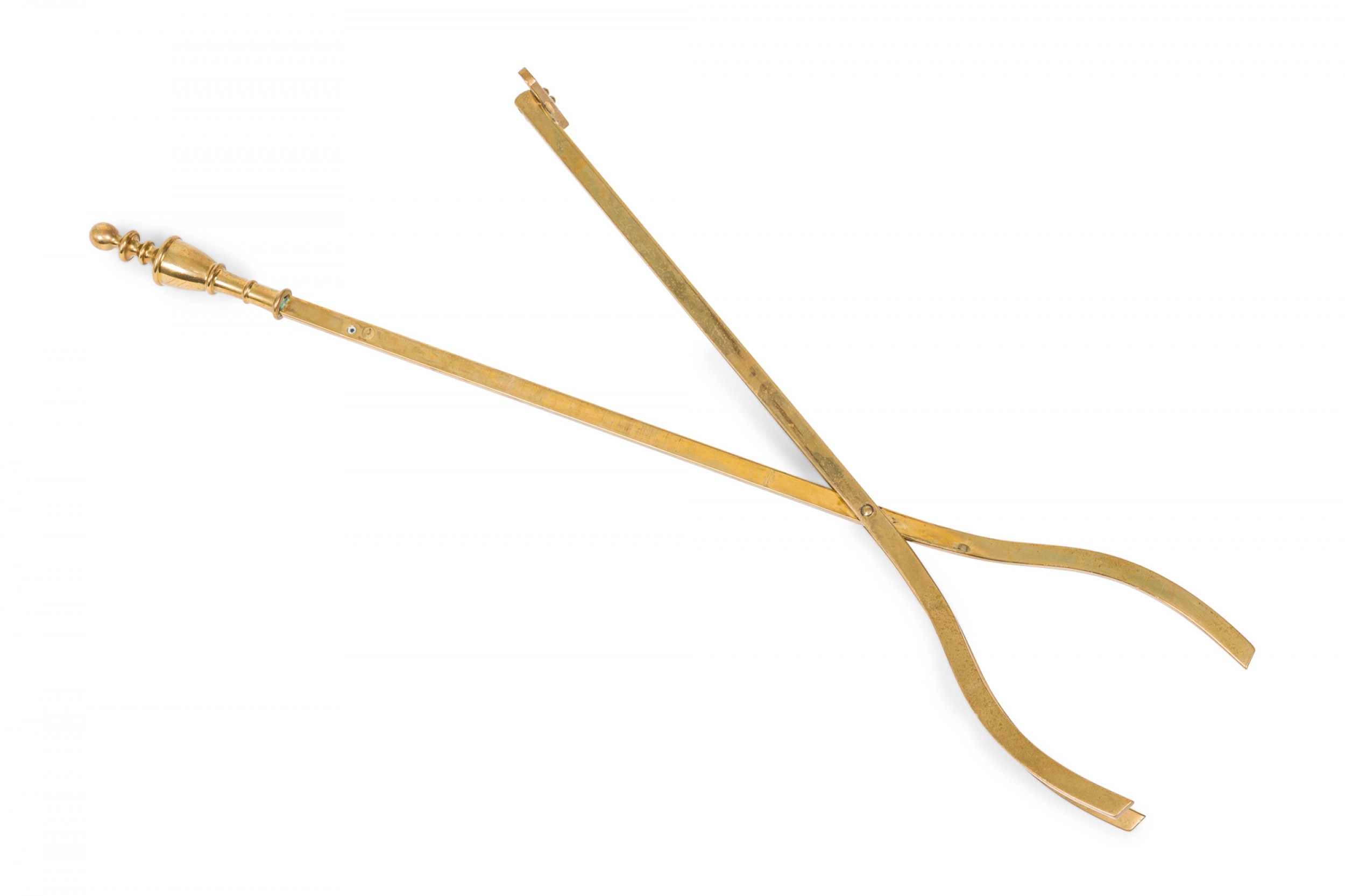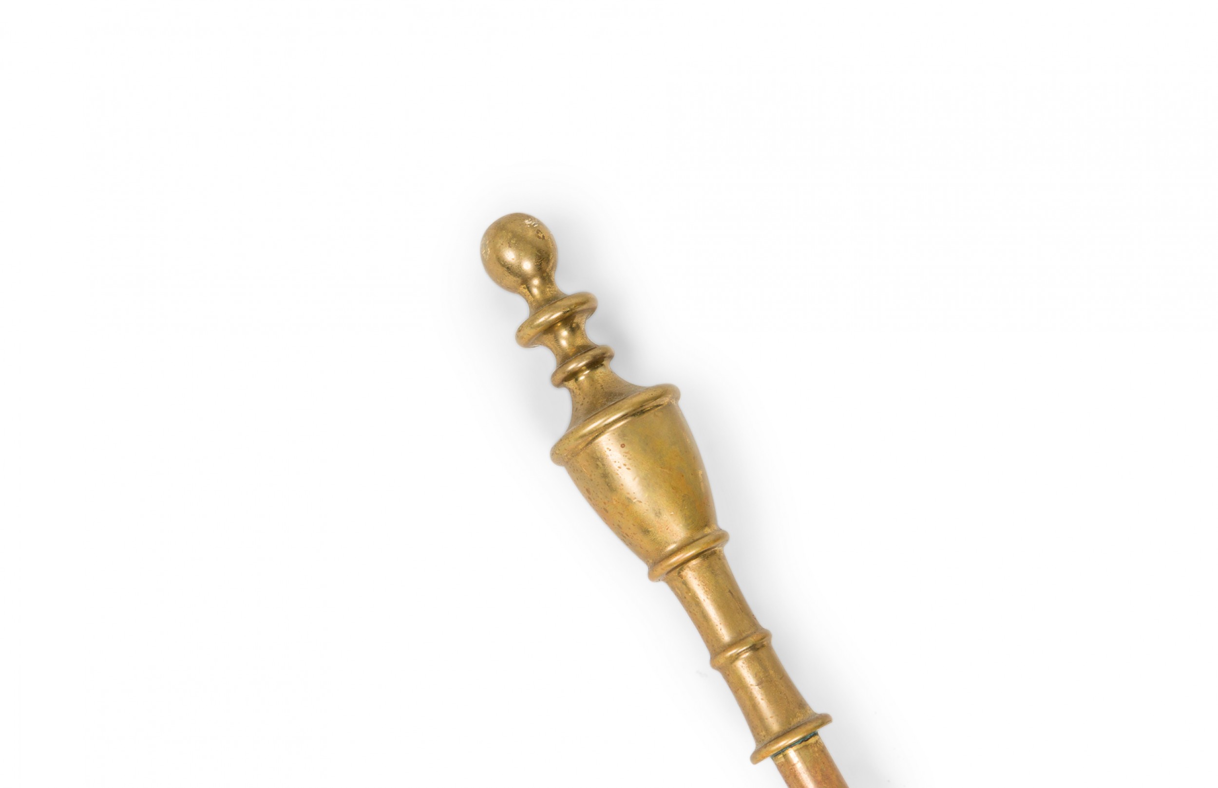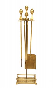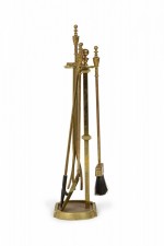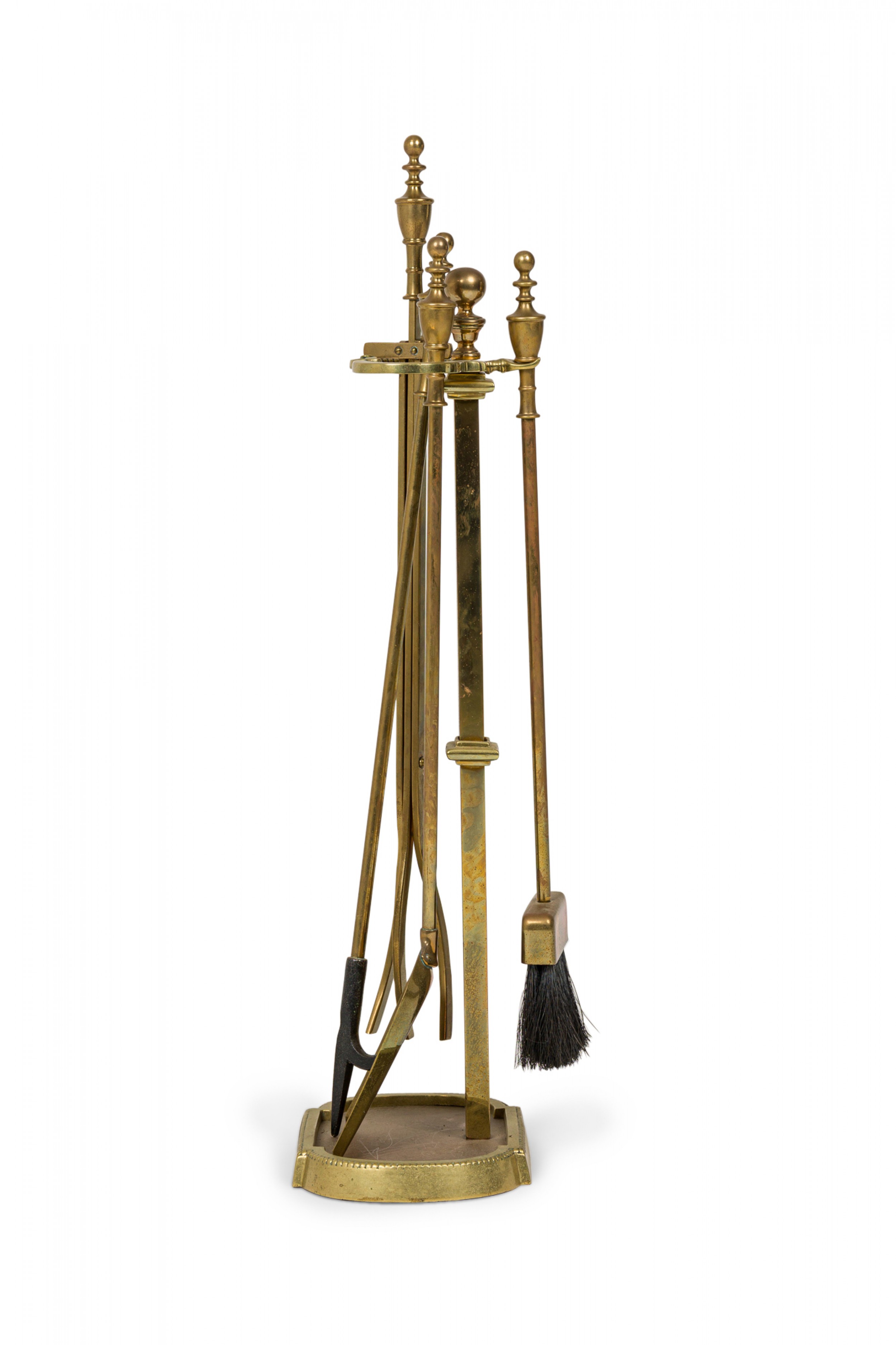 English Georgian-style fire tool set comprised of a brush, shovel, poker and tongs with brass finials, supported in a brass rack with and oval base..
