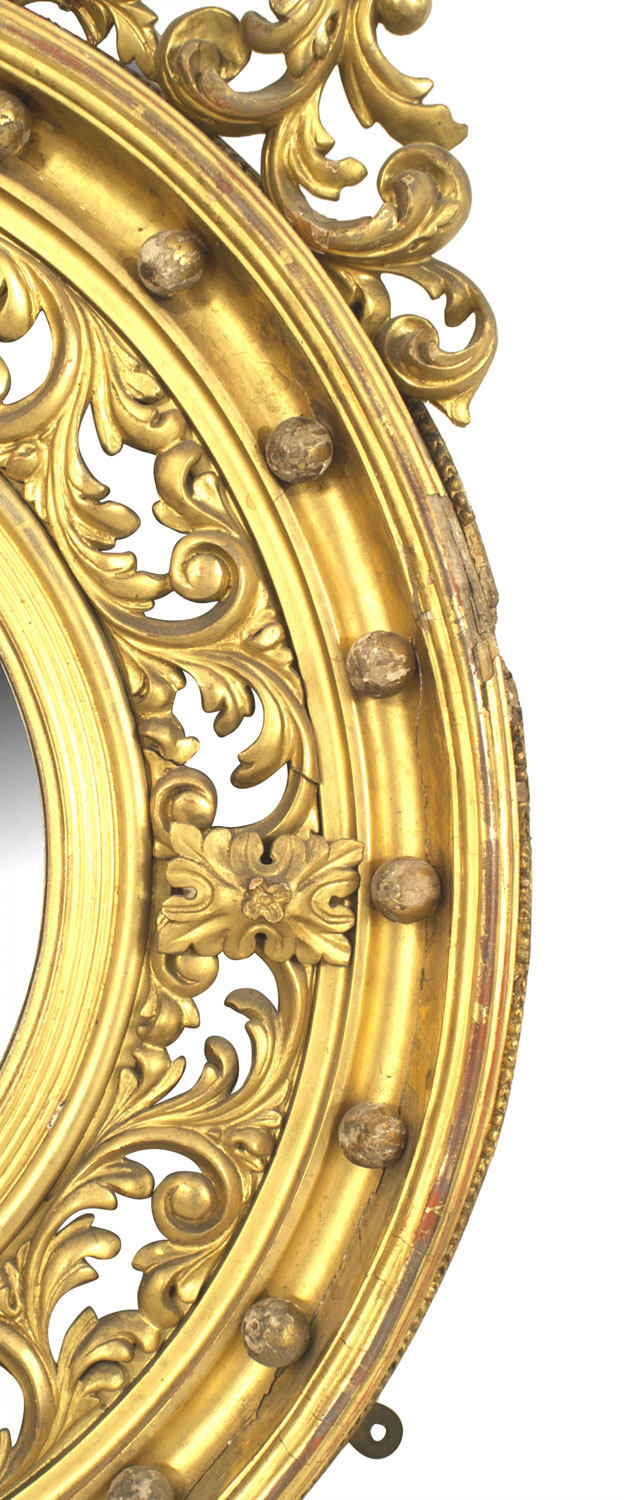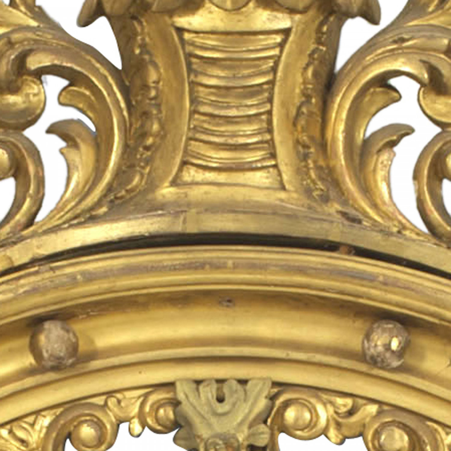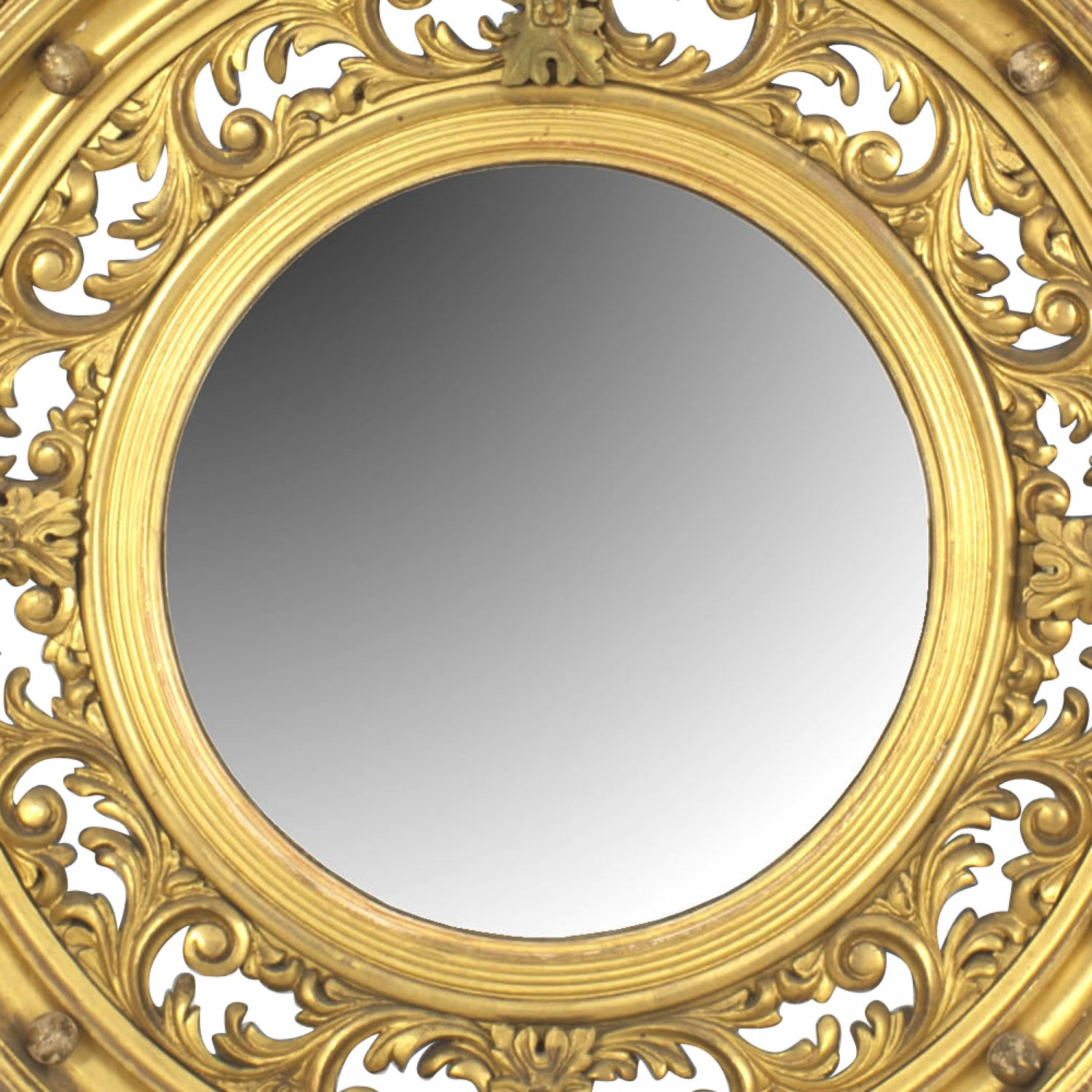 English Georgian-style (19th Century) round gilt convex wall mirror with filigree carved scroll design and eagle pediment top.