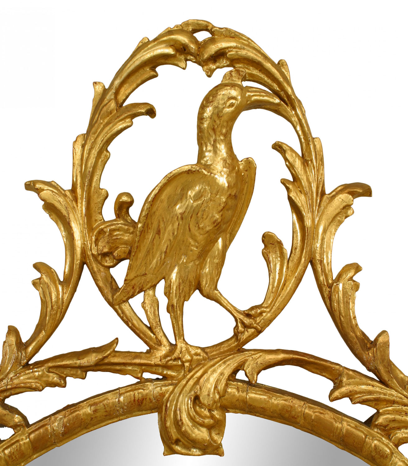 English Georgian-style (19th/20th Century) gilt oval vertical wall mirror with filigree floral border and bird design top..
