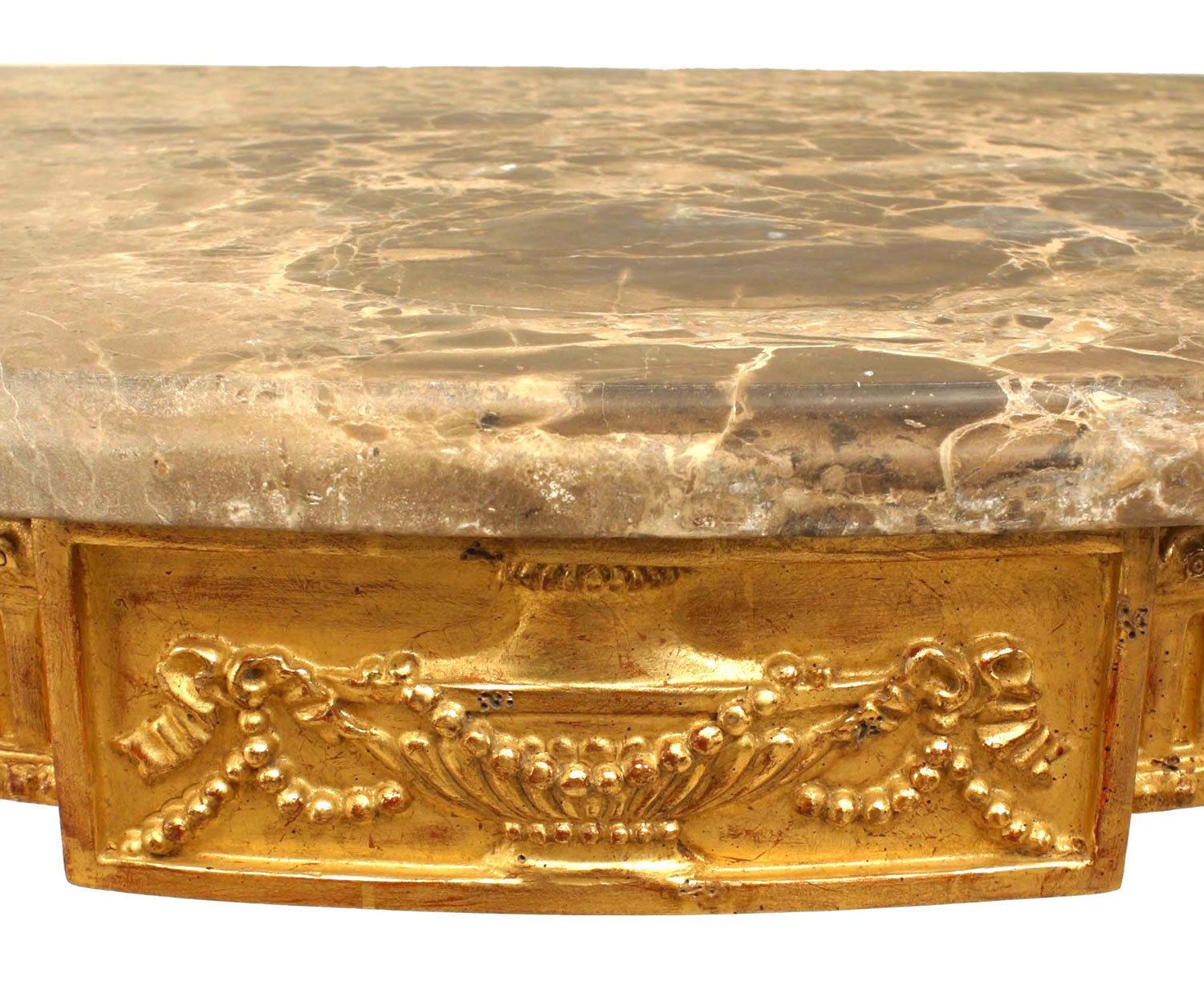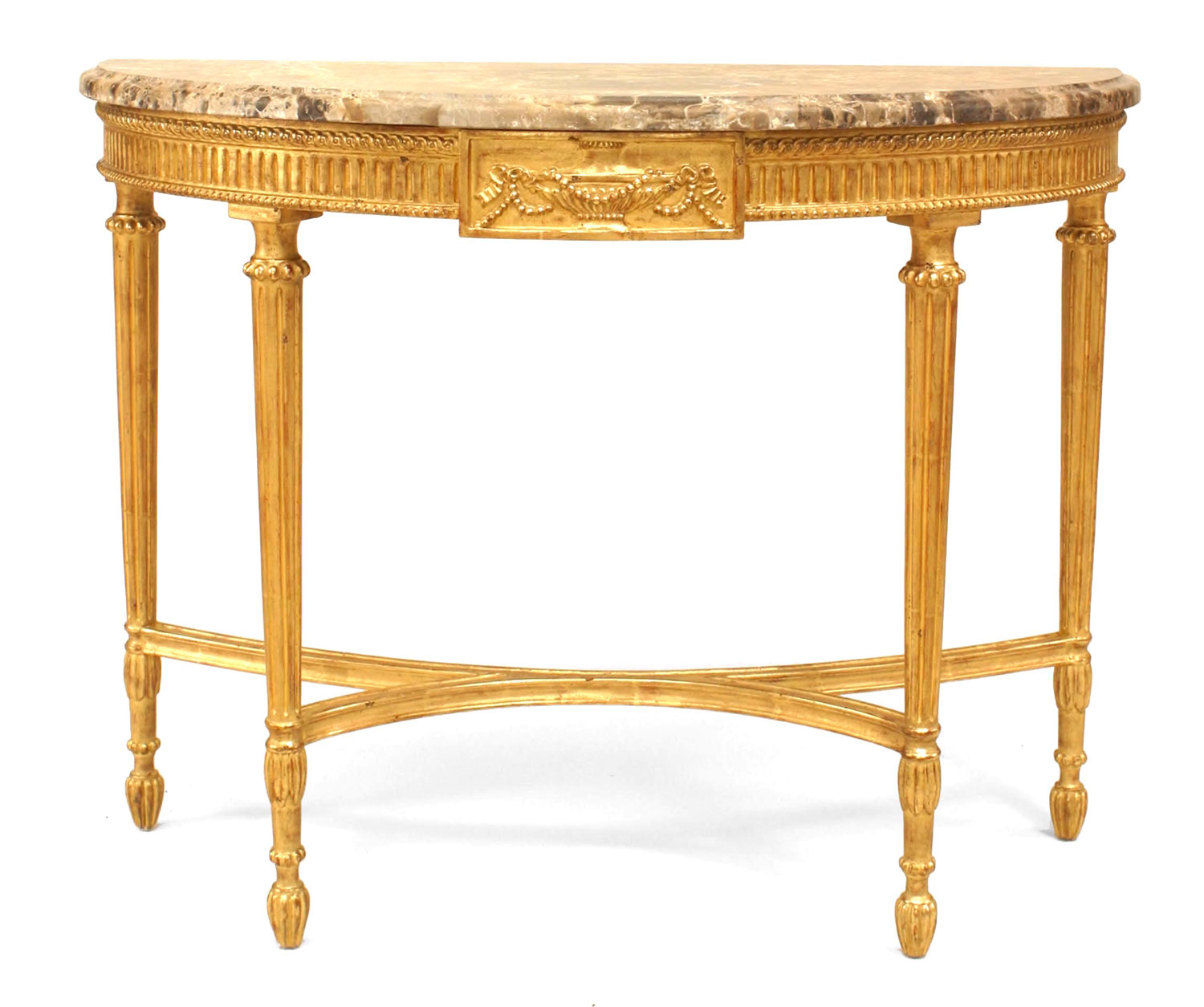 English Georgian-style (20th Century) gilt console table with fluted legs and apron with an urn & swag design center medallion and grey/brown marble top.