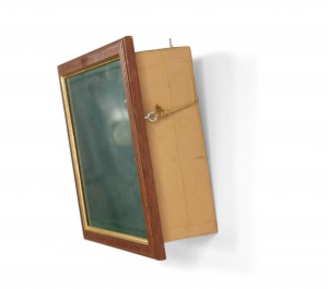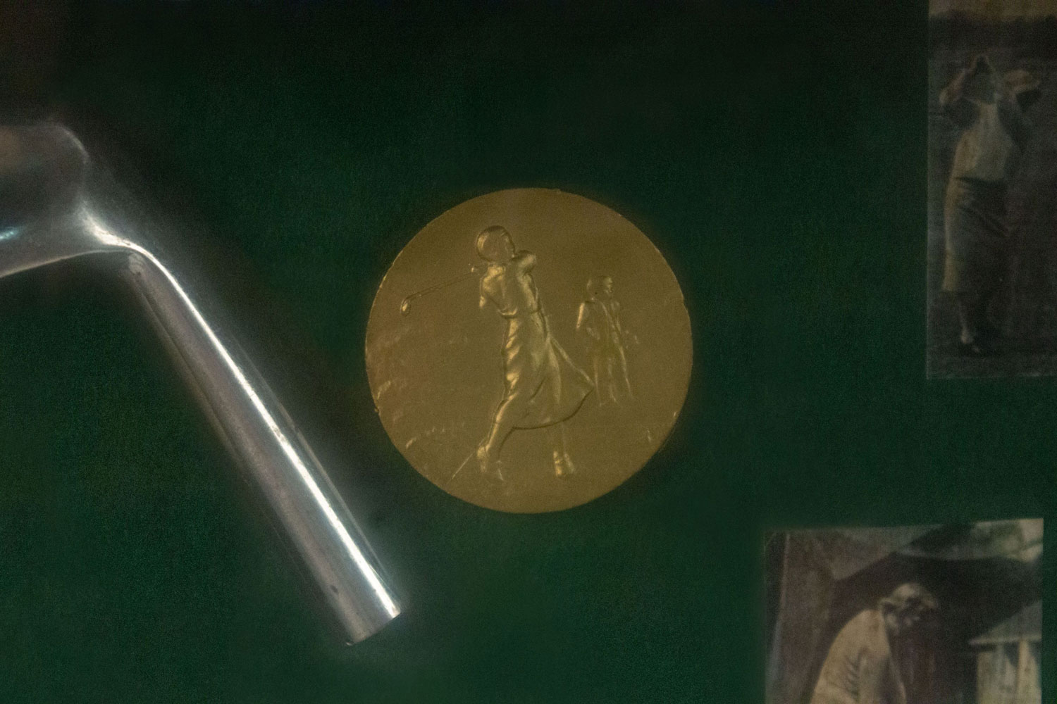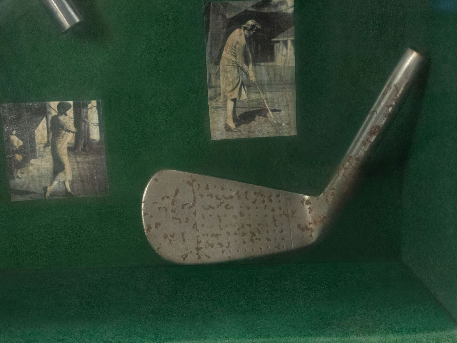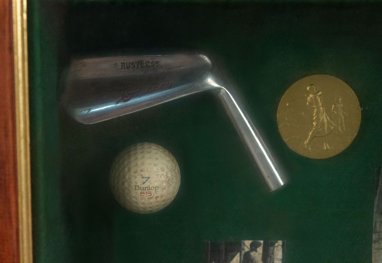 English display case wall plaque with golf iron head, tees, and photo in oak frame.