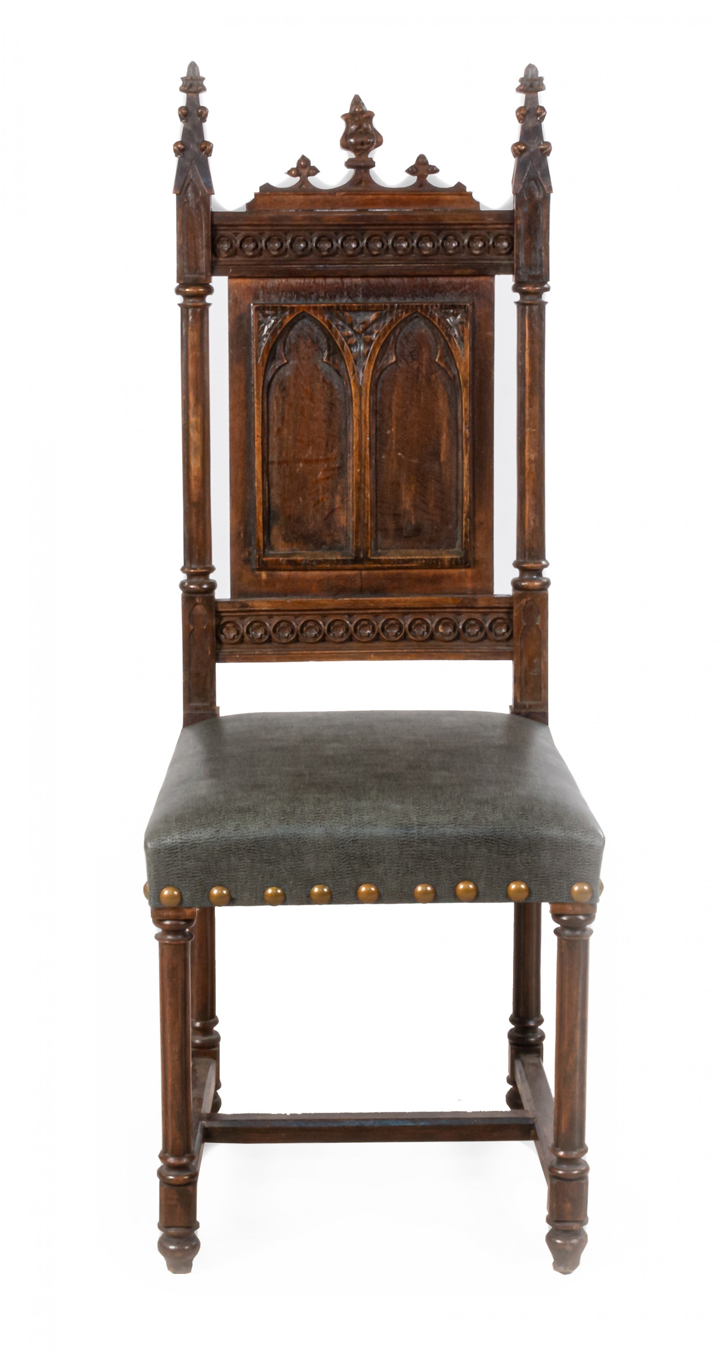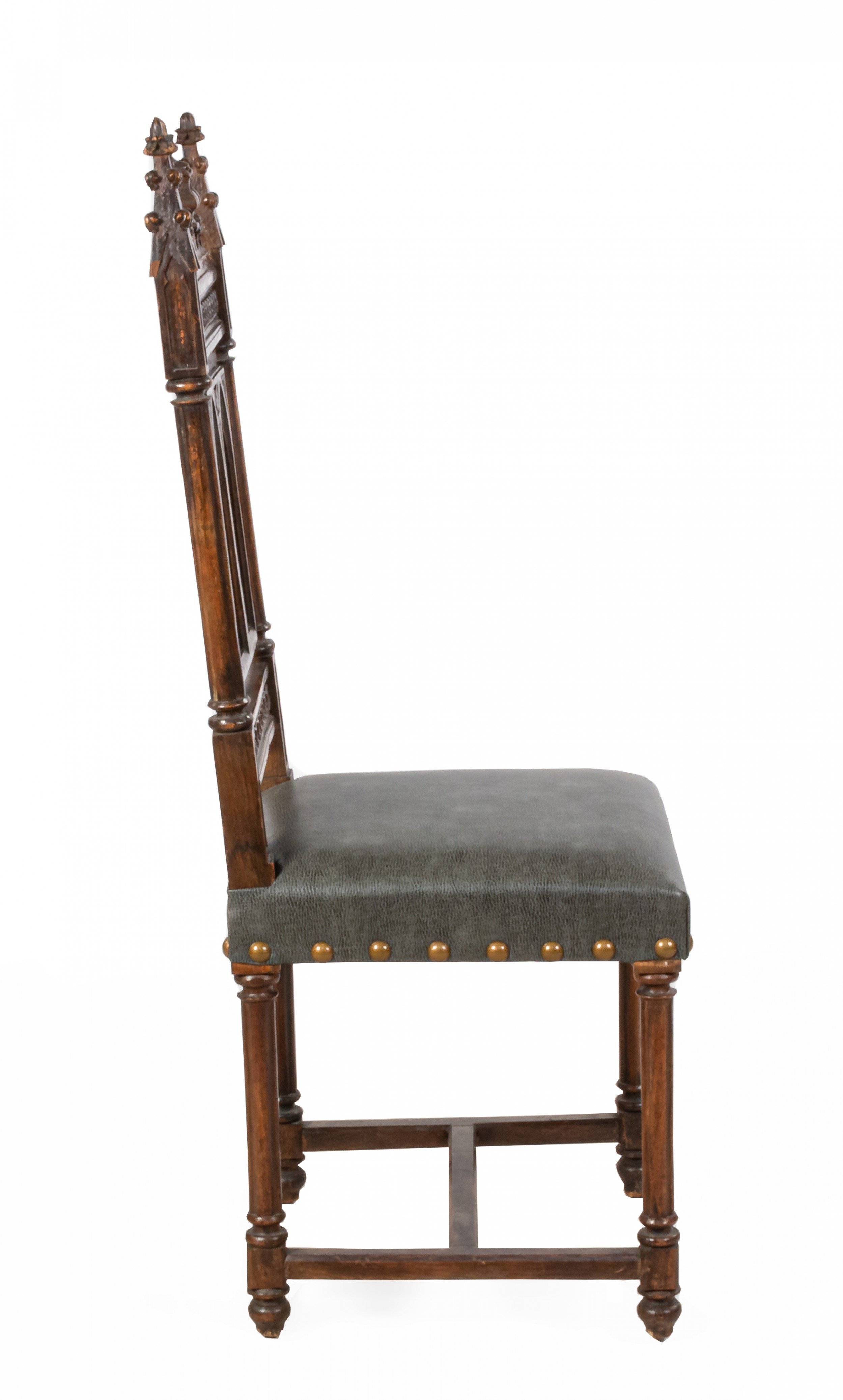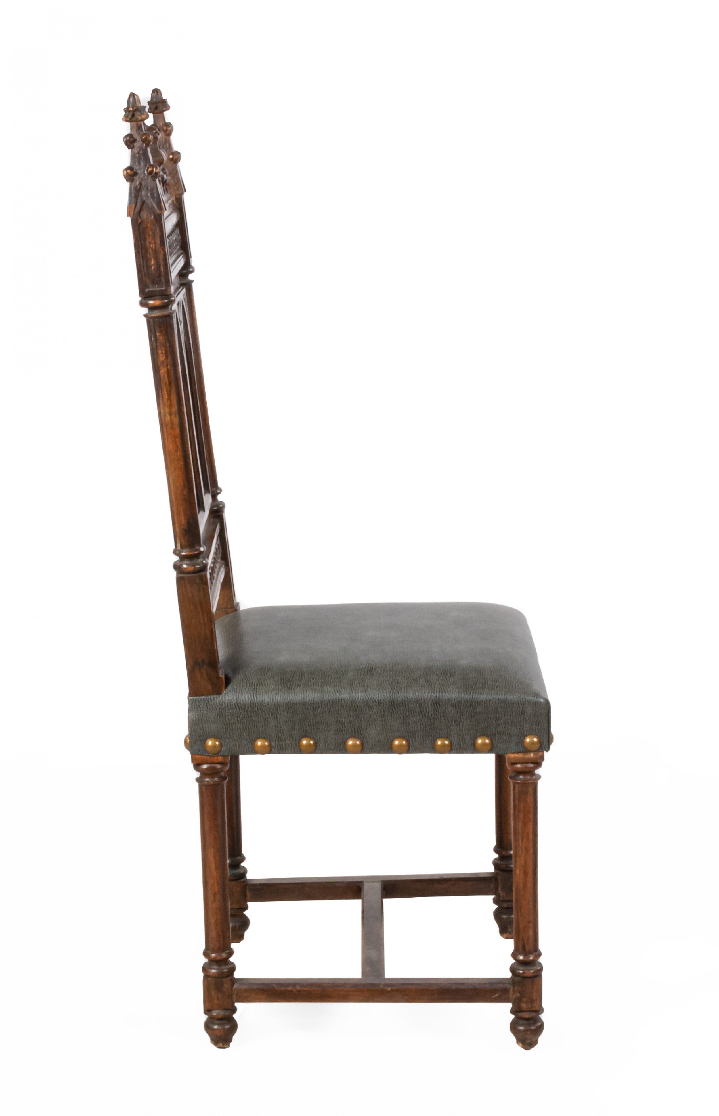 SET of 10 English Gothic Revival style (19th Cent) oak side panel back side chairs with finials and gray leather seat..