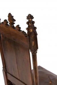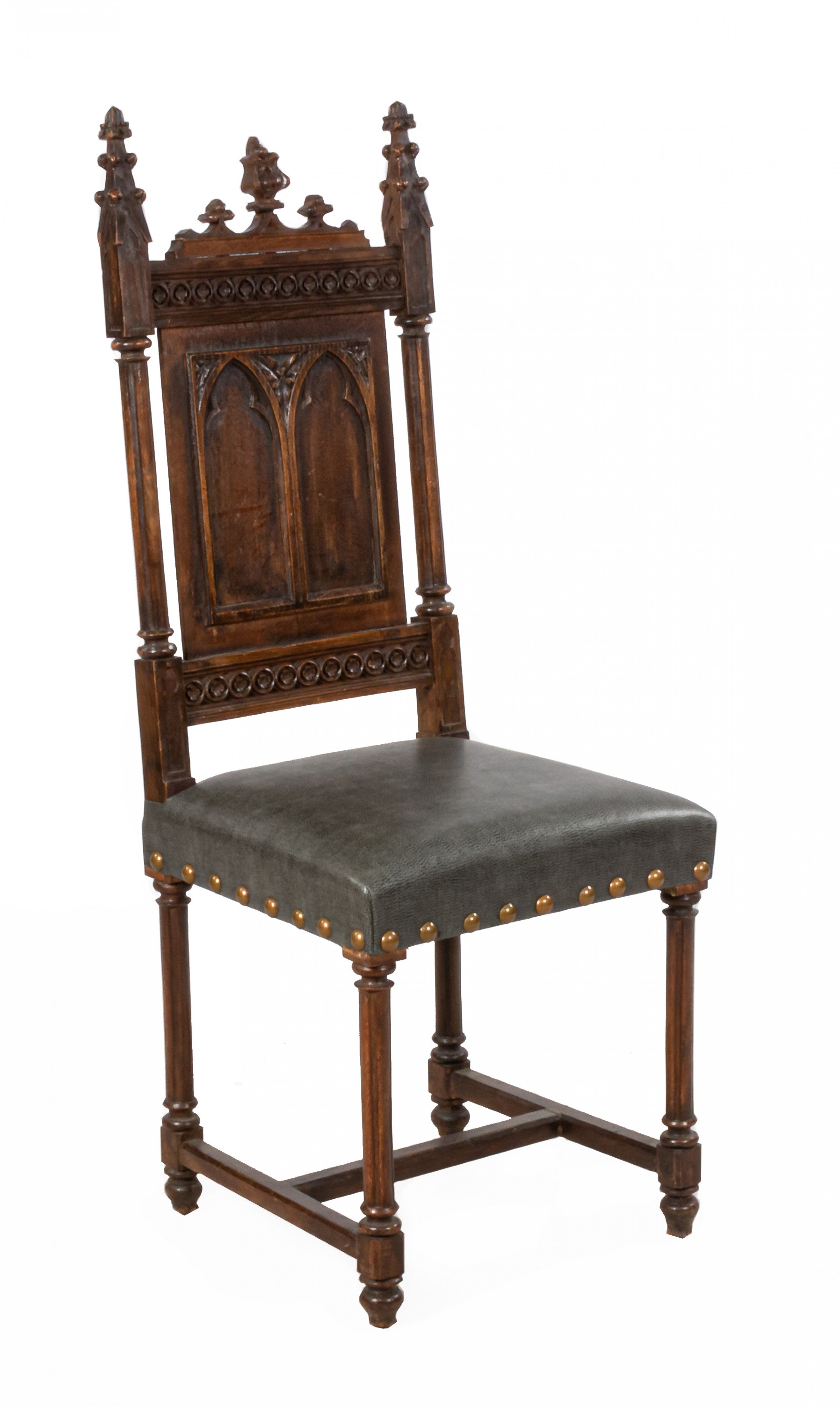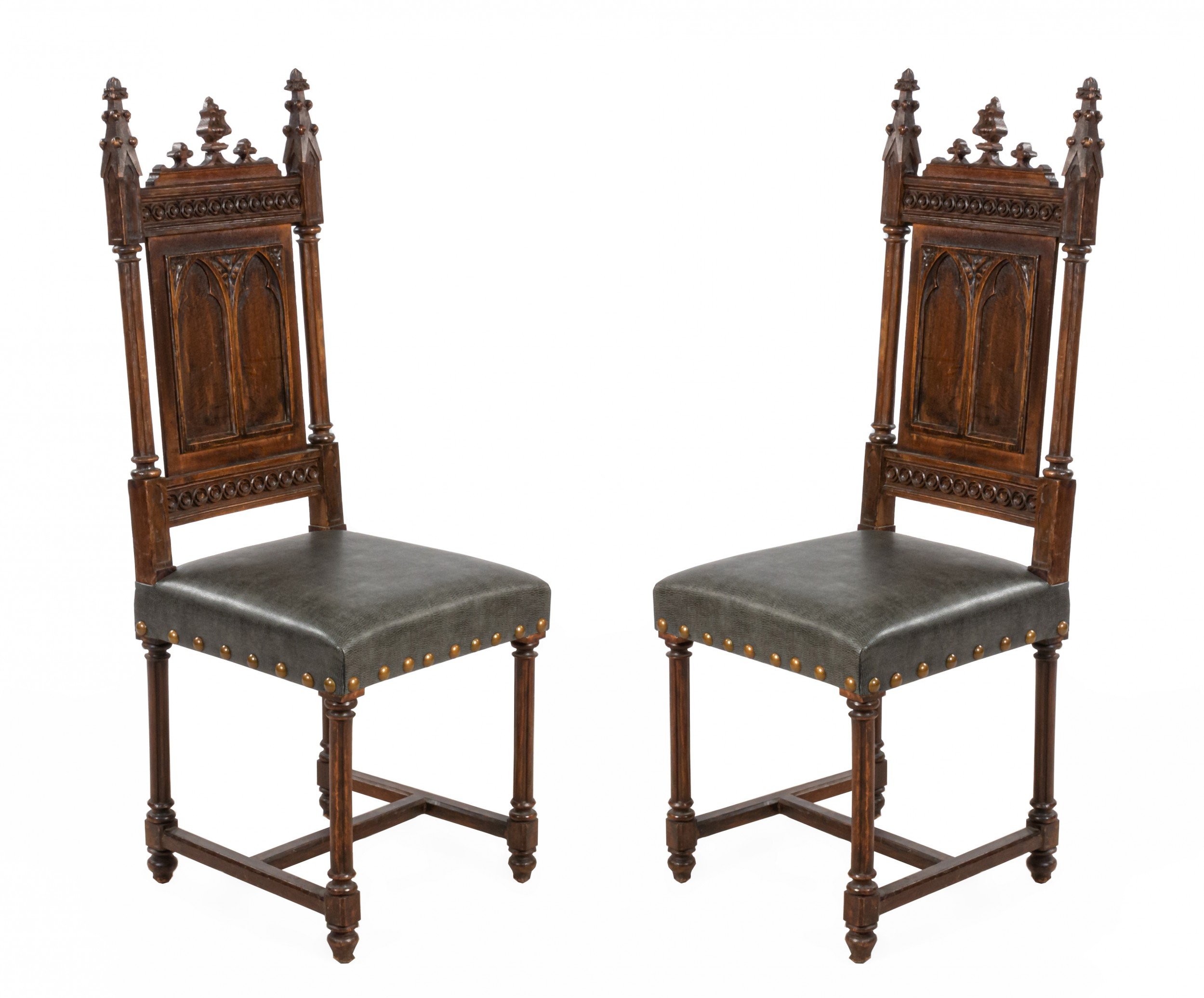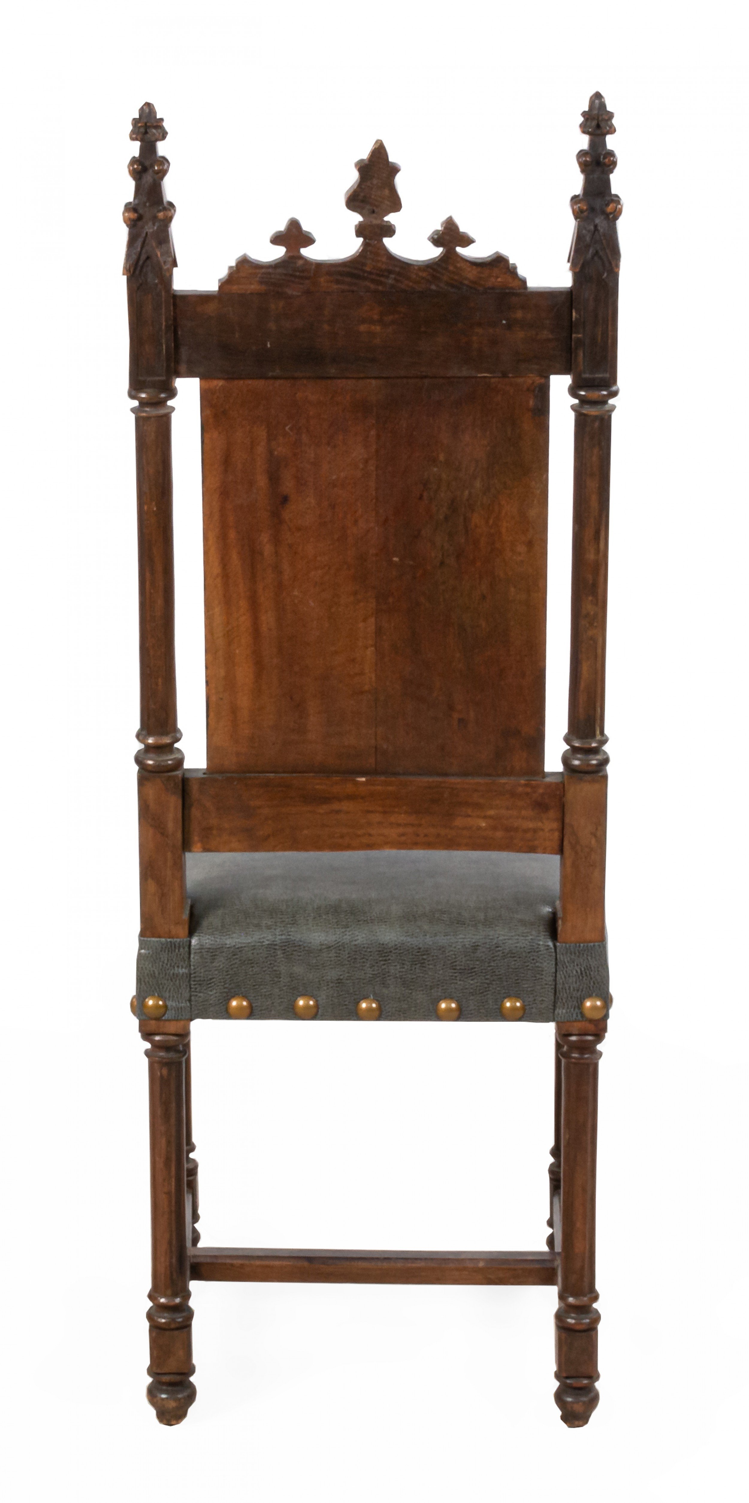 SET of 10 English Gothic Revival style (19th Cent) oak side panel back side chairs with finials and gray leather seat..