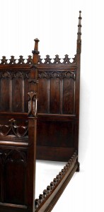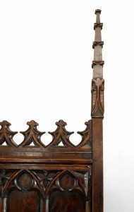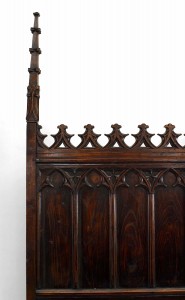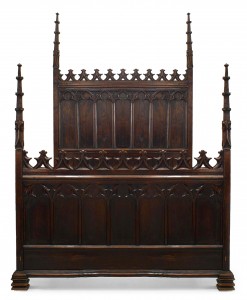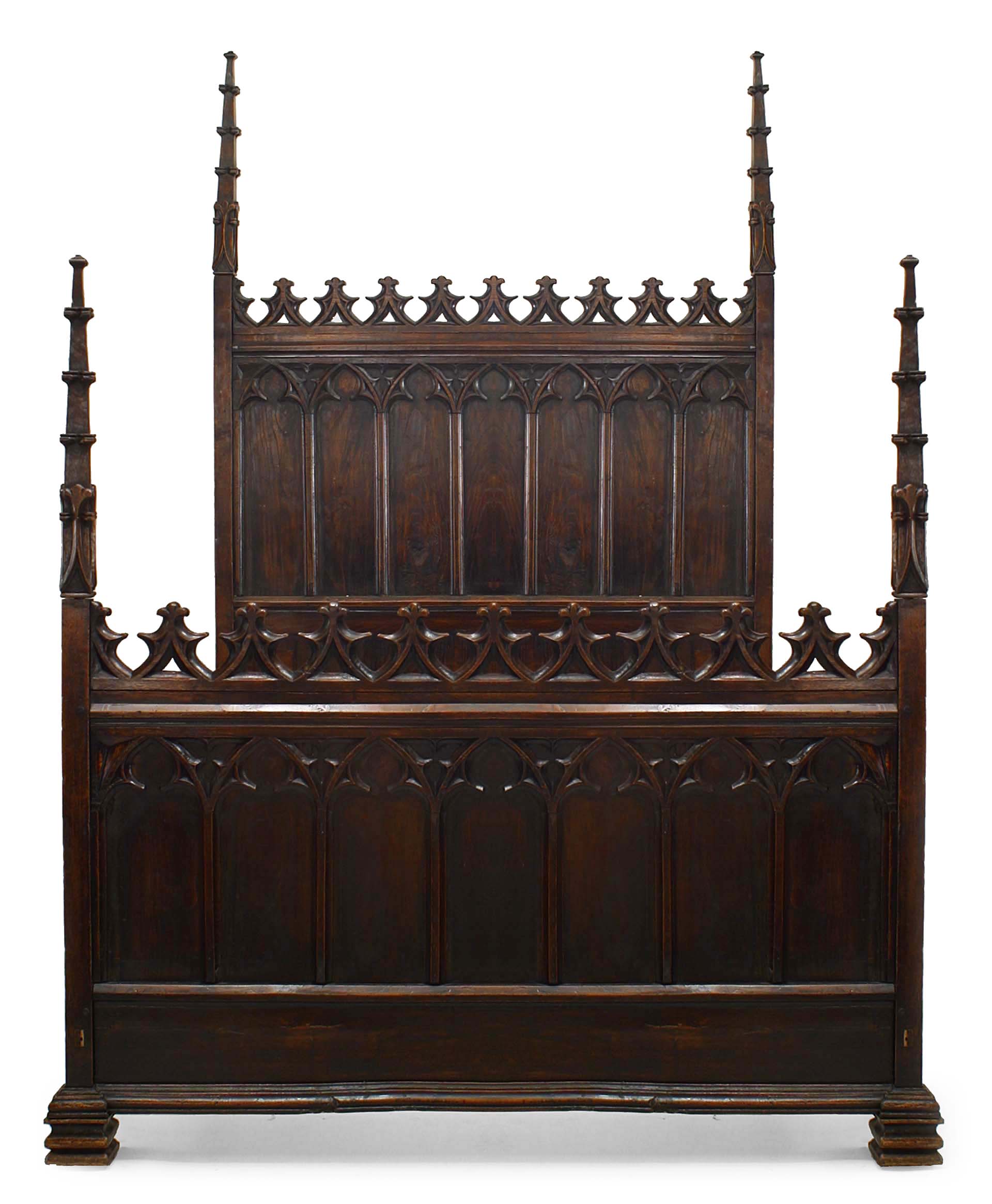English Gothic Revival-style (19th Century) walnut full size bed with carved finial posts. (Includes: headboard, footboard, rails).