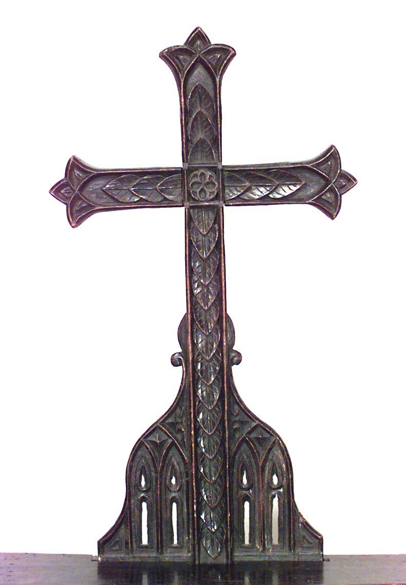 English Gothic Revival style (19th Cent) walnut Prie-dieu with fretwork design and needlepoint upholstery.