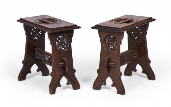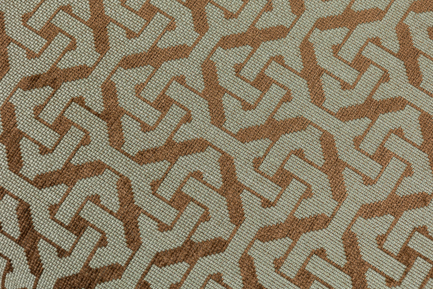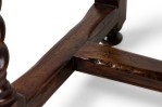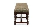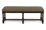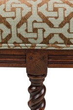 English Gothic style upholstered bench with an interlocking meander pattern fabric atop an oak barley twisted base
