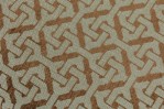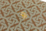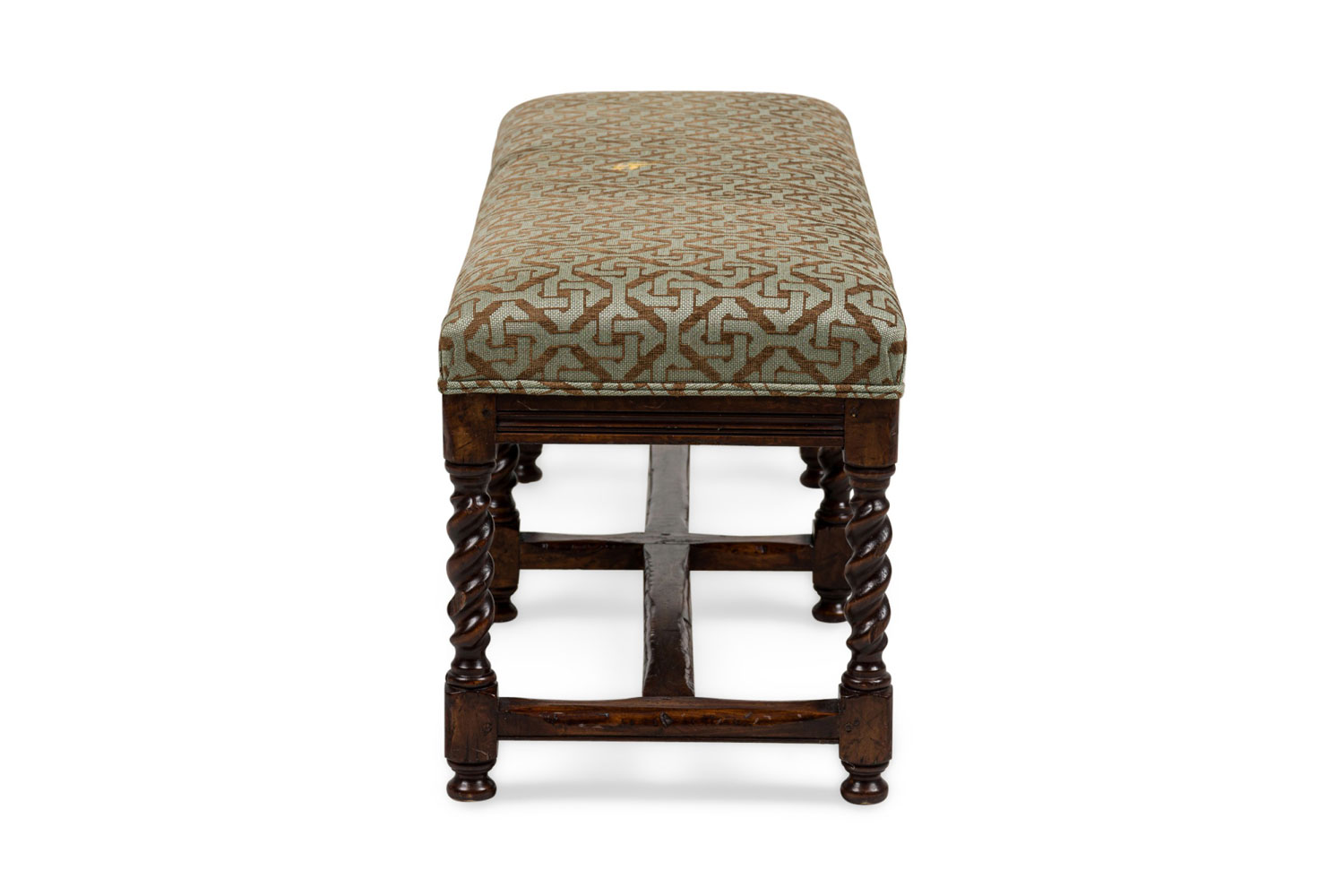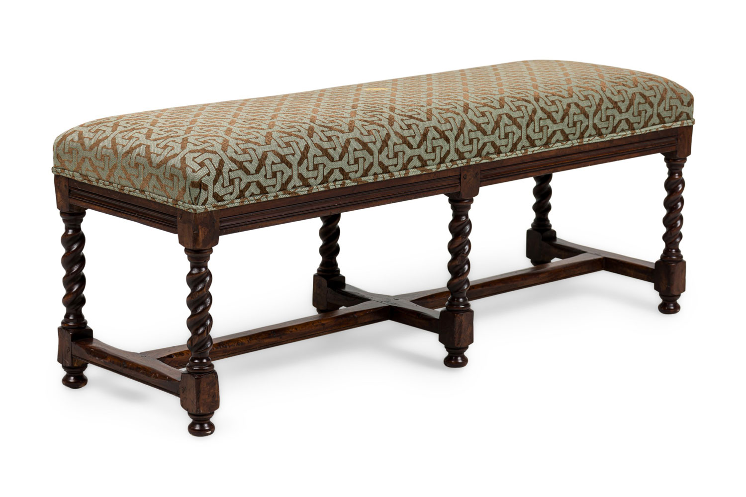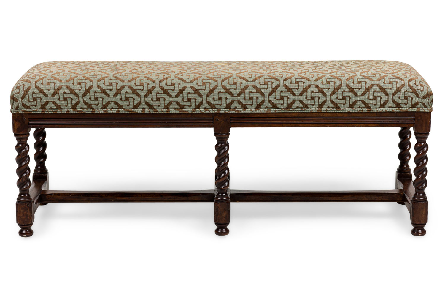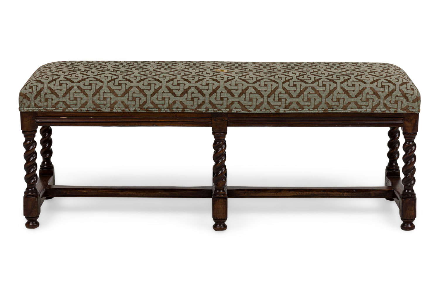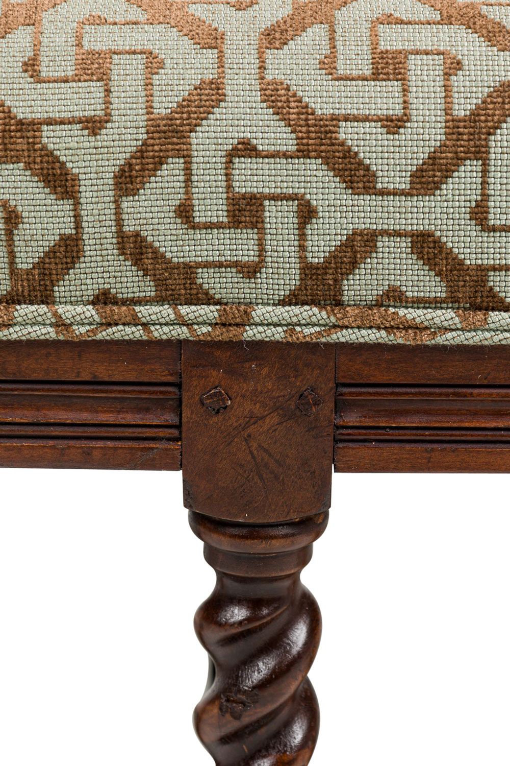 English Gothic style upholstered bench with an interlocking meander pattern fabric atop an oak barley twisted base.