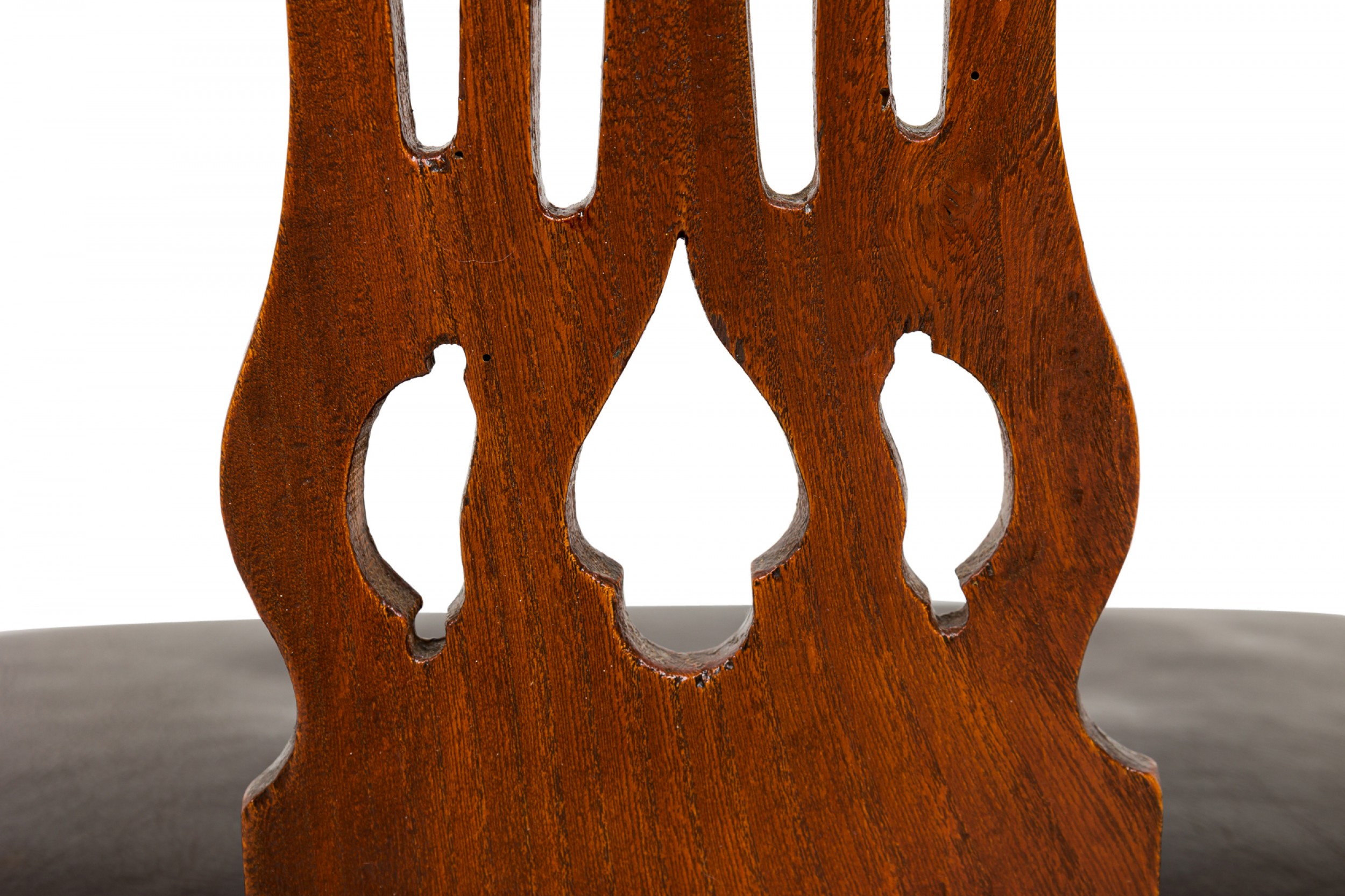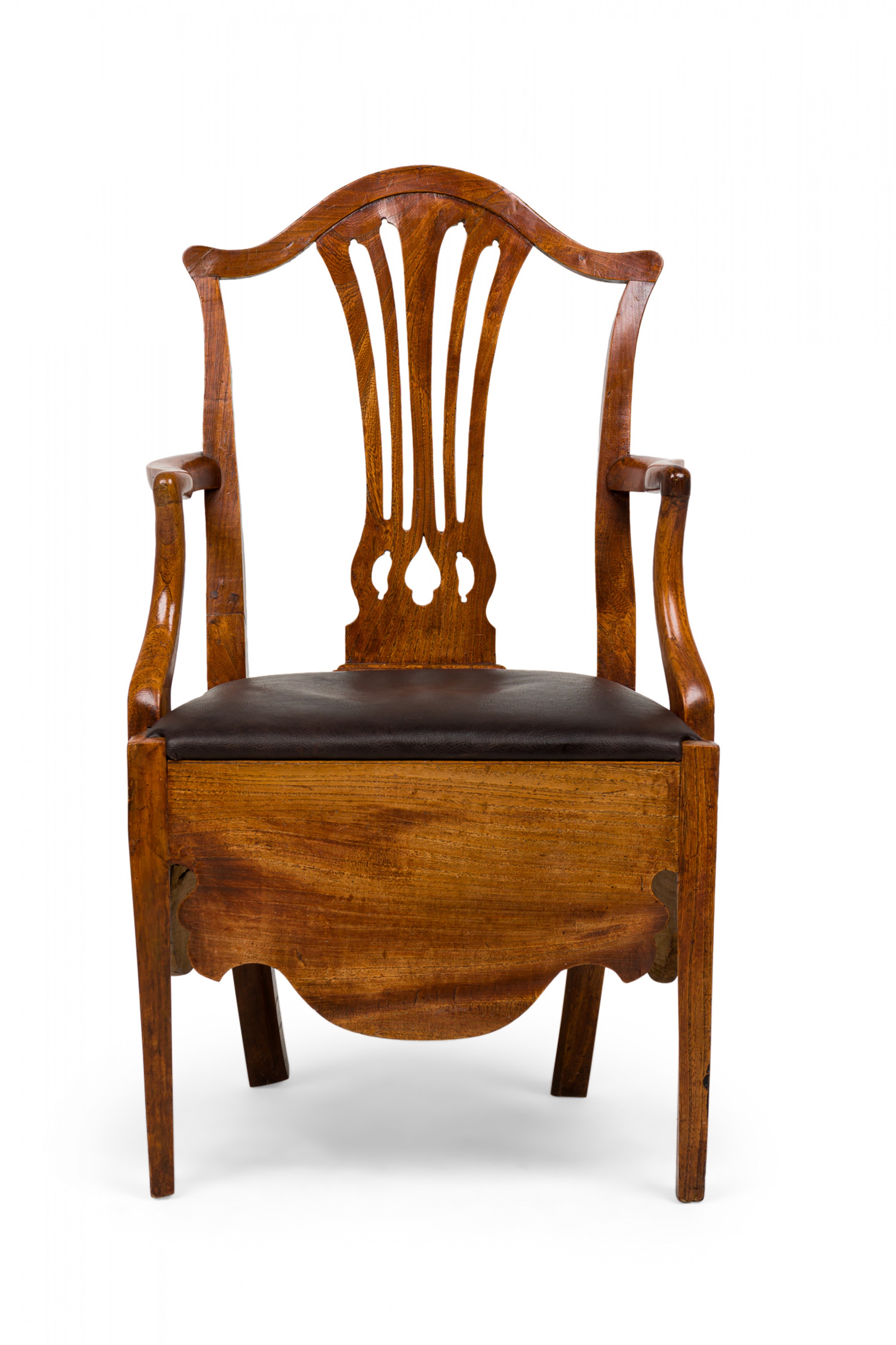 English Hepplewhite (18th Century) elm wood commode chair with slightly curved urn-form openwork back splat, shaped arms and flattened apron surrounding a black leather seat, concealing a lower opening for a chamber pot..