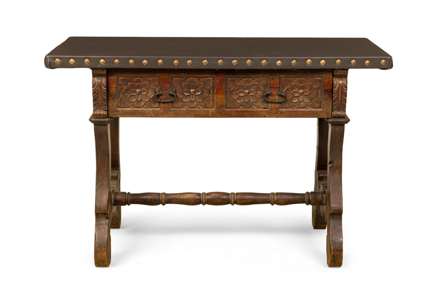 English Jacobean-style (20th Century) carved mahogany console table with a dark gray leather top with decorative nailhead trim above three drawers with floral design carved fronts flanked on either side with carved acanthus leaves, resting on four legs with scroll feet and a stretcher base..