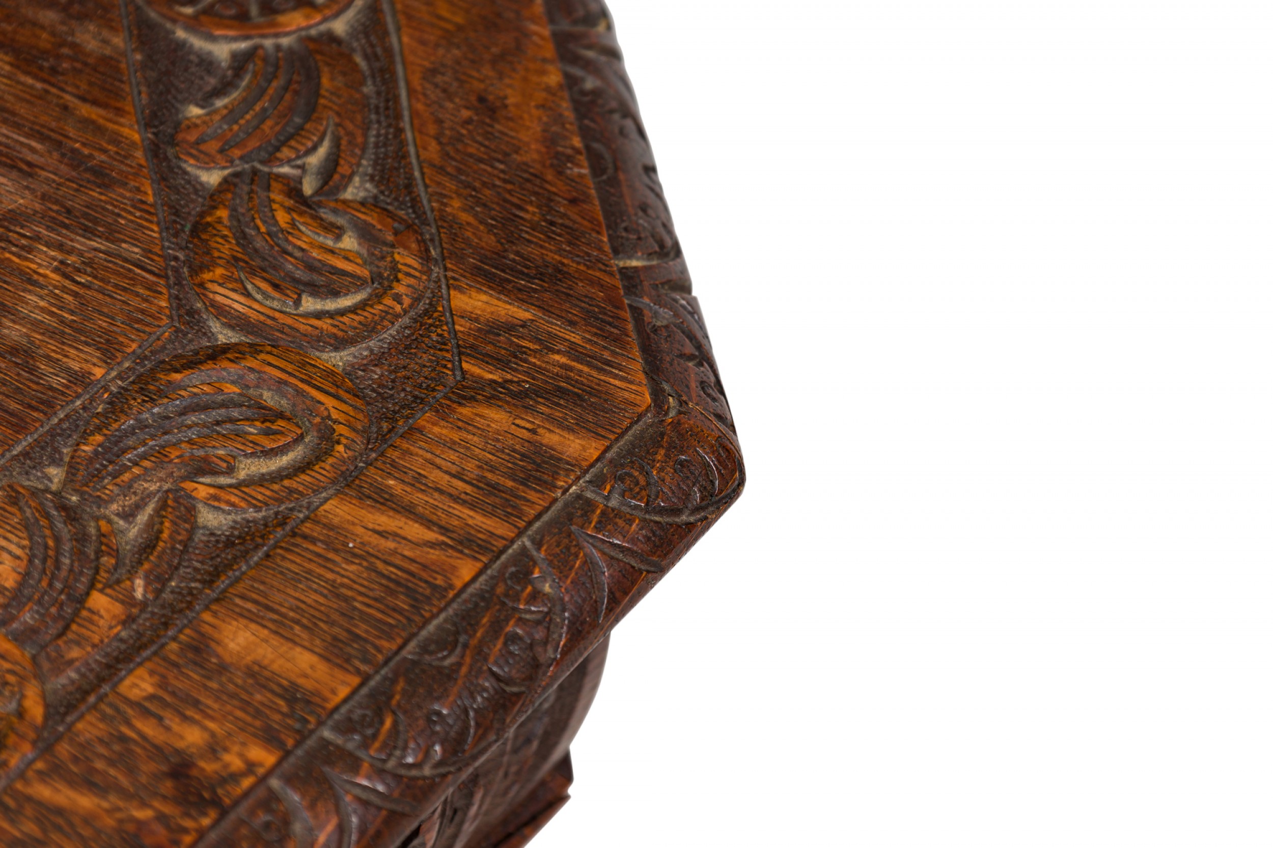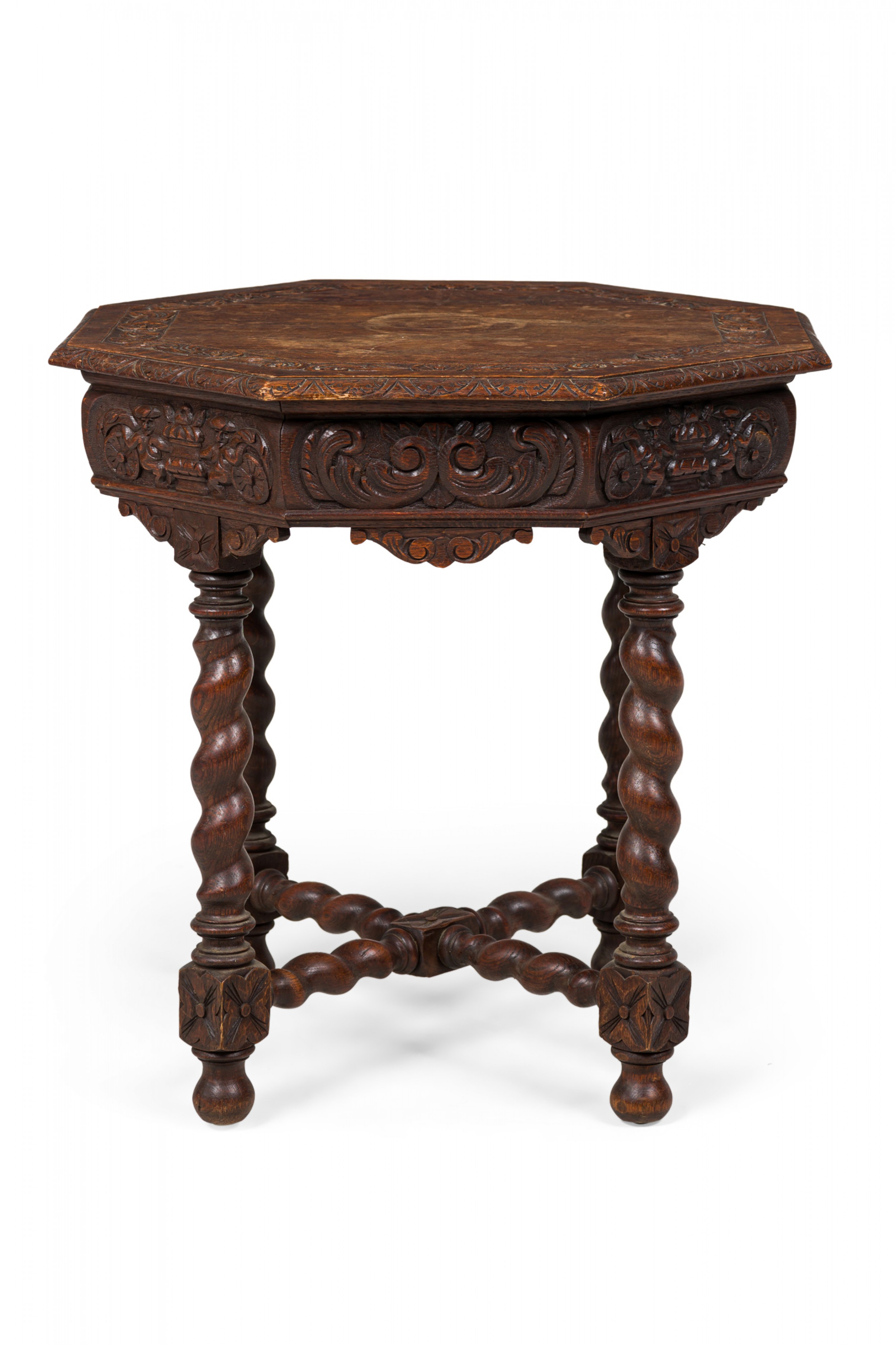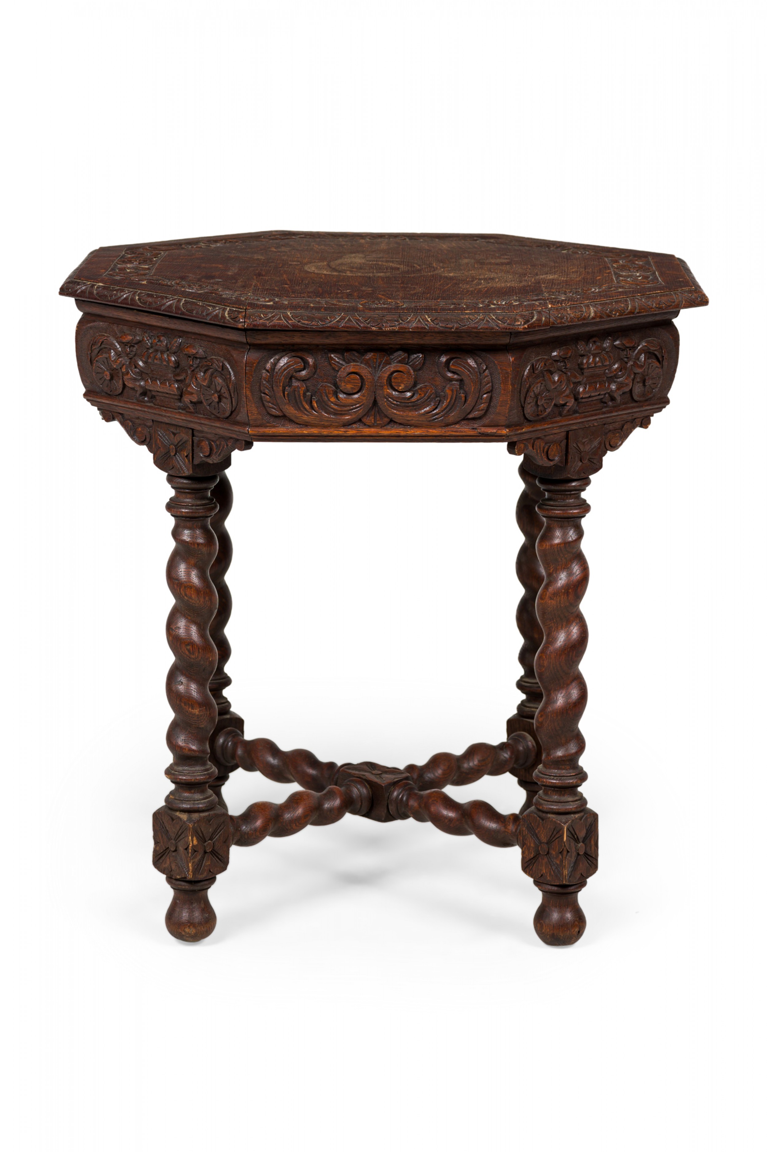 English Jacobean-style carved oak occasional / side table with an octagonal top with carved inlay and apron, resting on four spiral turned legs joined by a spiral turned x-stretcher and resting on carved ball feet.