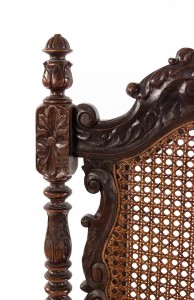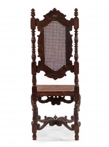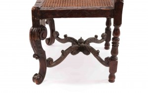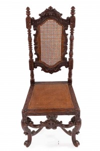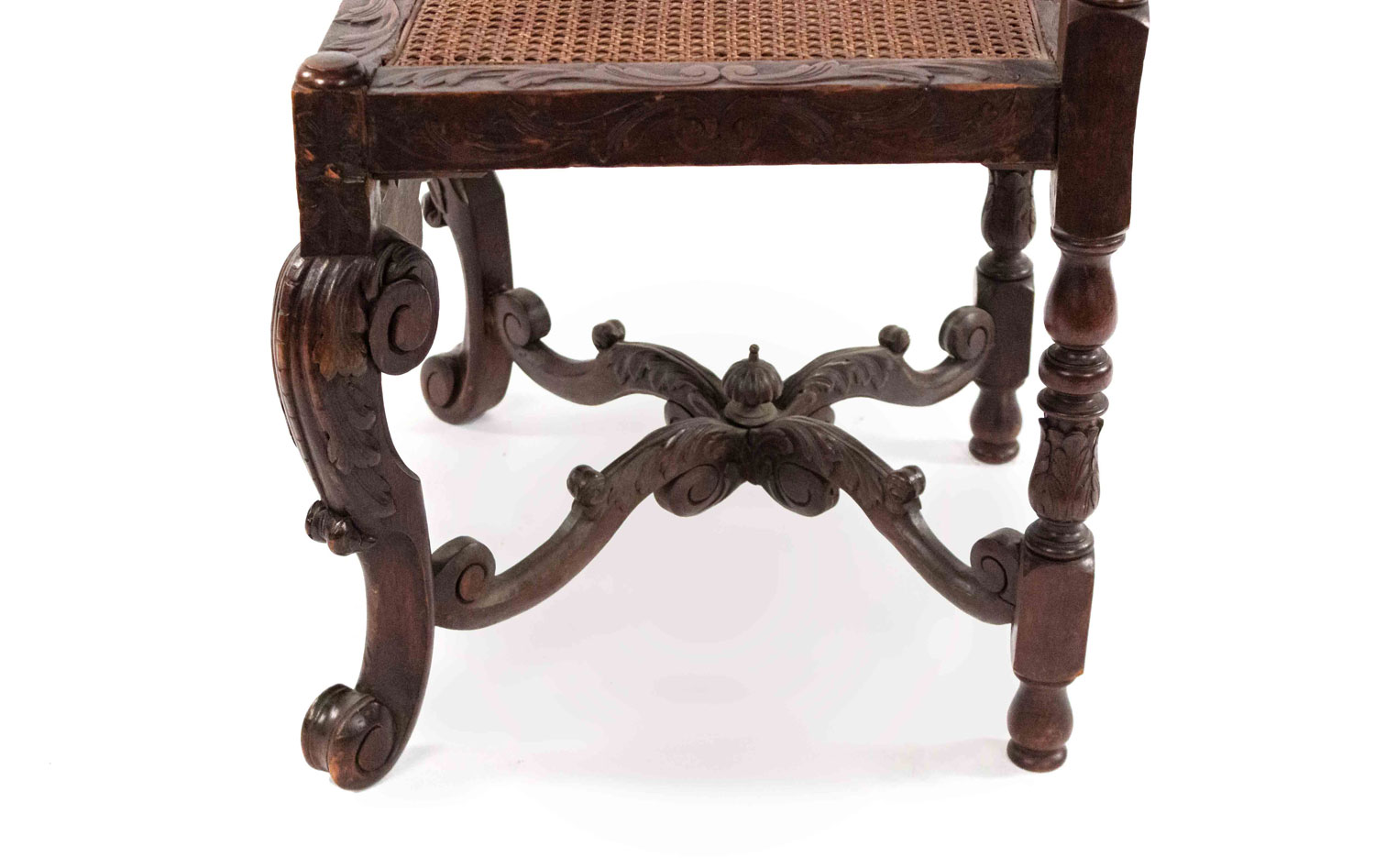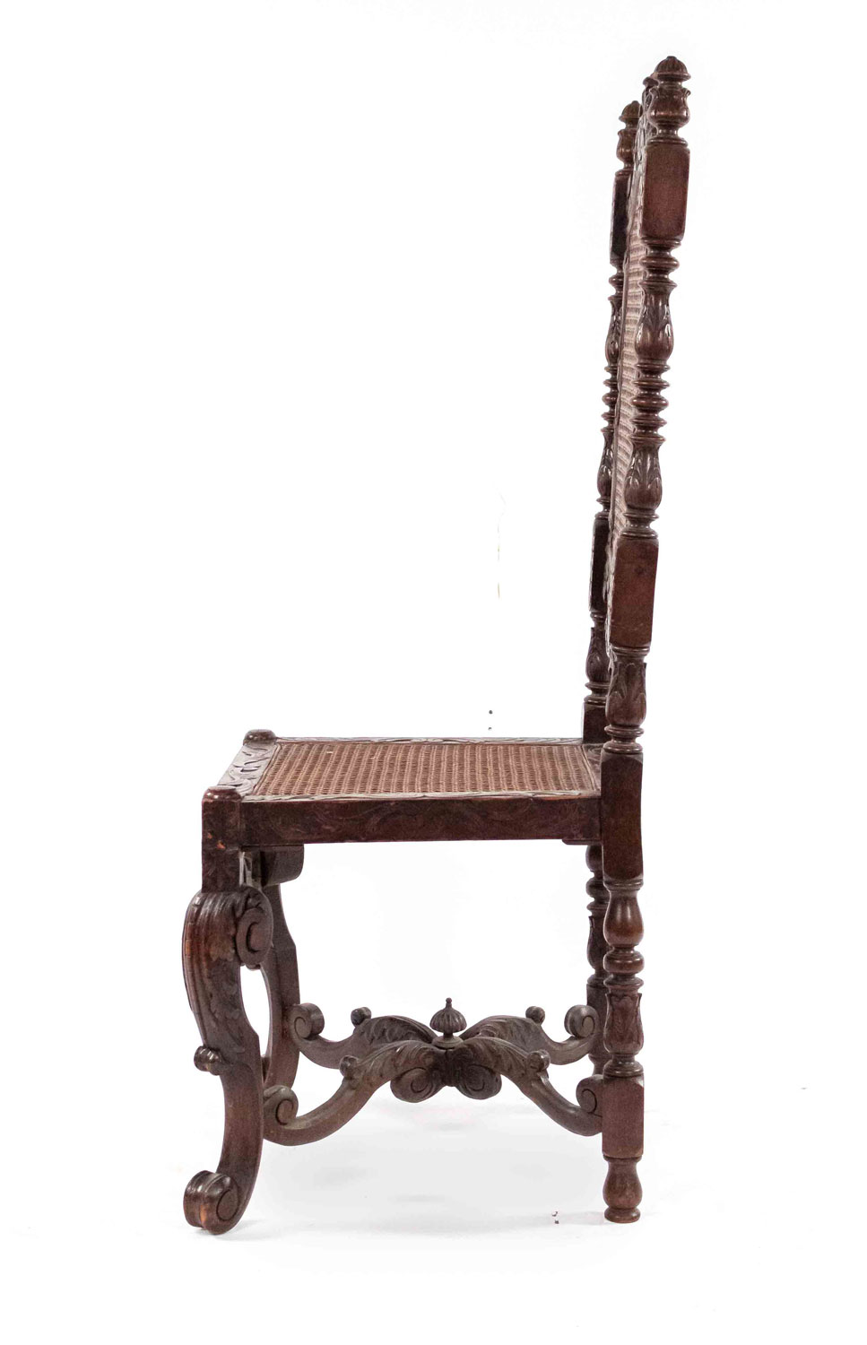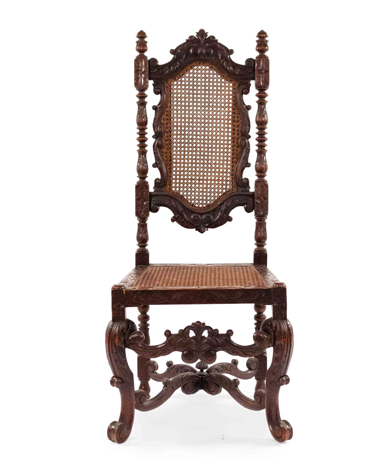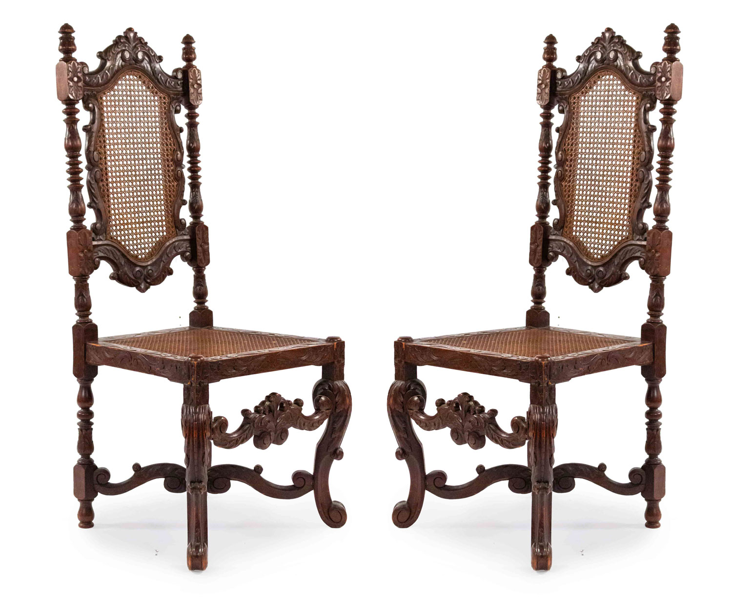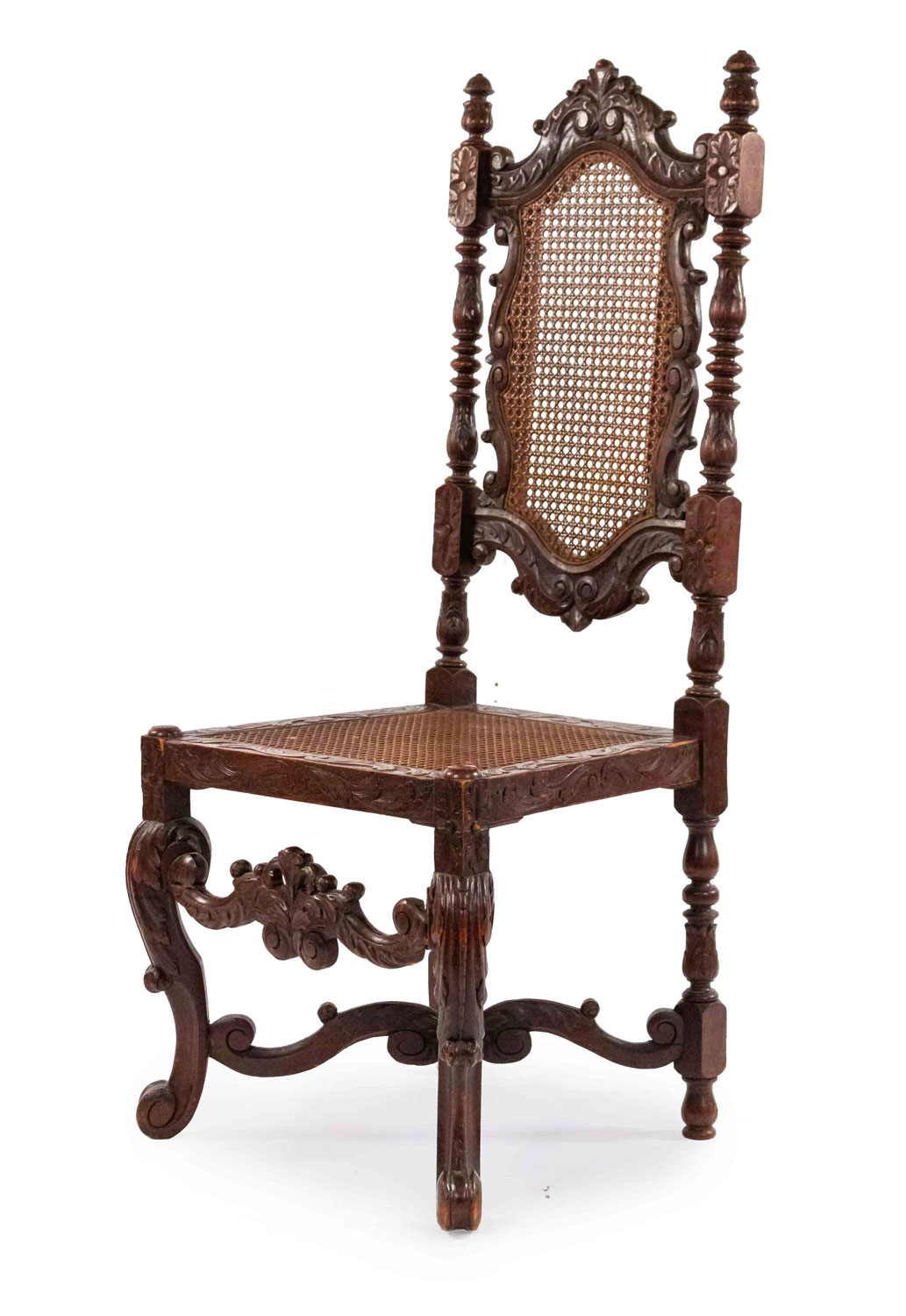 PAIR of English Jacobean style (19th Cent) walnut side chairs with cane seat and back with finial on stretcher. (matching side chairs #037796A).