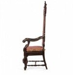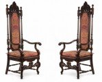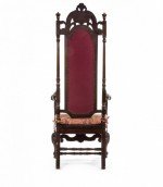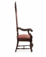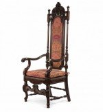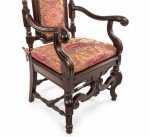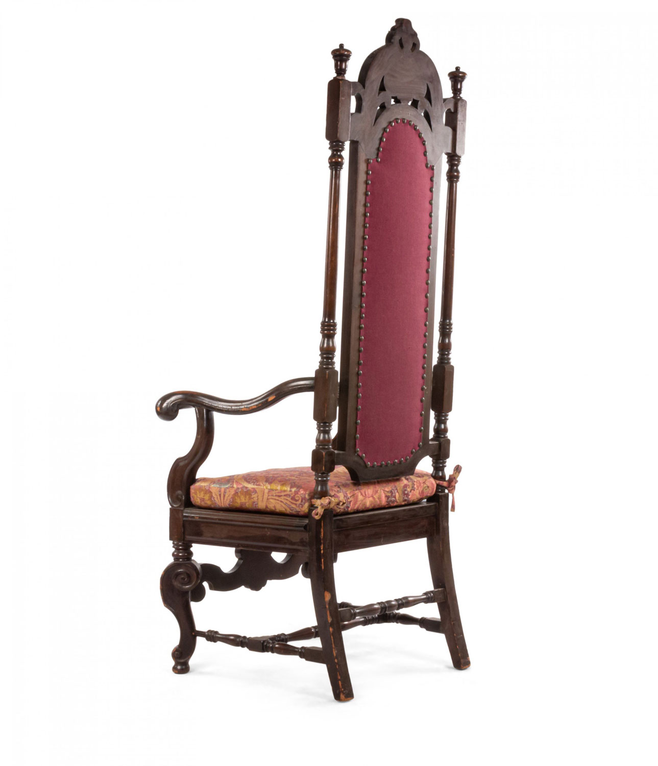 Style: English Materials & Techniques: Wood, walnut, arch, carved, crest Category: Seating, Office/Library, Dining Room Condition: Arms loose, antique condition.