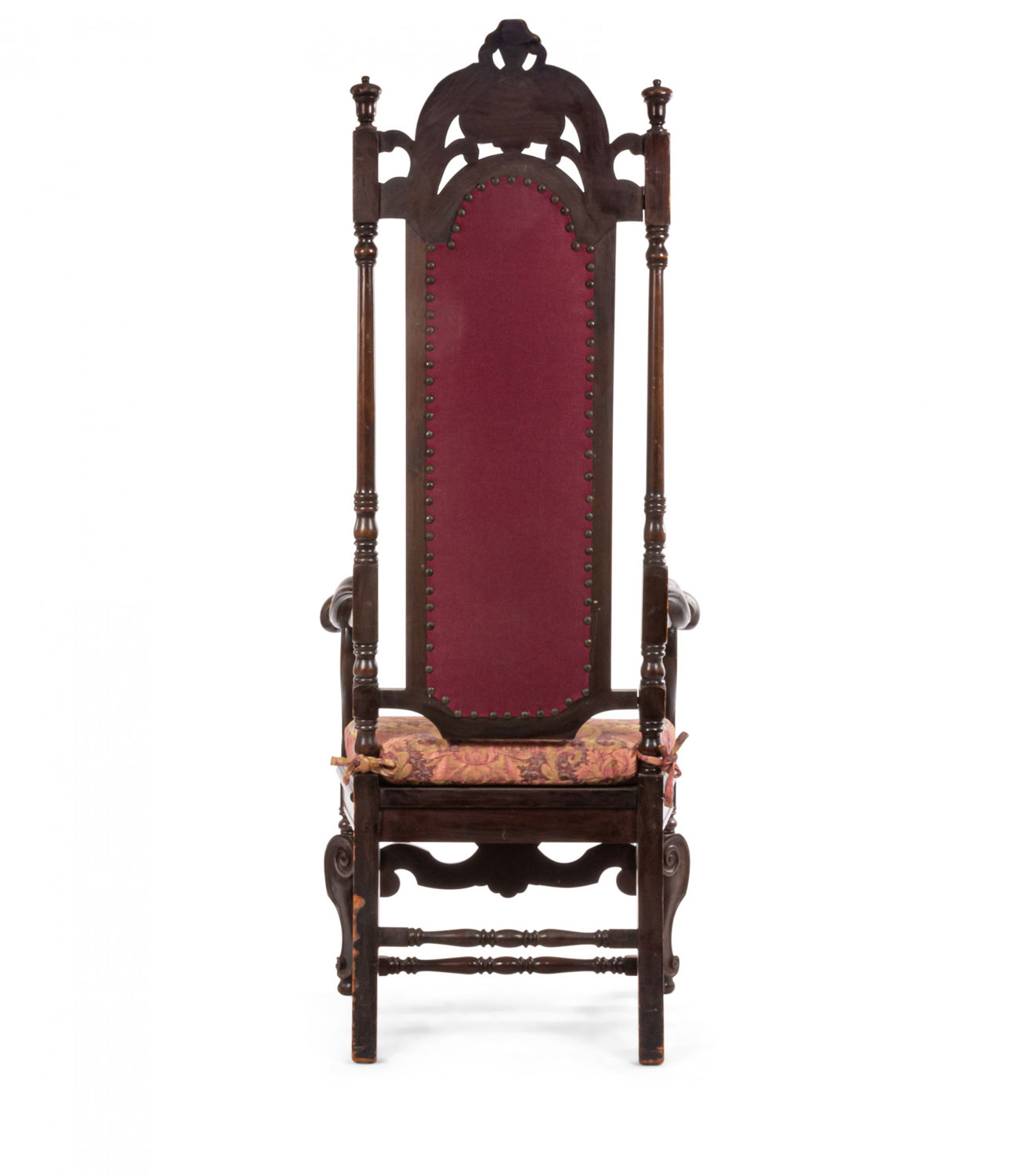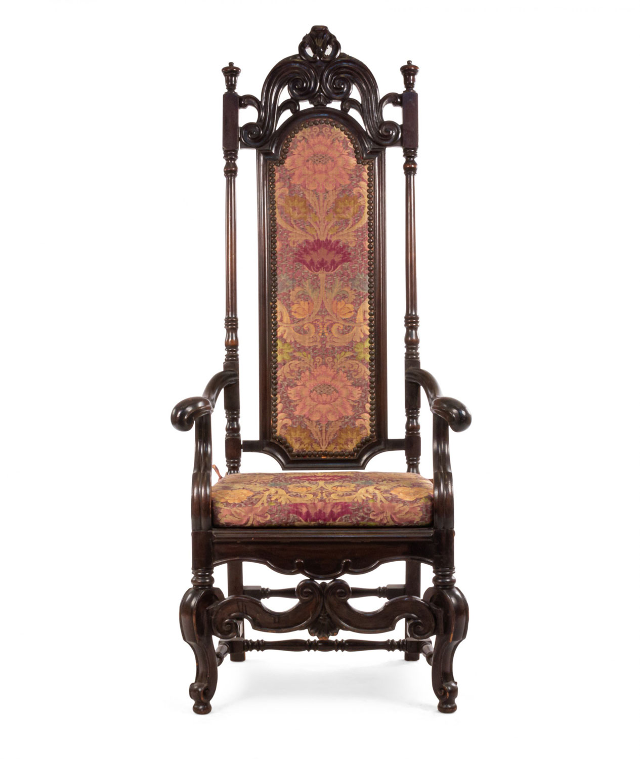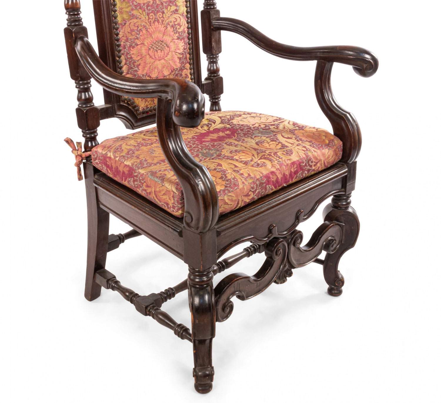 SET of 4 English James II-style (19th/20th Century) walnut high back armchairs with arched, carved crest rails and floral upholstered backs and seat cushions. (Label for Yeager/ Allentown PA) (PRICED AS SET)