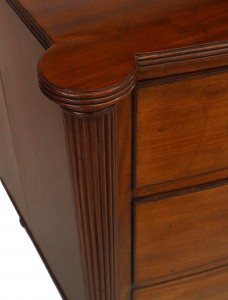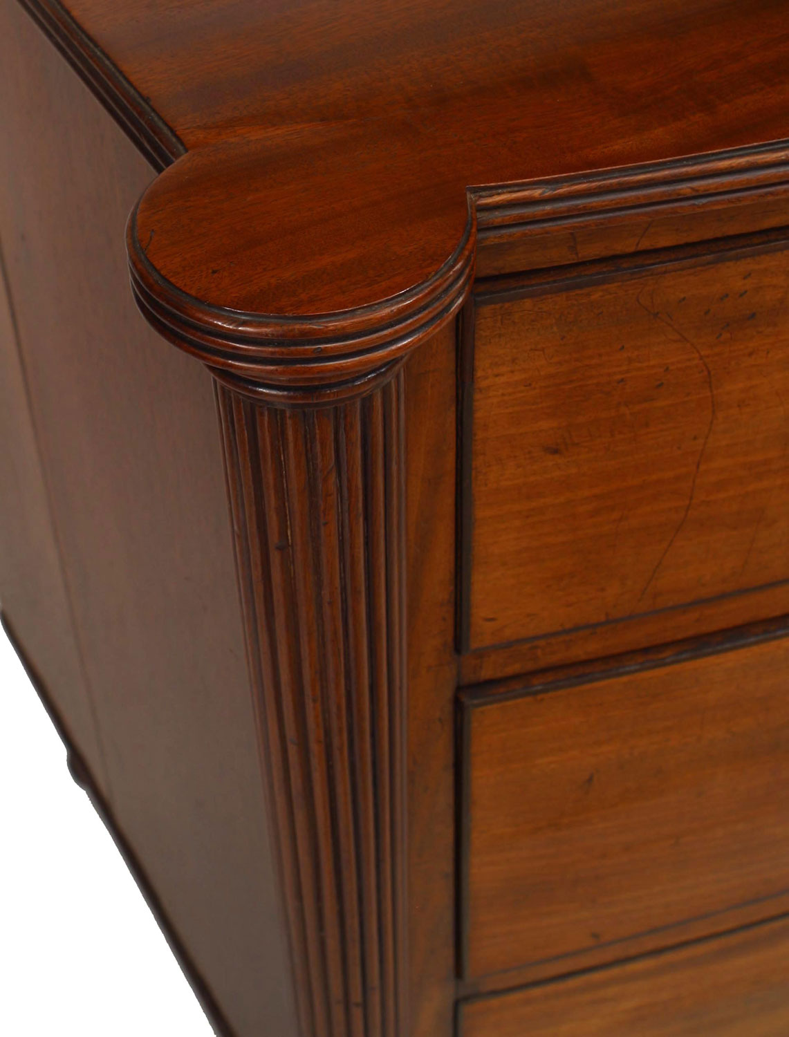 English Late George III (circa 1800) mahogany bow fronted chest of drawers with 3 long drawers with lion mask pulls & flanked by reeded outset angles.