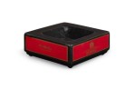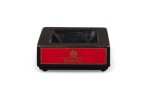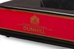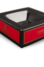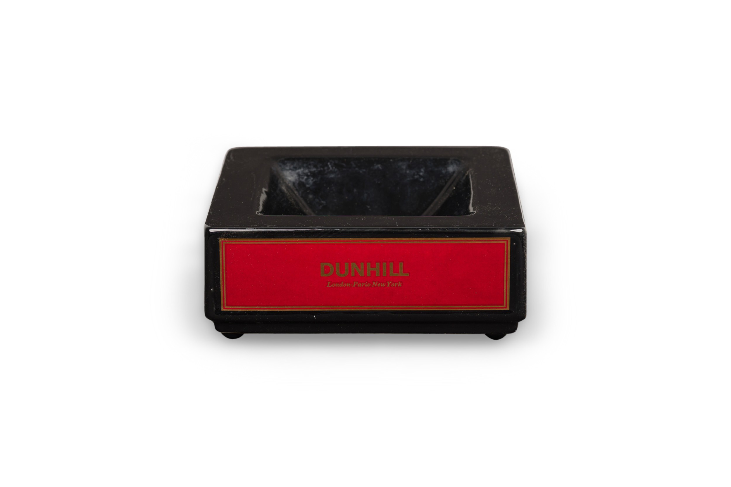 English Mid-Century squared black ceramic ashtray with the DUNHILL cigarette branding on all four sides in bold gold font against a red bacground.