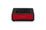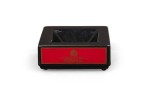 English Mid-Century squared black ceramic ashtray with the DUNHILL cigarette branding on all four sides in bold gold font against a red bacground