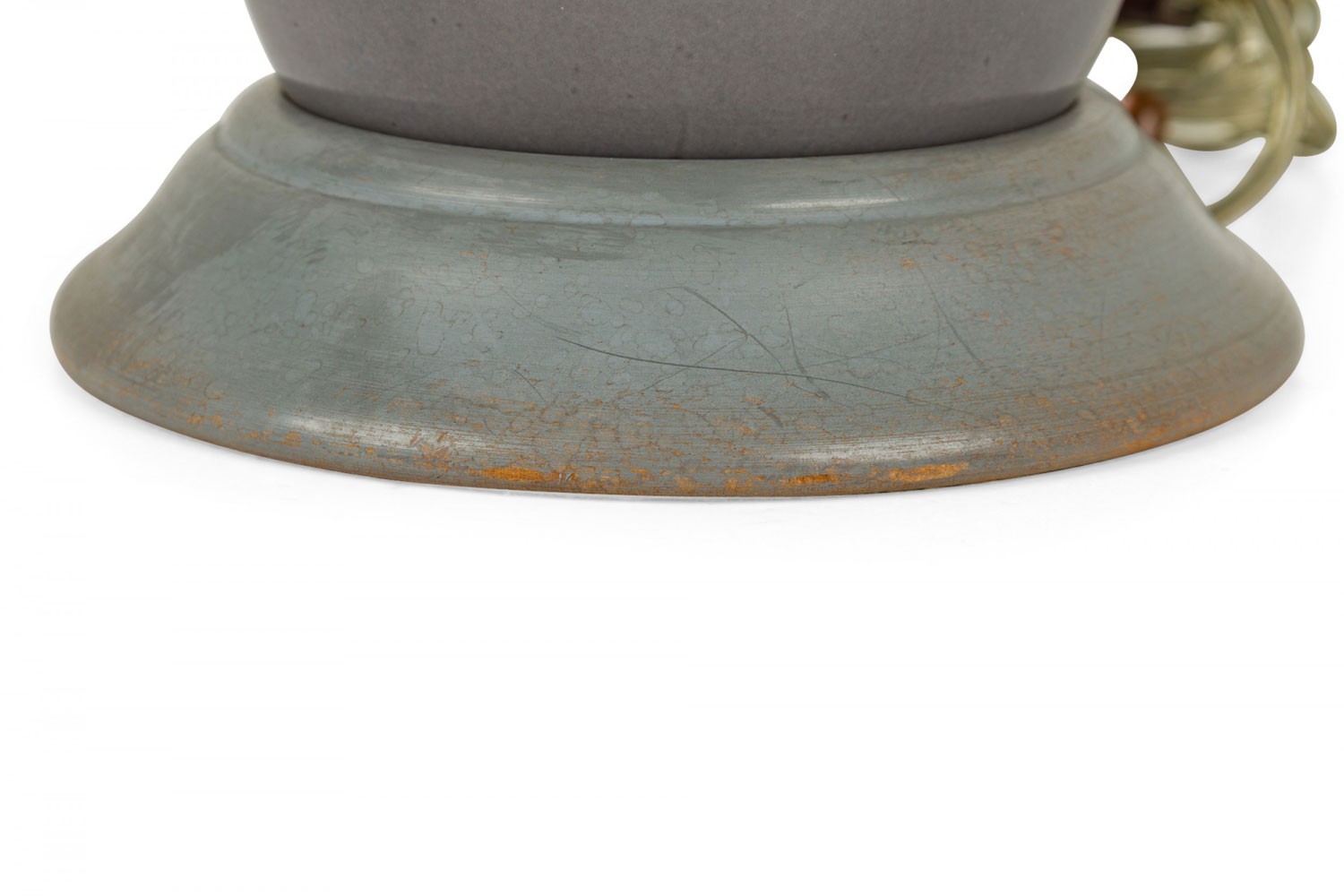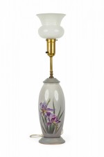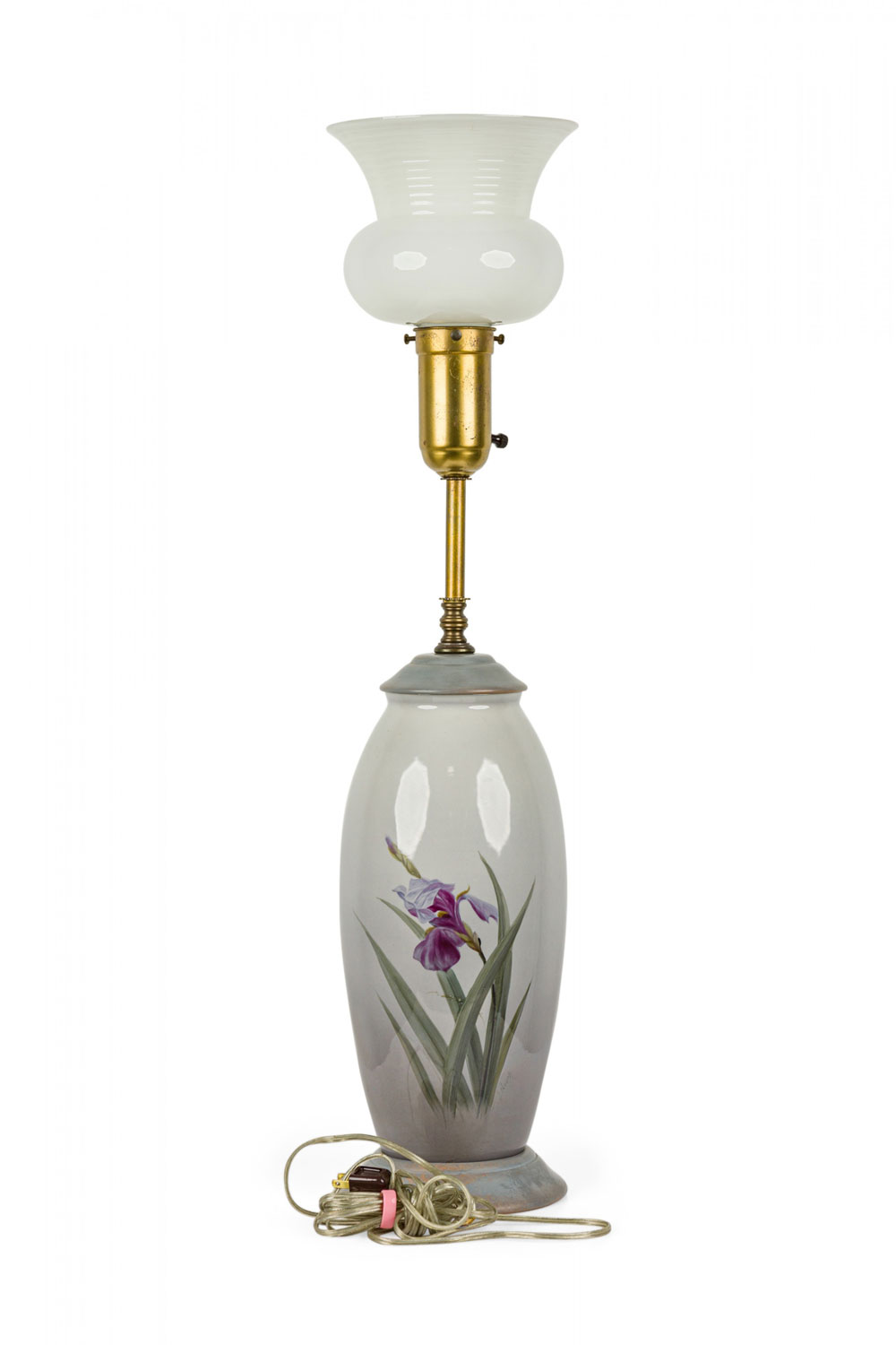 English Mid-Century table lamp with a tall vase-form body featuring a purple iris design against a variegated gray and white background, mounted with brass hardware and topped with a flared milk glass shade..