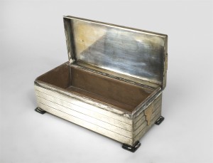 English Mid-Century (1940s) sterling silver rectangular (cigarette) box with fluted etched design and initials: A.M.G.