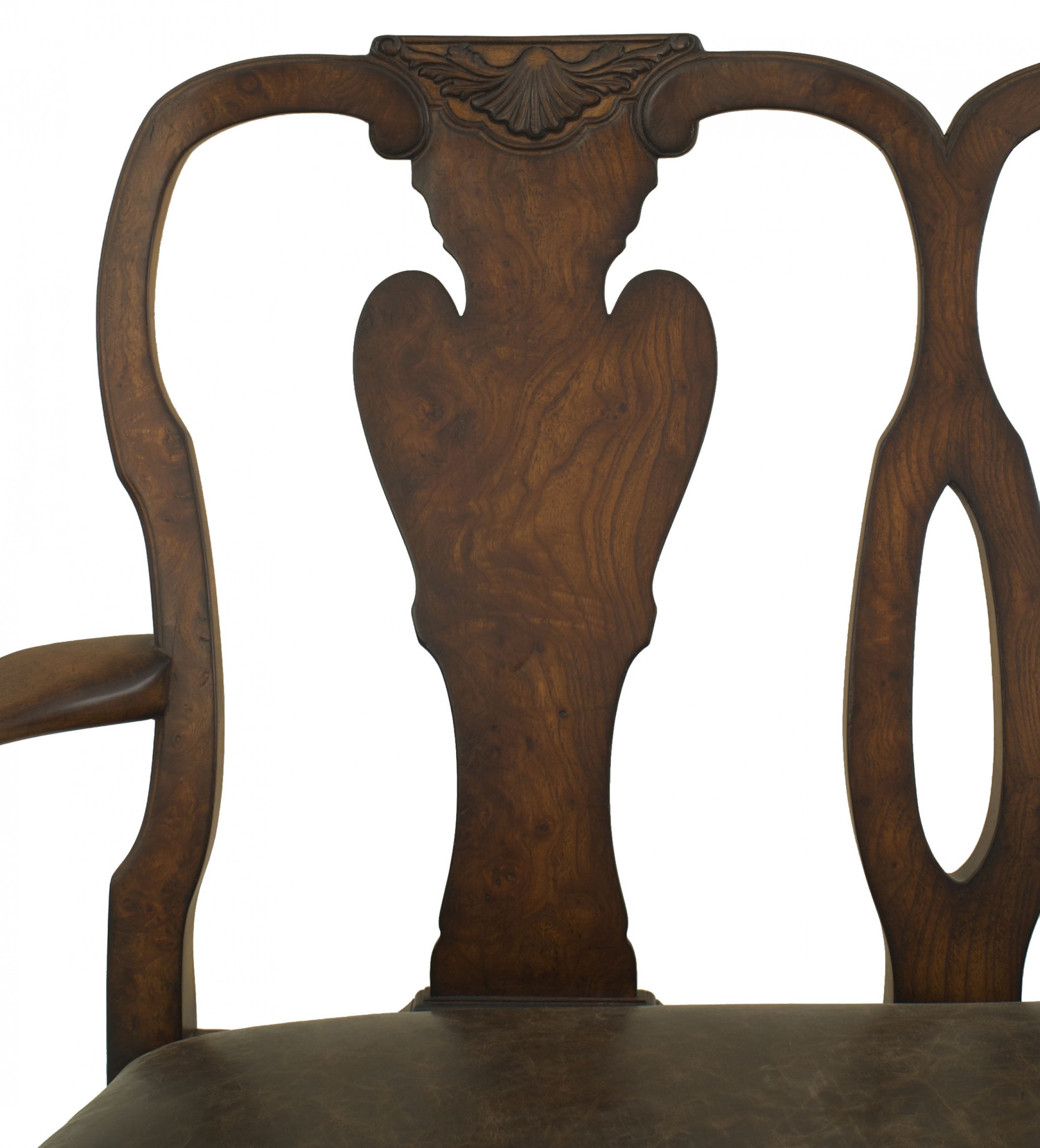 English Queen Anne style (20th Century) carved open arm loveseat with a carved crest on a double chair back and a slip seat upholstered in brown leather.