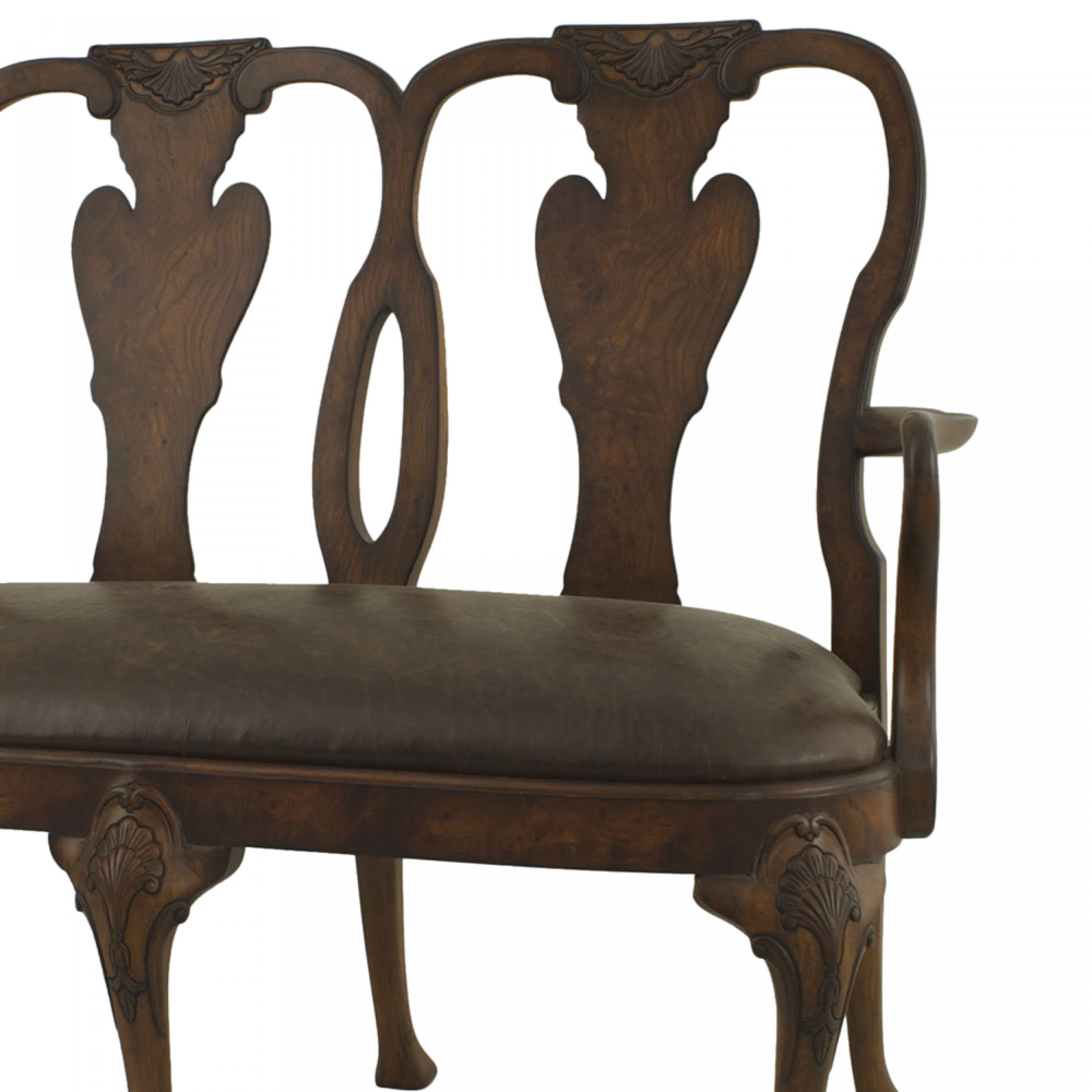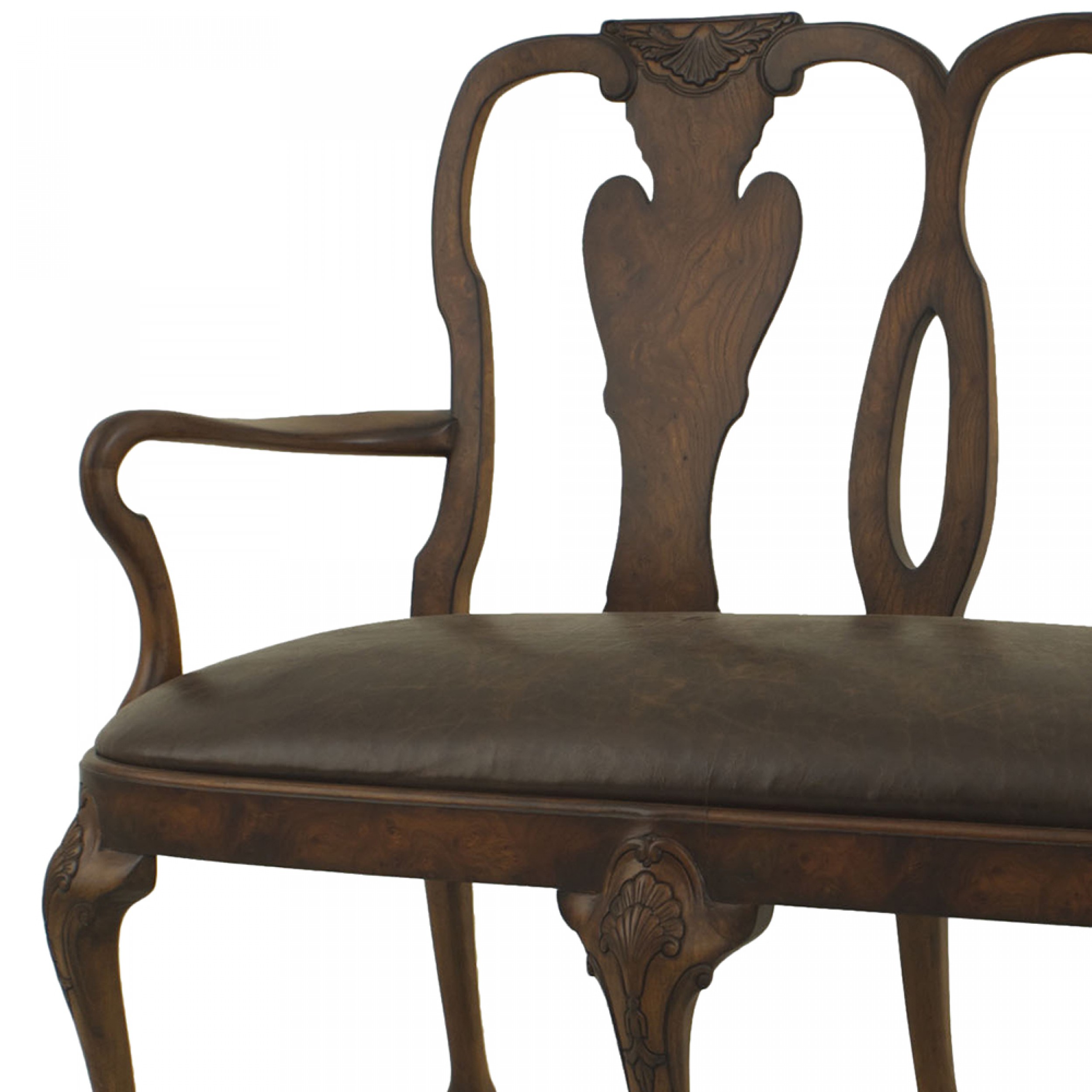 English Queen Anne style (20th Century) carved open arm loveseat with a carved crest on a double chair back and a slip seat upholstered in brown leather