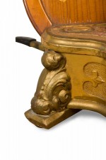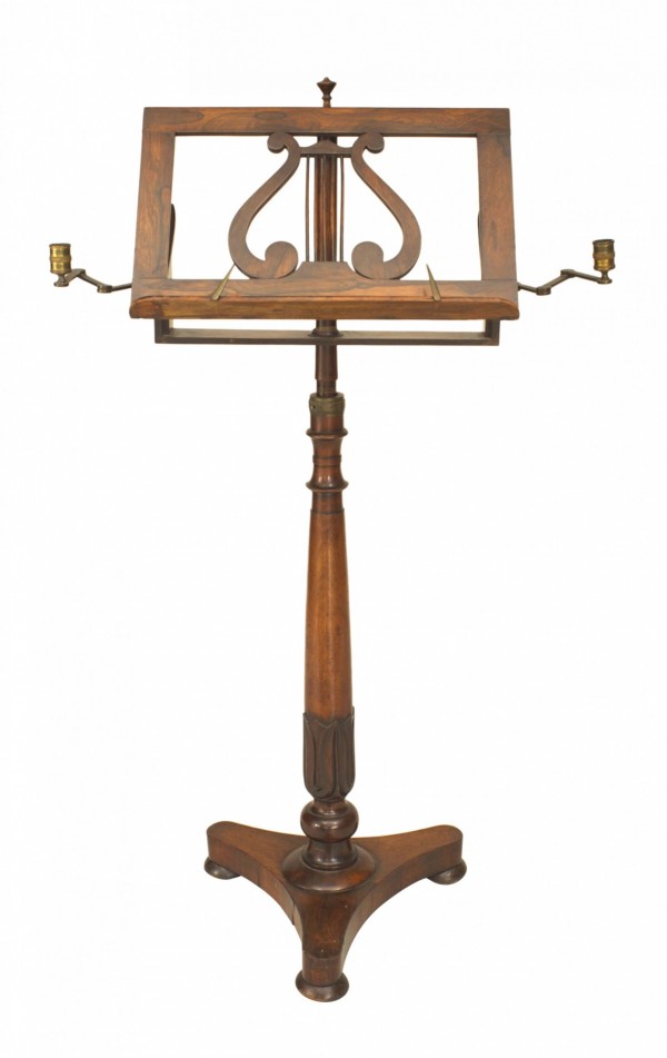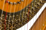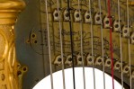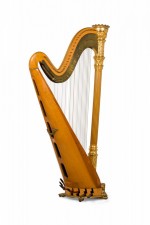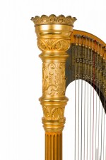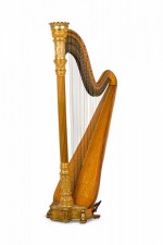 English Regency style (19th Century) satinwood and gilt trim harp having brass forty-six string, double action 7-pedal function with fluted columnar support surmounted by a crown finial, over a symmetric scroll & foliate design.