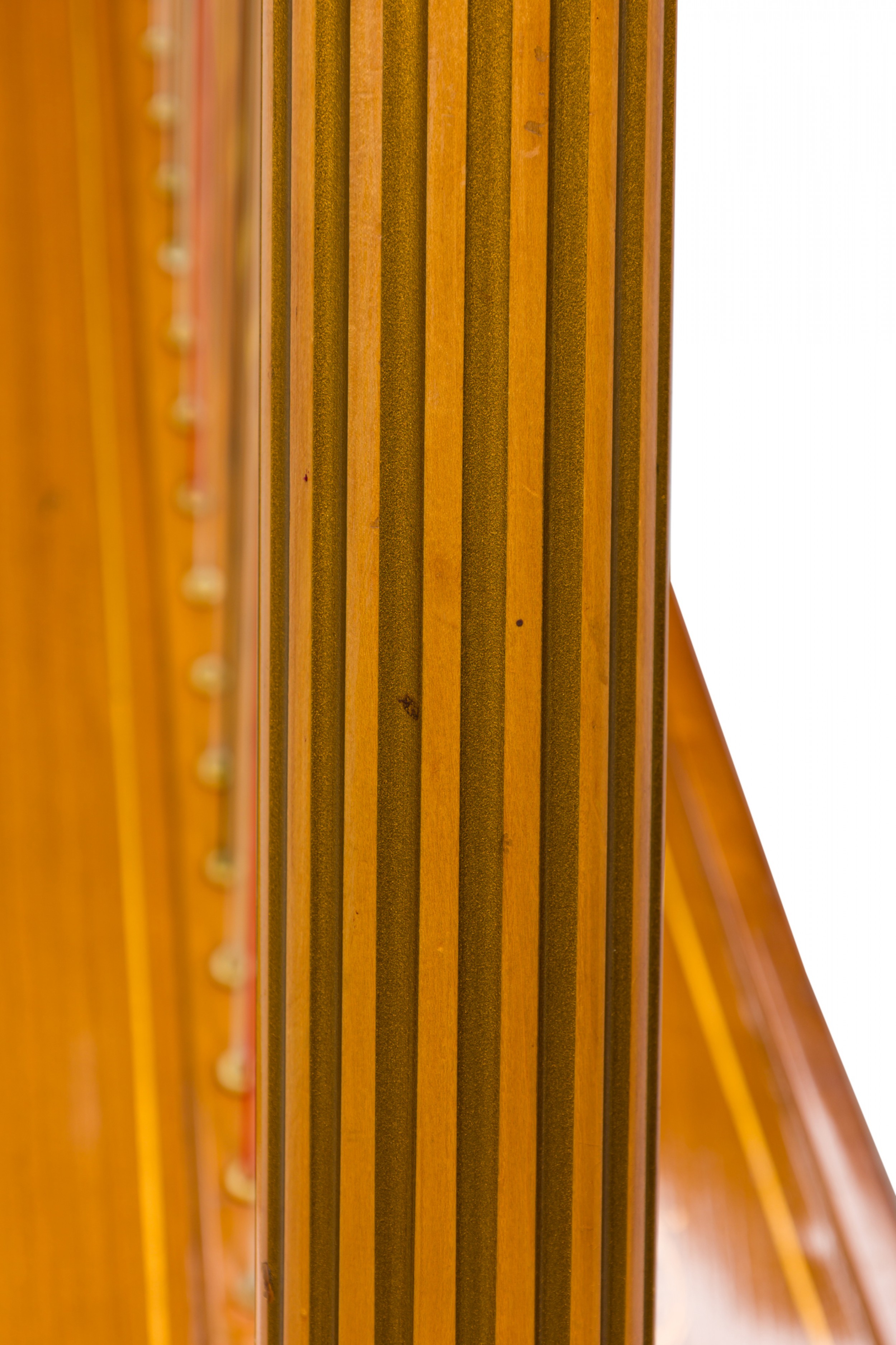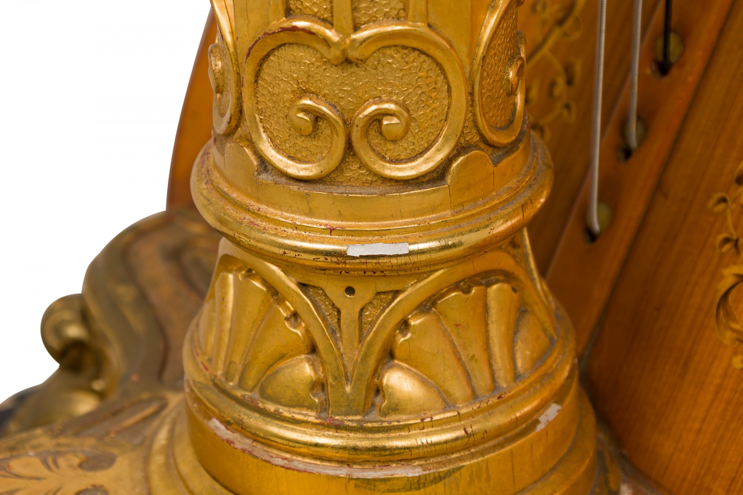 English Regency style (19th Century) satinwood and gilt trim harp having brass forty-six string, double action 7-pedal function with fluted columnar support surmounted by a crown finial, over a symmetric scroll & foliate design