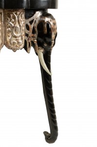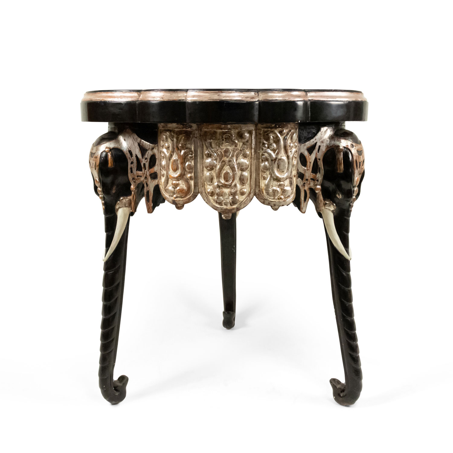 English Regency (Anglo-Indian) (Mid-19th Century) style black lacquered and parcel silver gilt carved and trimmed side table with scallop design edged top on 3 elephant mask legs.