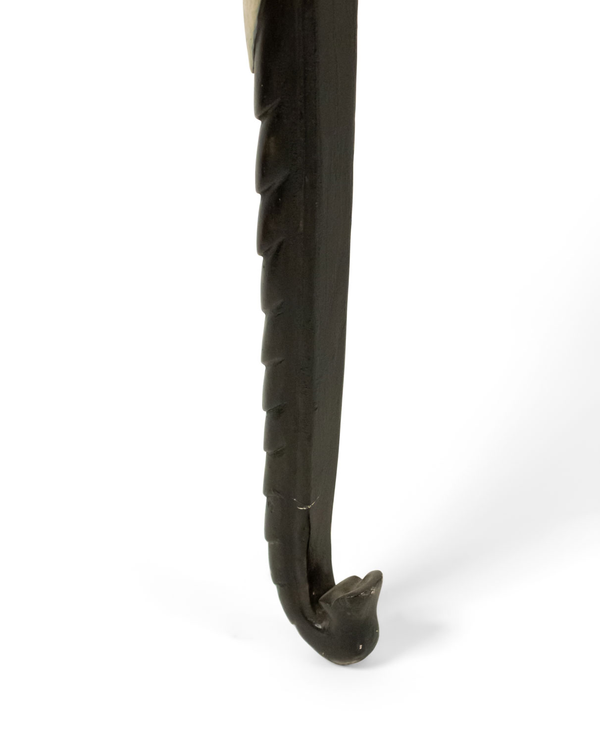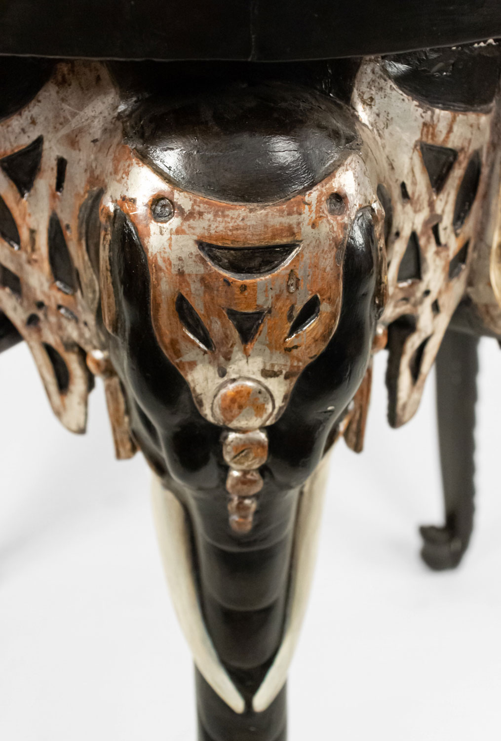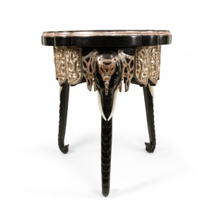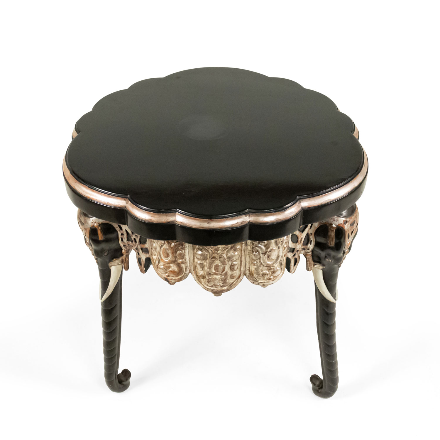English Regency (Anglo-Indian) (Mid-19th Century) style black lacquered and parcel silver gilt carved and trimmed side table with scallop design edged top on 3 elephant mask legs..