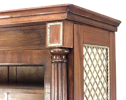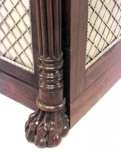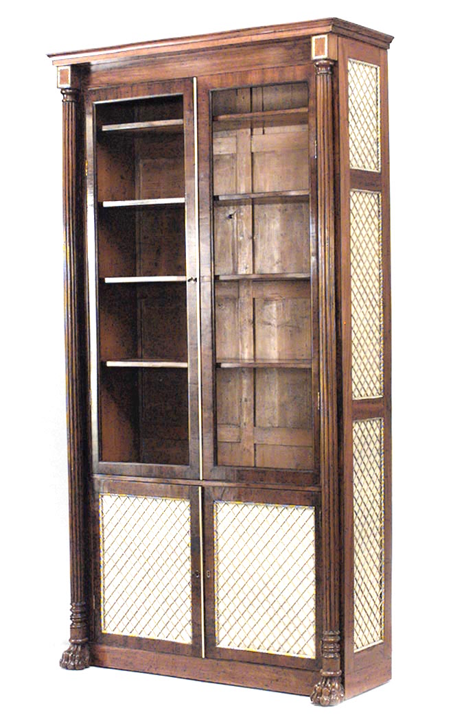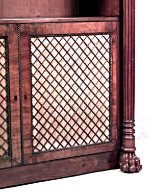 English Regency (Early 19th Century) mahogany bookcase with reeded columnar angles flanking glazed doors over green silk lined brass grilled doors on lions paw feet. (Manner of Gillows).
