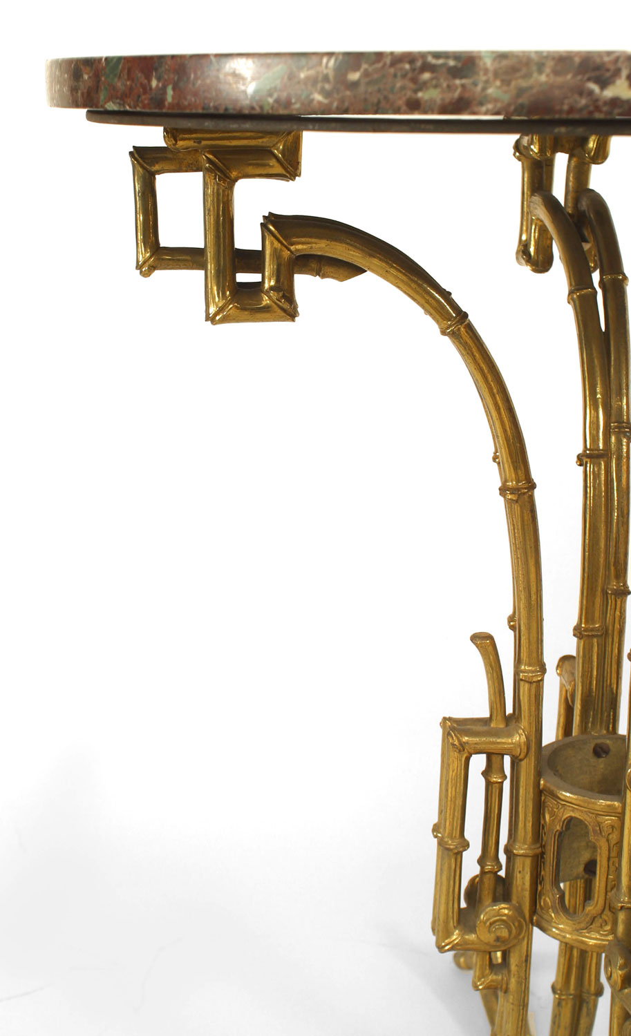 English Regency-style (19/20th Century) brass end table with faux bamboo base supporting a round rouge marble top.