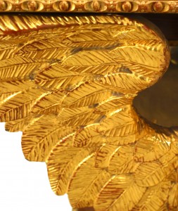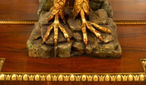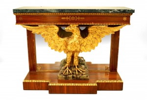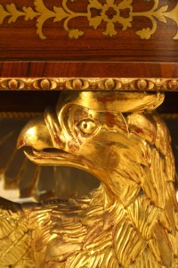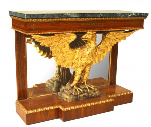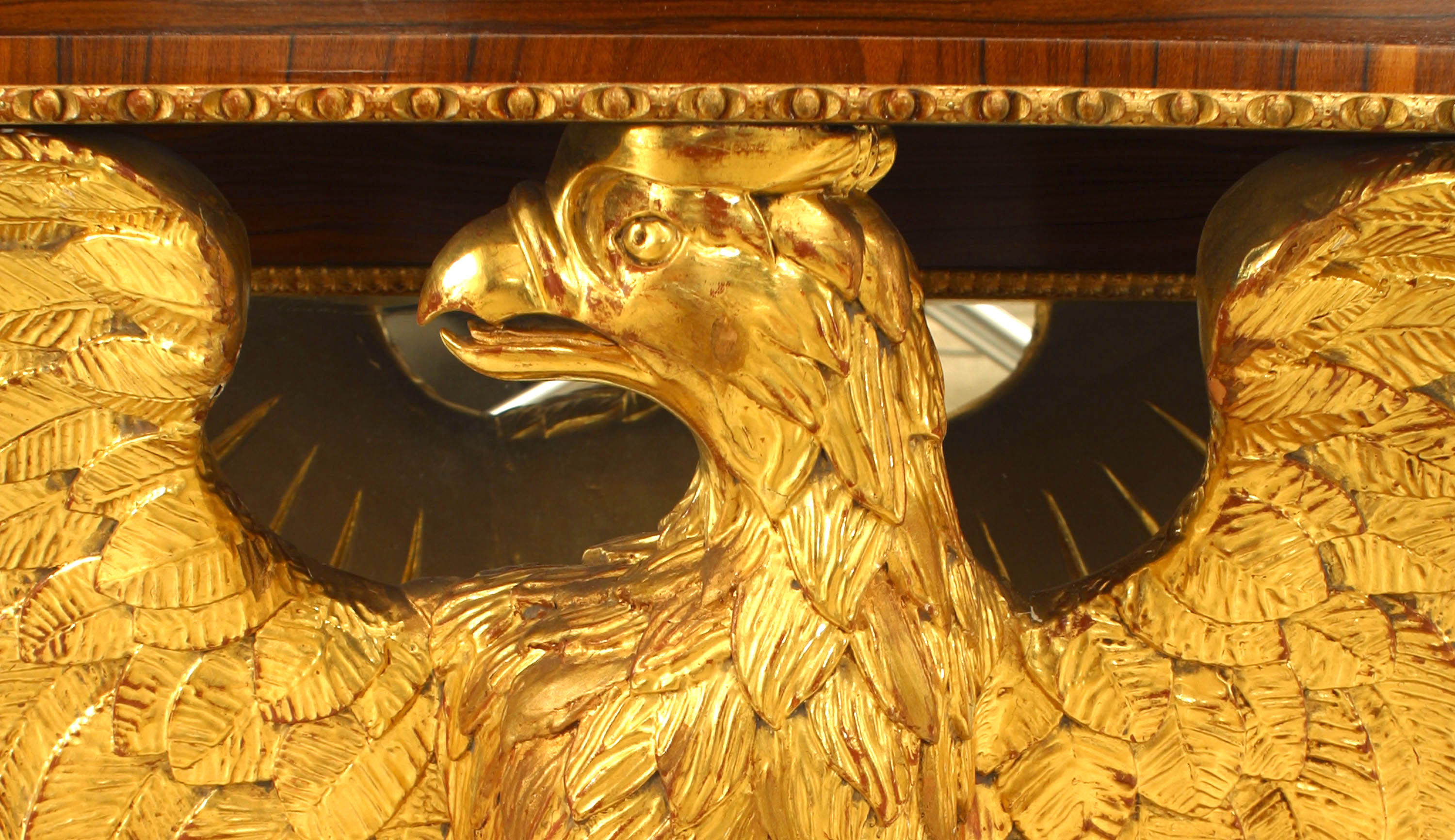PAIR of English Regency-style (20th Century) brass inlaid rosewood console tables with green marble tops above eagle supporters & mirrored backs (Eagles face left and right) (PRICED AS PAIR)