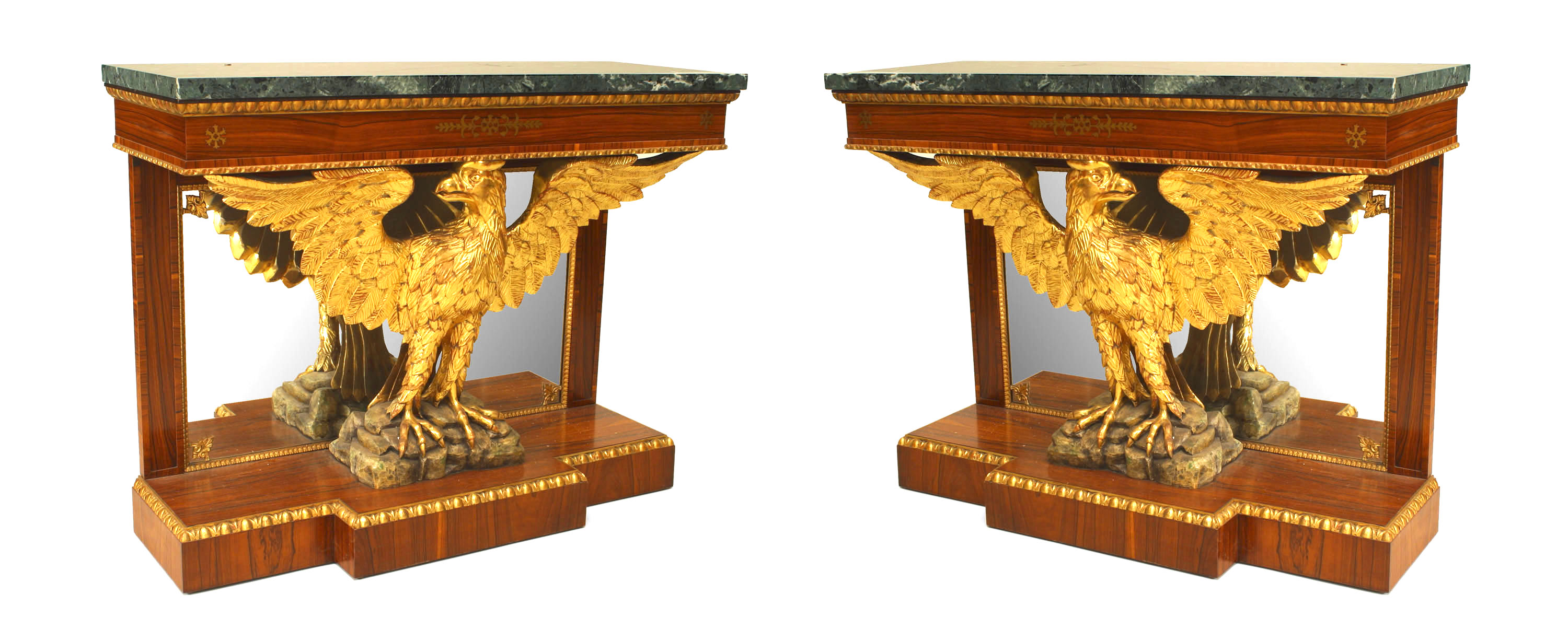 PAIR of English Regency-style (20th Century) brass inlaid rosewood console tables with green marble tops above eagle supporters & mirrored backs (Eagles face left and right) (PRICED AS PAIR).
