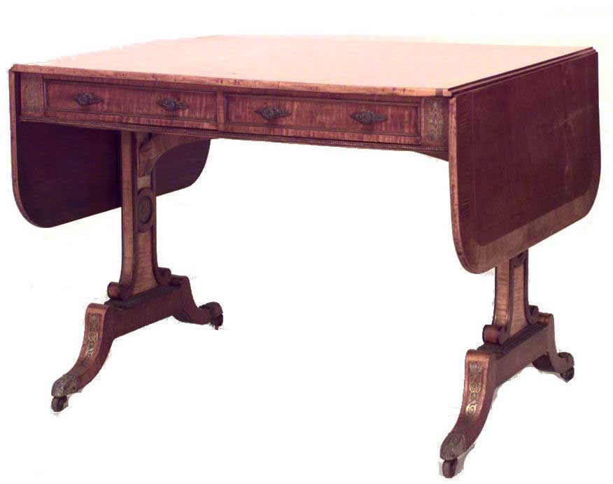 English Regency (c. 1815) brass inlaid & mounted satinwood sofa table with tulipwood cross-banded top above 2 frieze drawers on trestle legs with brass caps & casters.