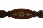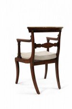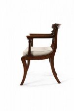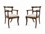 PAIR of English Regency (1st quarter 19th Century) mahogany armchairs with floral brass inlay pattern, carved details, cane seats, and removable beige tufted upholstered seat cushions. (PRICED AS PAIR)
