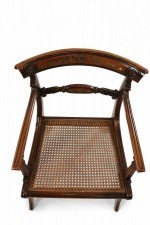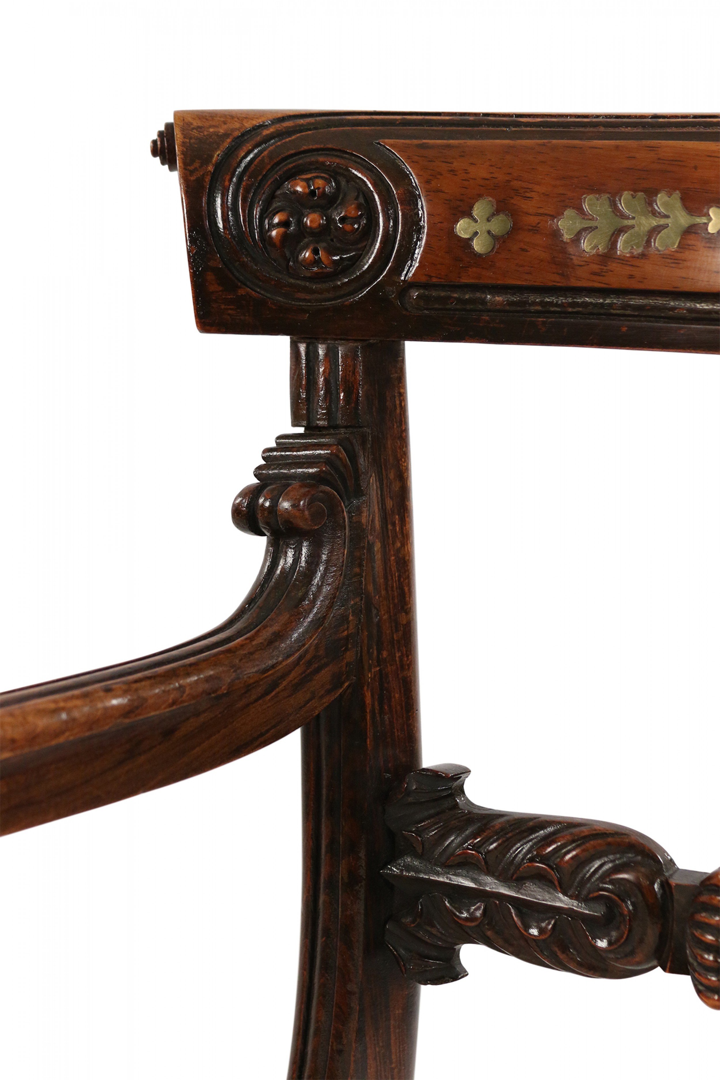 Pair of English Regency Brass Inlaid Oak and Cane Armchairs