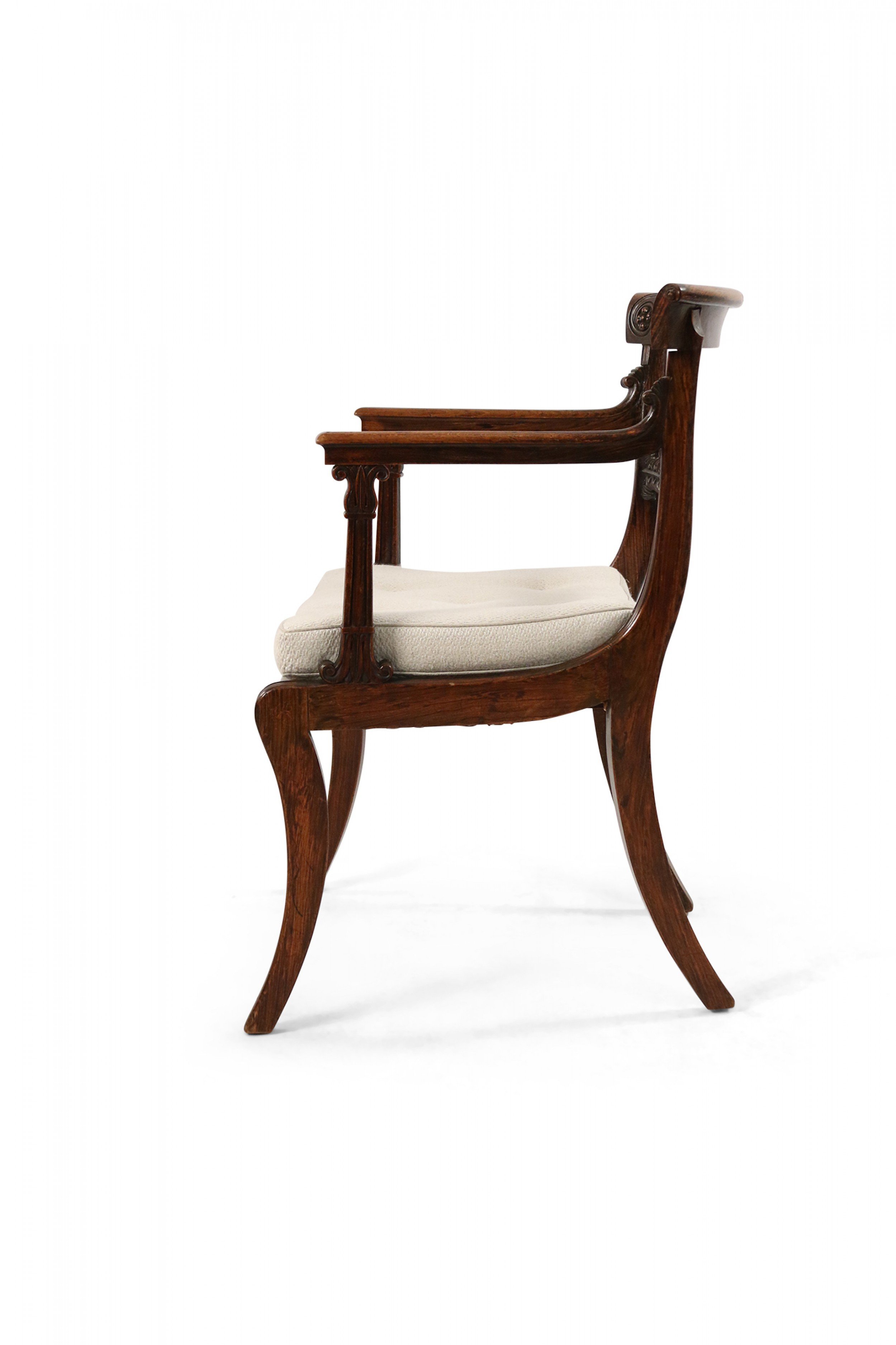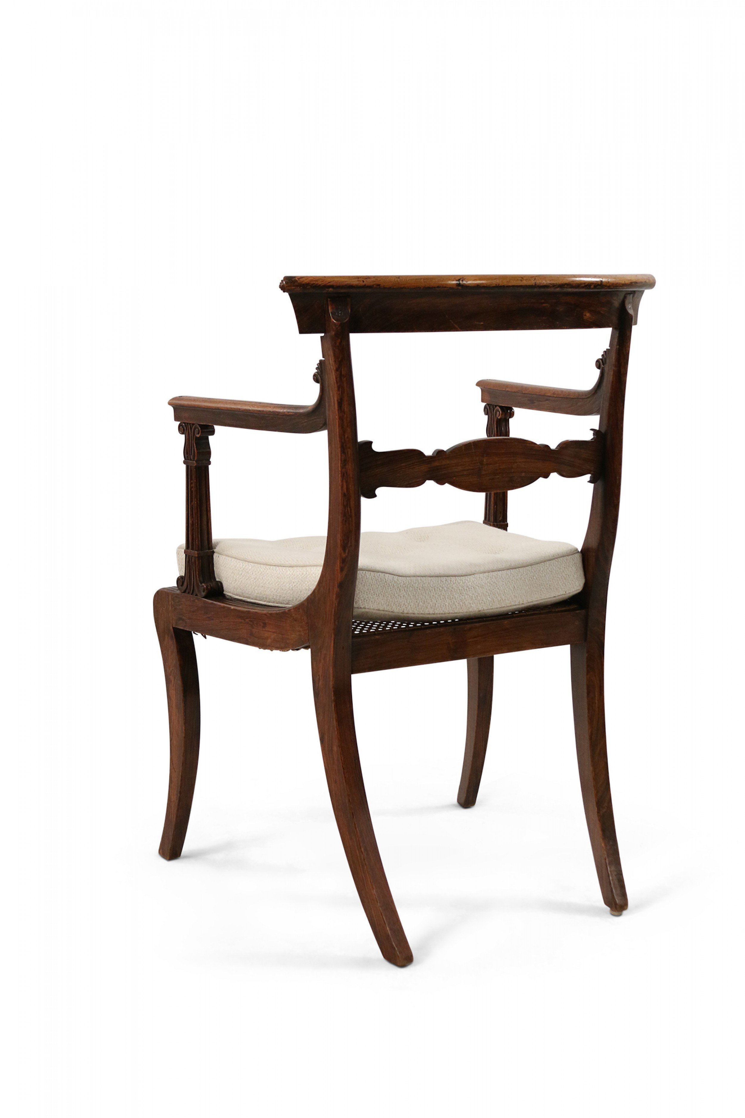 PAIR of English Regency (1st quarter 19th Century) mahogany armchairs with floral brass inlay pattern, carved details, cane seats, and removable beige tufted upholstered seat cushions. (PRICED AS PAIR).