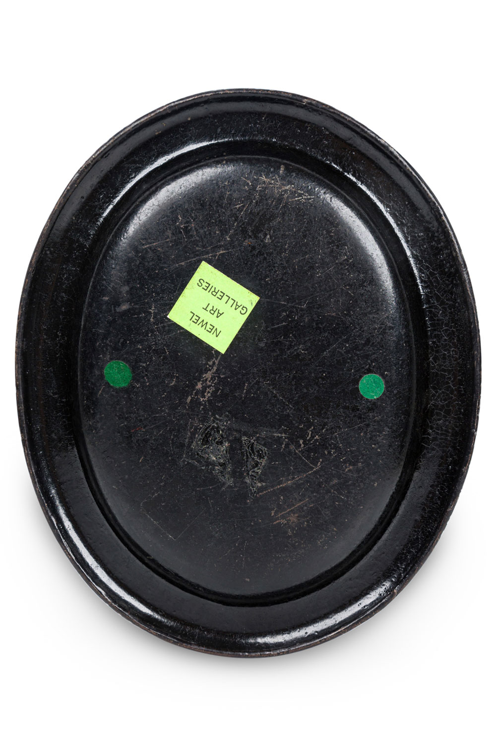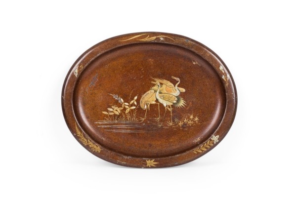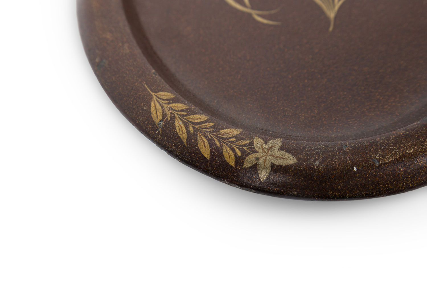 English Regency-style (19/20th Century) oval brown lacquered tray with heron and floral design.