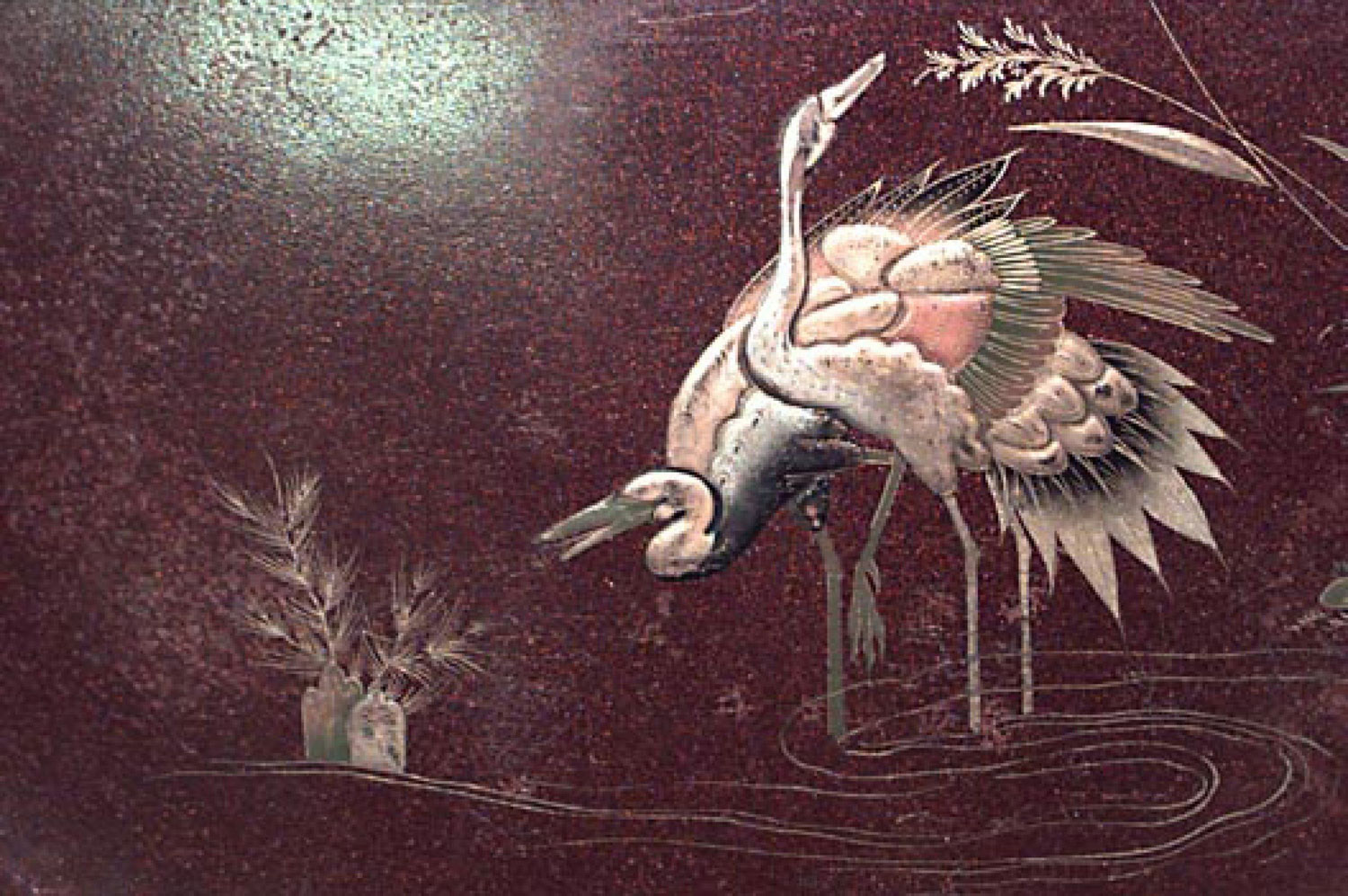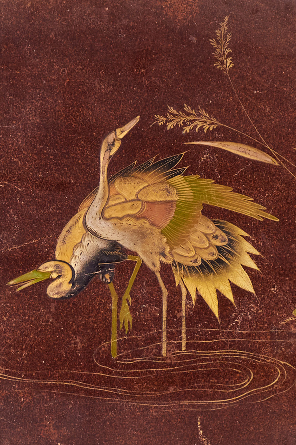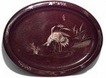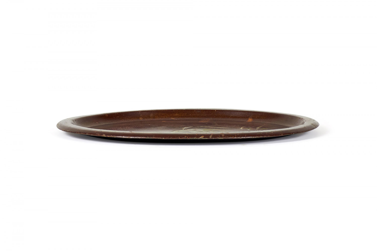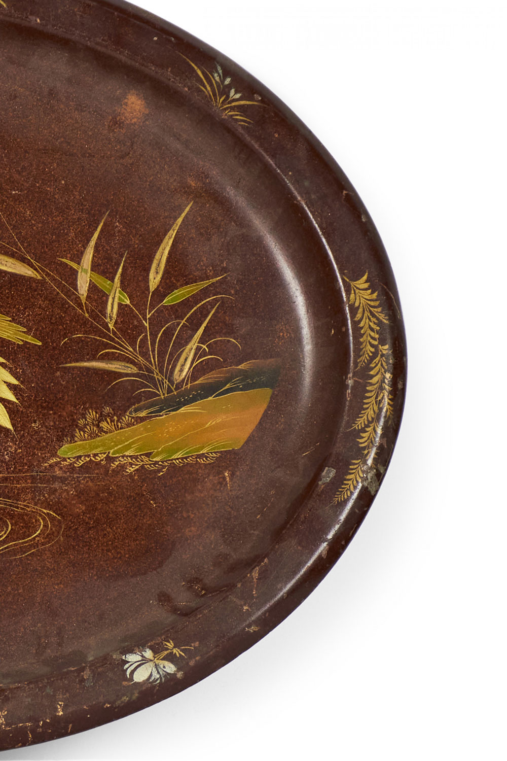 English Regency-style oval brown lacquered tray with heron and floral design.