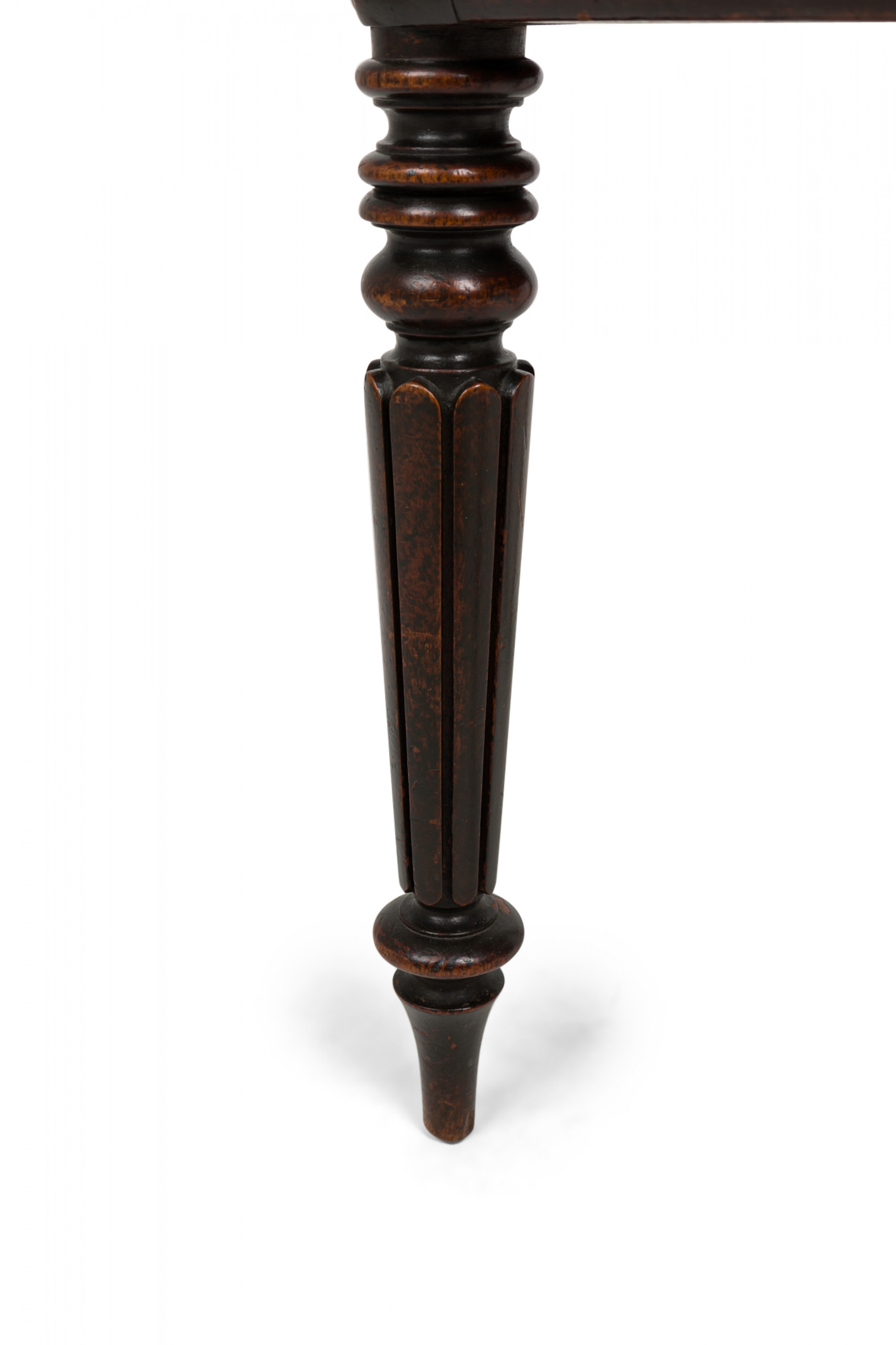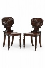 PAIR of English Regency (early 19th Century) mahogany hall / side chairs with an octagonal back upper section displaying a handcarved radiating cartouche anchored by a scrolled concave bottom, with rounded trapezoidal seat with inset borders, standing on turned legs. (PRICED AS PAIR).