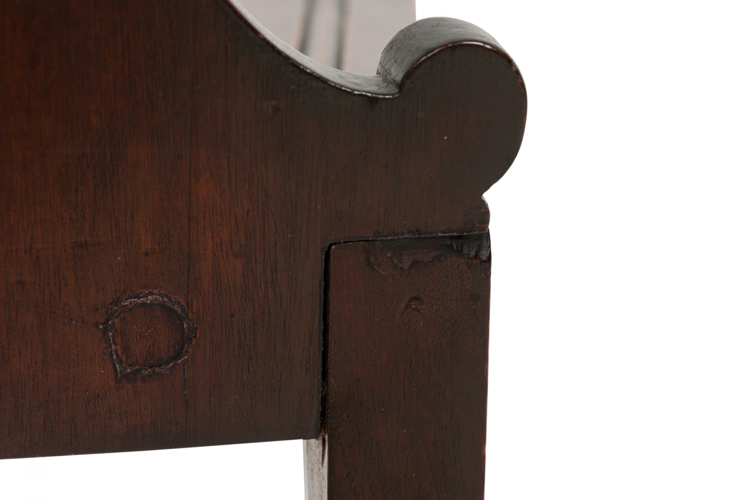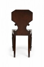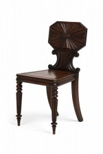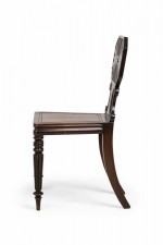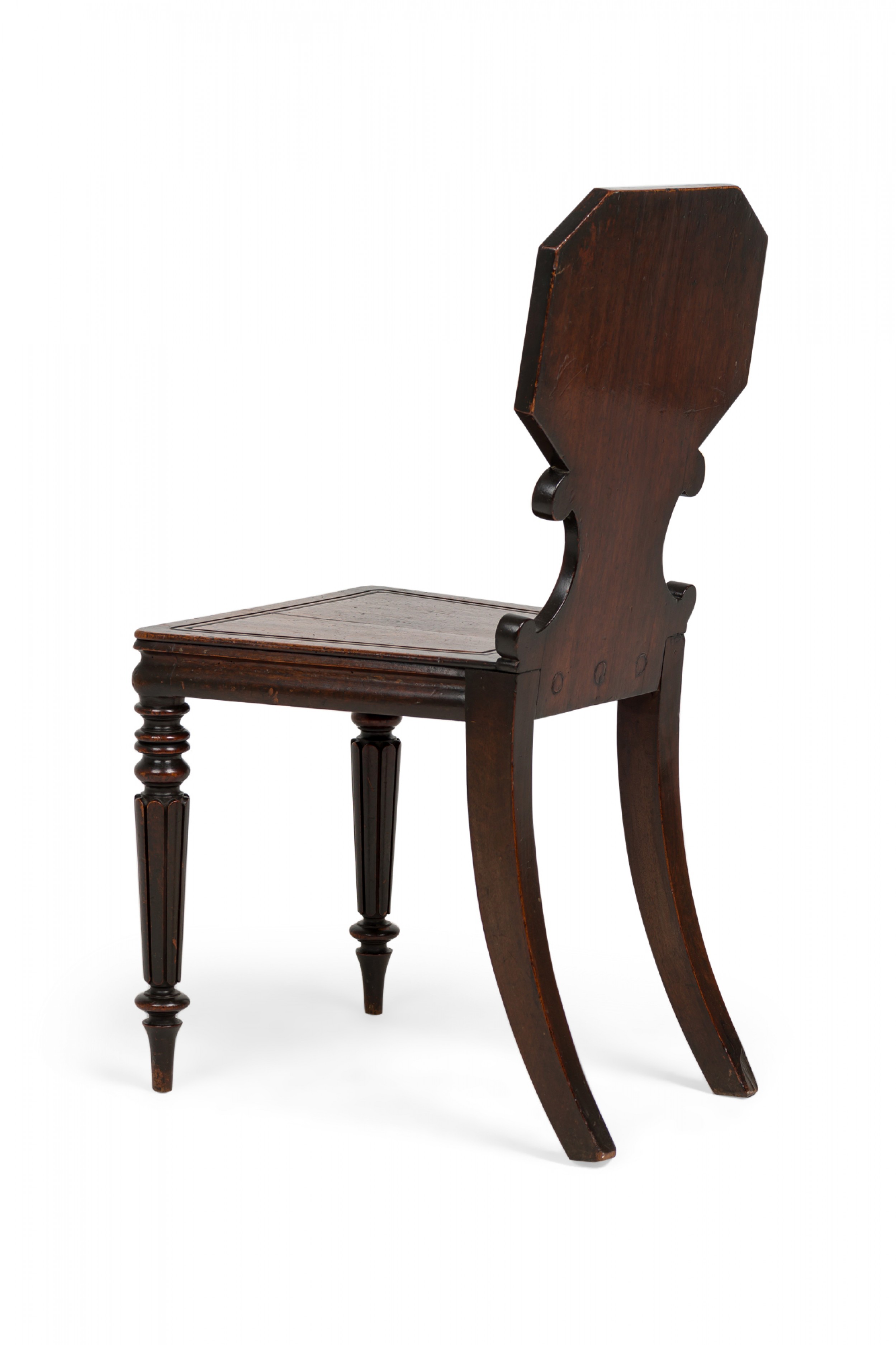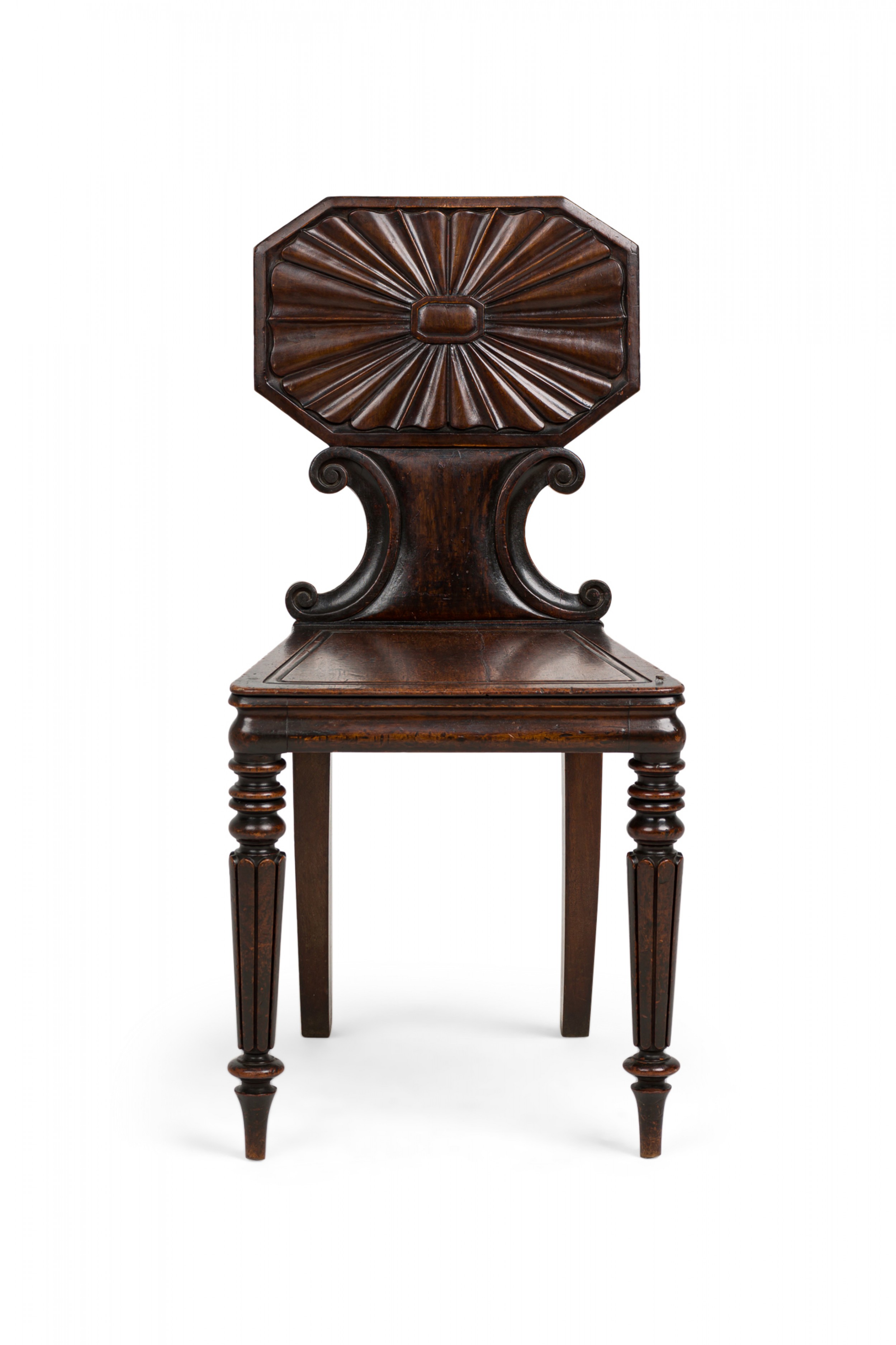 PAIR of English Regency (early 19th Century) mahogany hall / side chairs with an octagonal back upper section displaying a handcarved radiating cartouche anchored by a scrolled concave bottom, with rounded trapezoidal seat with inset borders, standing on turned legs. (PRICED AS PAIR)