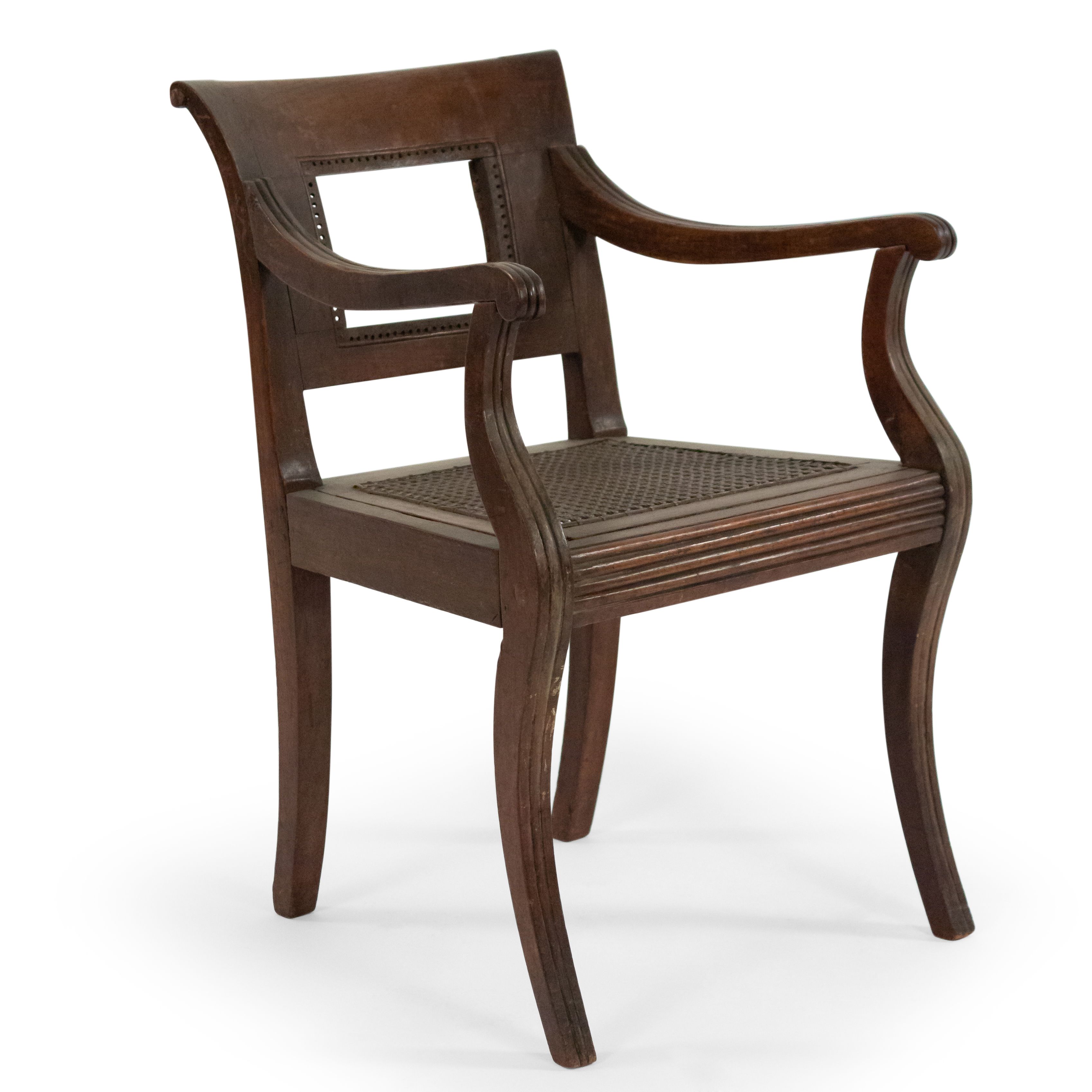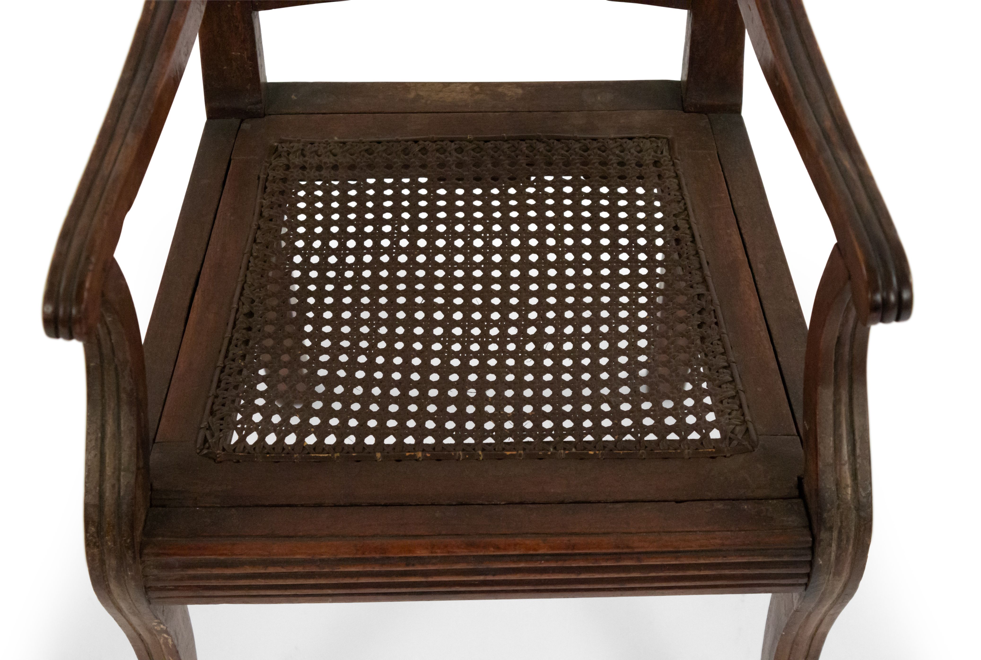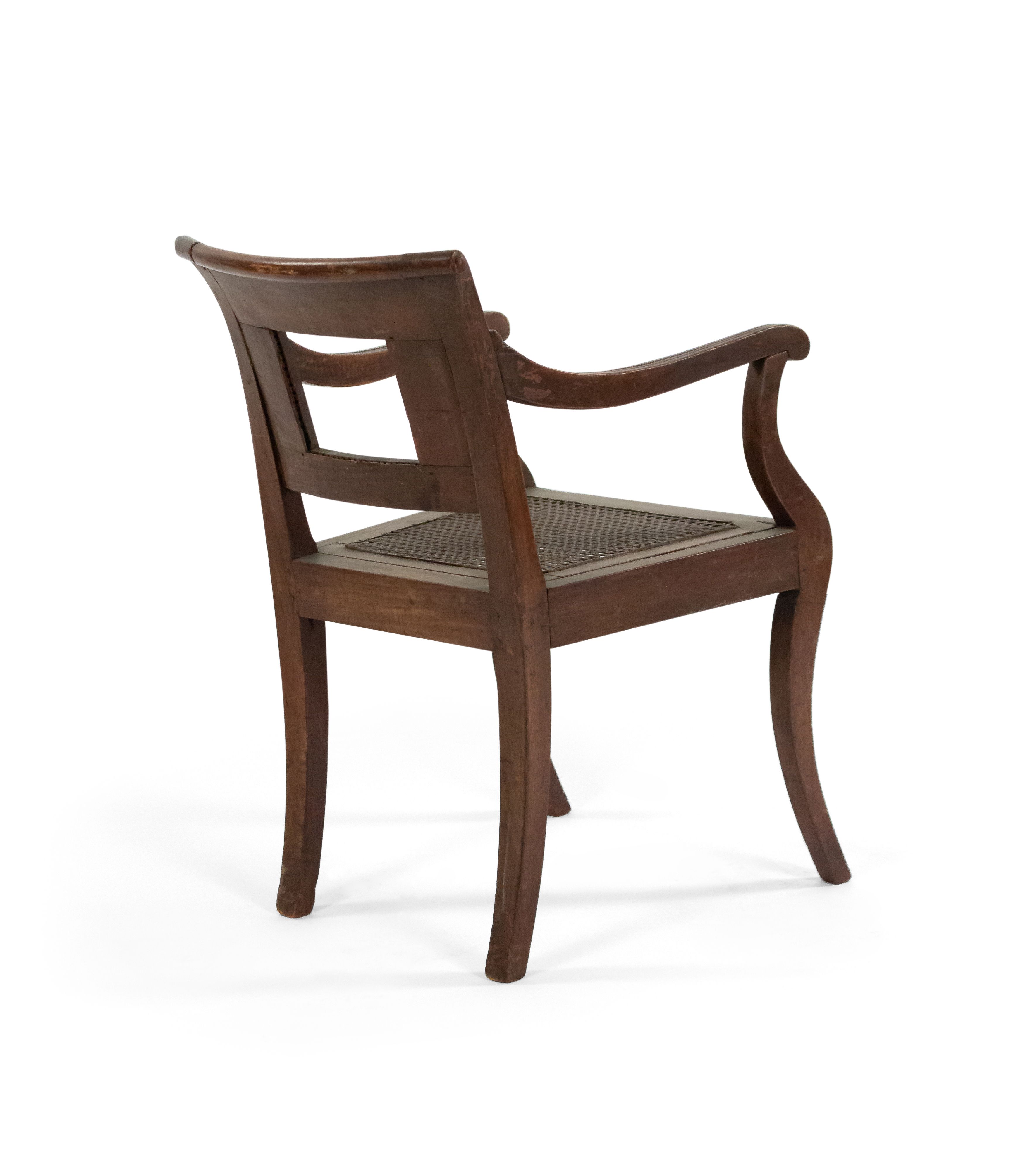 English Regency (c. 1820) child size mahogany open arm chair with caned seat and back.