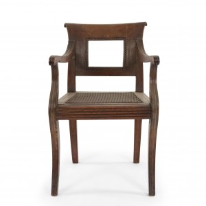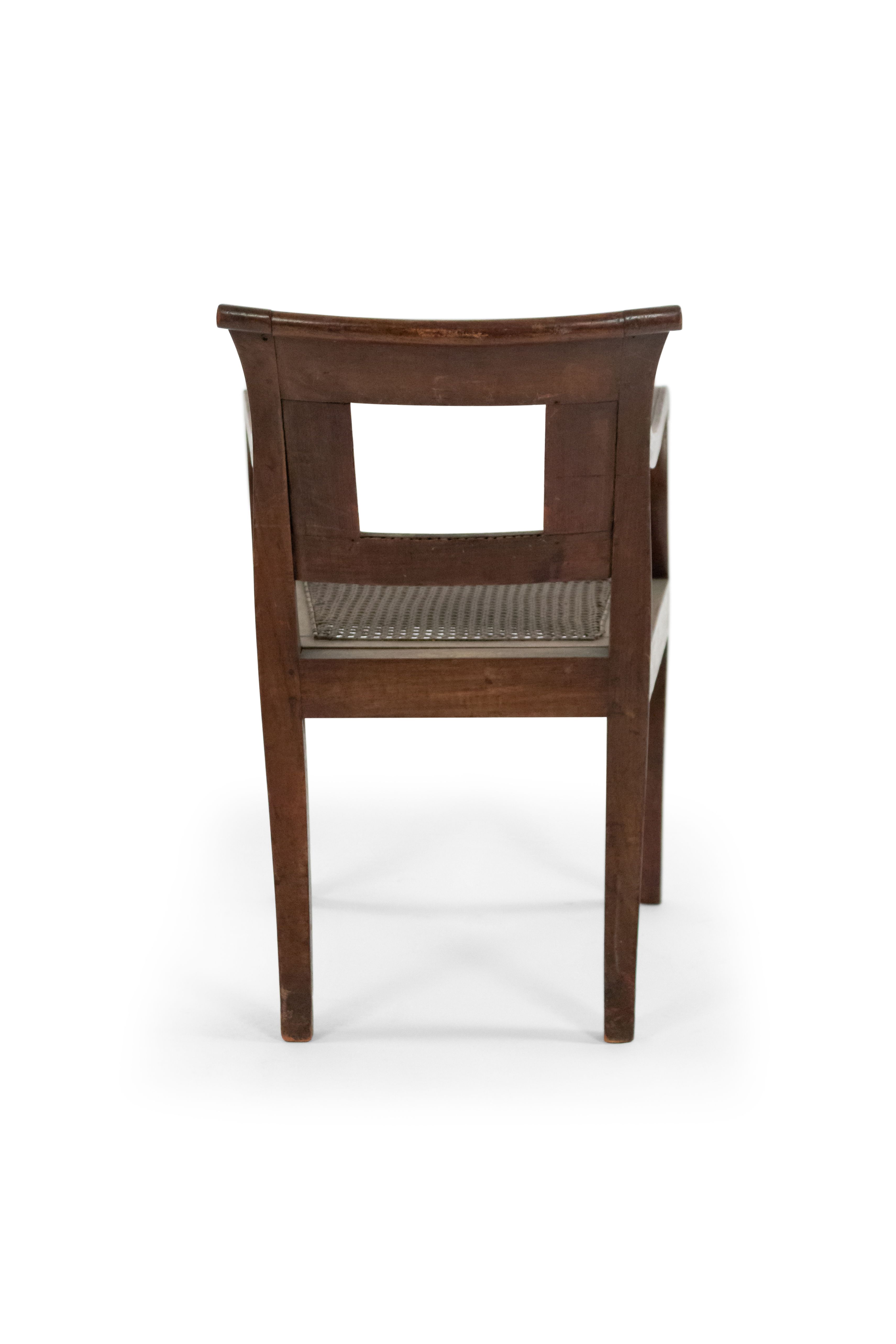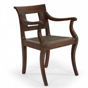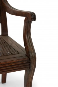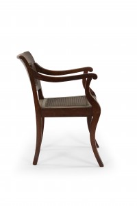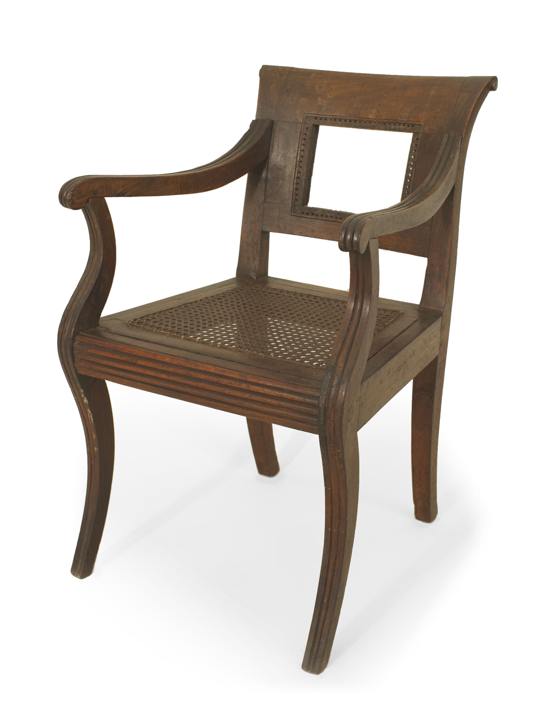 English Regency (c. 1820) child size mahogany open arm chair with caned seat and back.