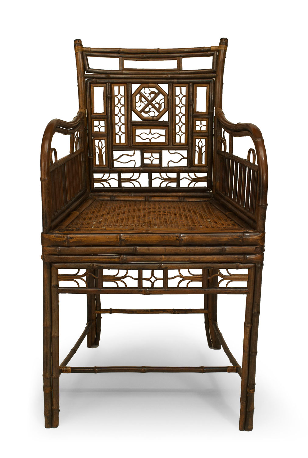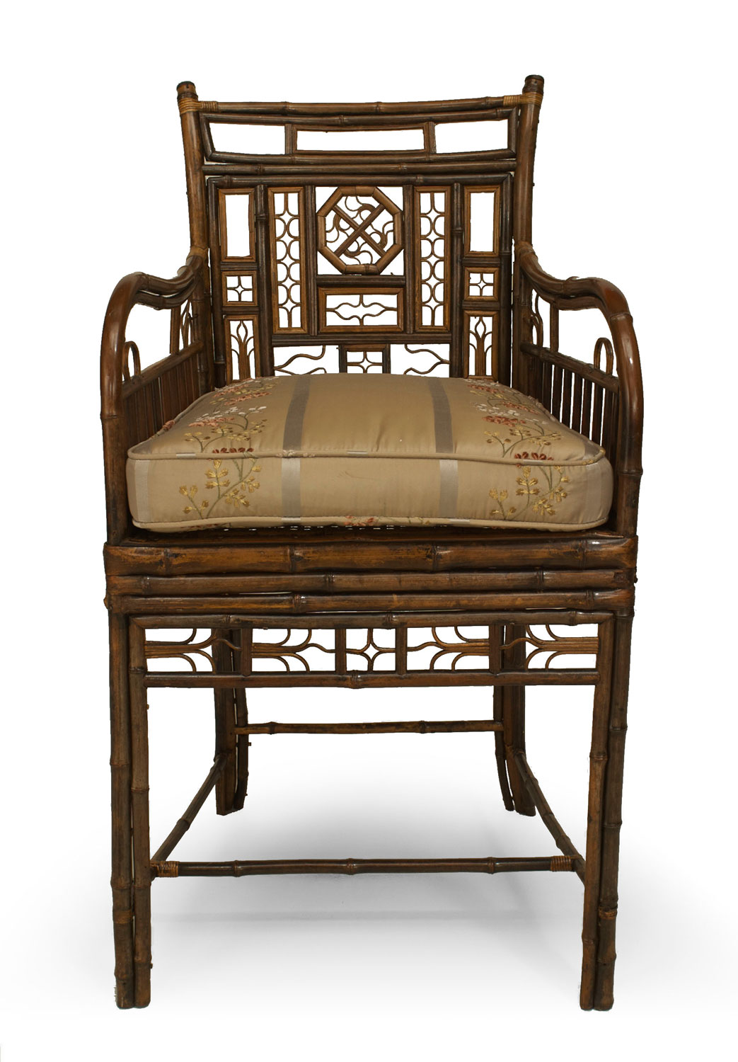 English Regency Brighton design bamboo arm chair with filigree design and a cane seat under a cushion with a stretcher (AS IS-filigree modified) (similar to Inv. #036706).