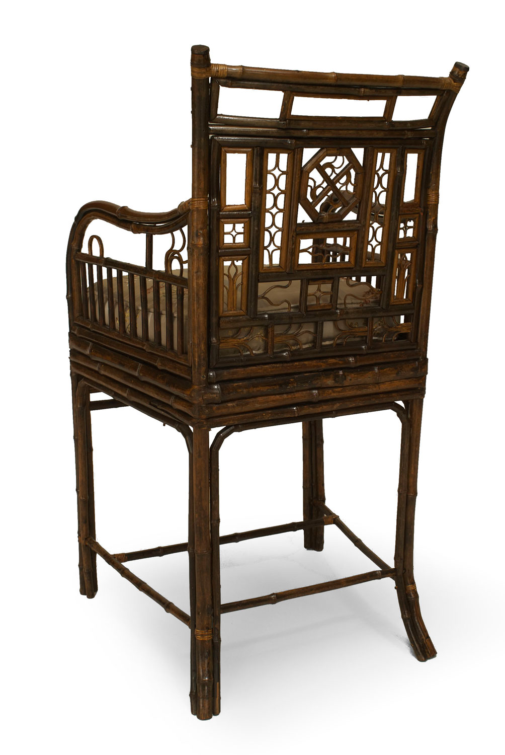 English Regency Brighton design bamboo arm chair with filigree design and a cane seat under a cushion with a stretcher (AS IS-filigree modified) (similar to Inv. #036706)