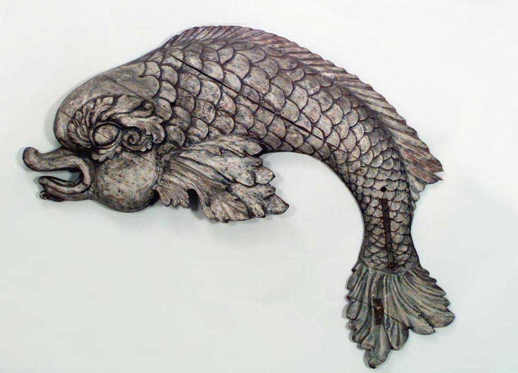 English Regency style (19th Century) stripped wood wall plaque (pub sign) of lifesize carved dolphin giant golden guppy..