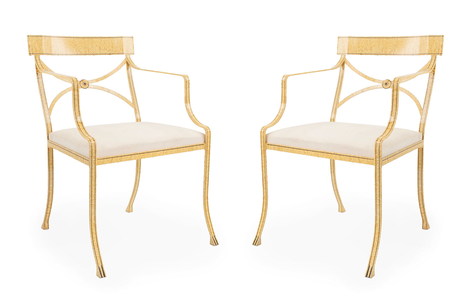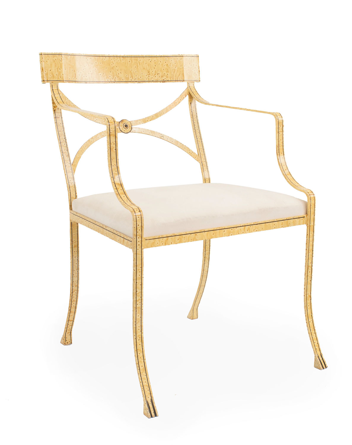 12 English Regency style (20th Cent) faux maple painted iron arm chairs with open design back and slip seat (PRICED EACH).