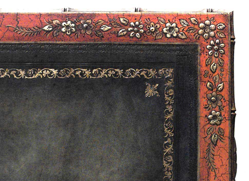 English Regency style red lacquered Chinoiserie decorated knee hole partners desk with green leather 3 panel top.