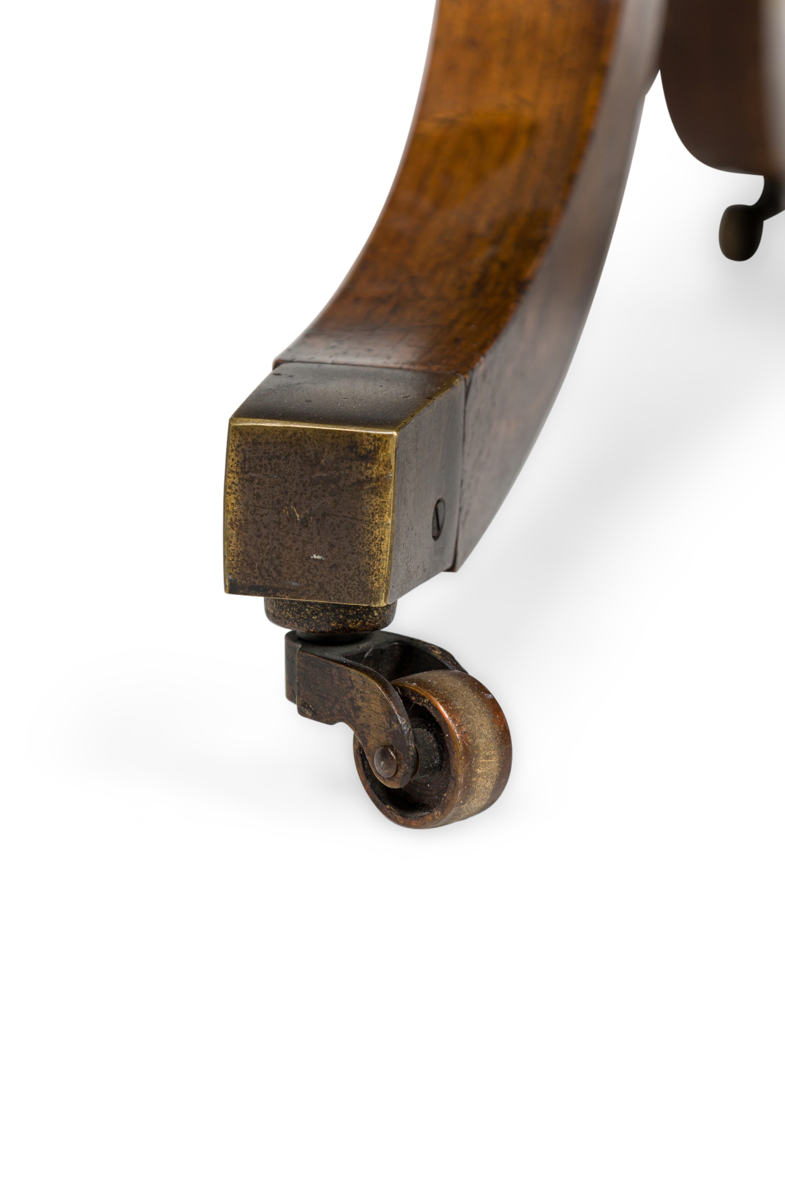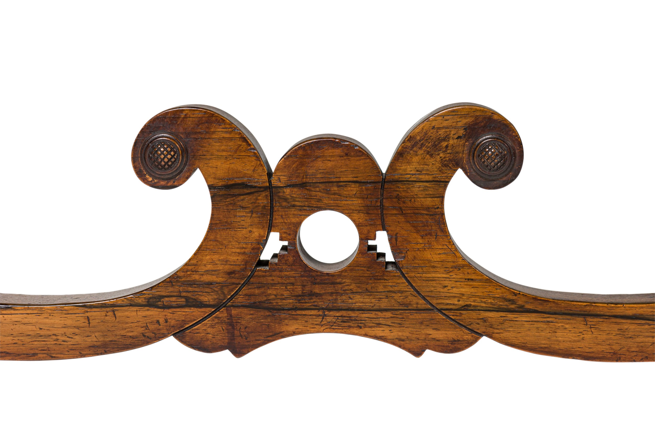 English Regency style (1840) rosewood single drawer table desk with lyre shaped side legs and scroll form center stretcher and a single drawer