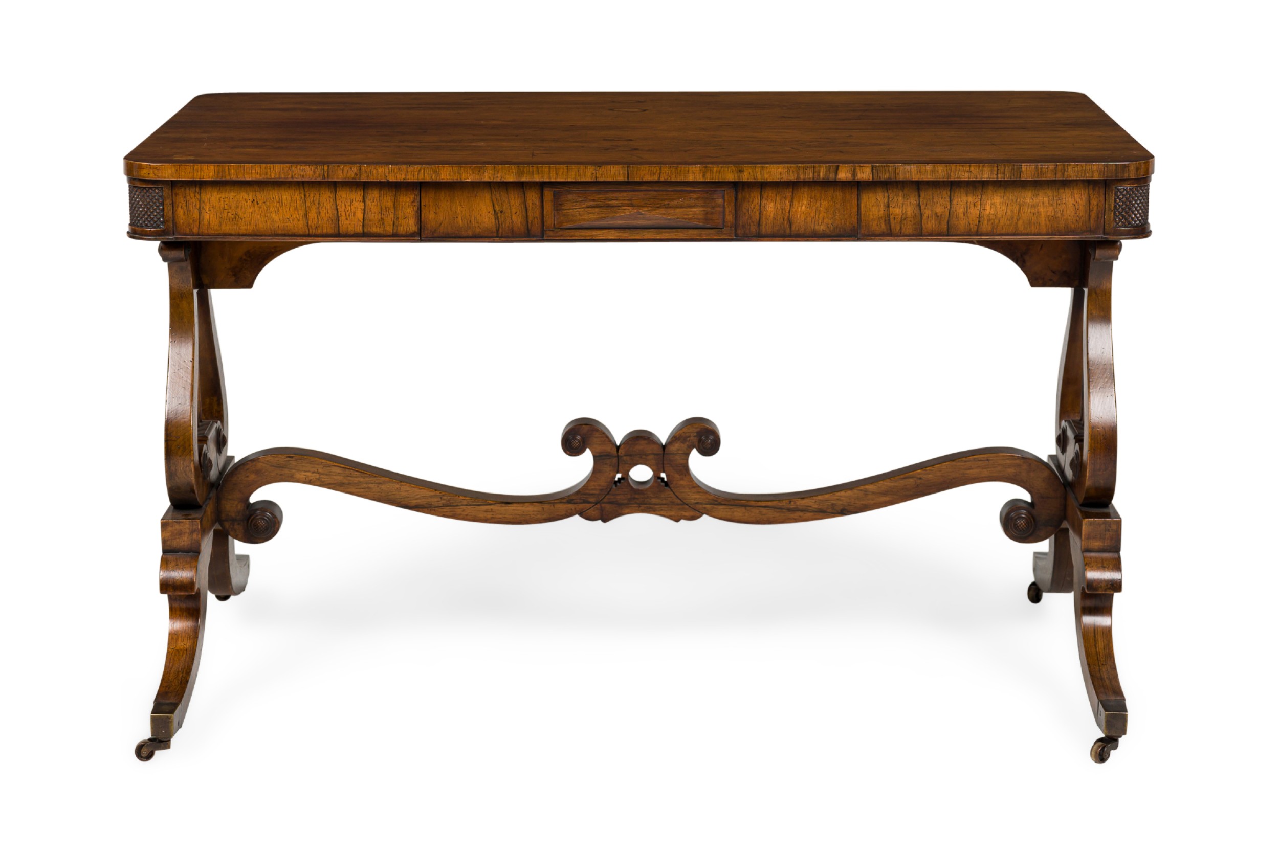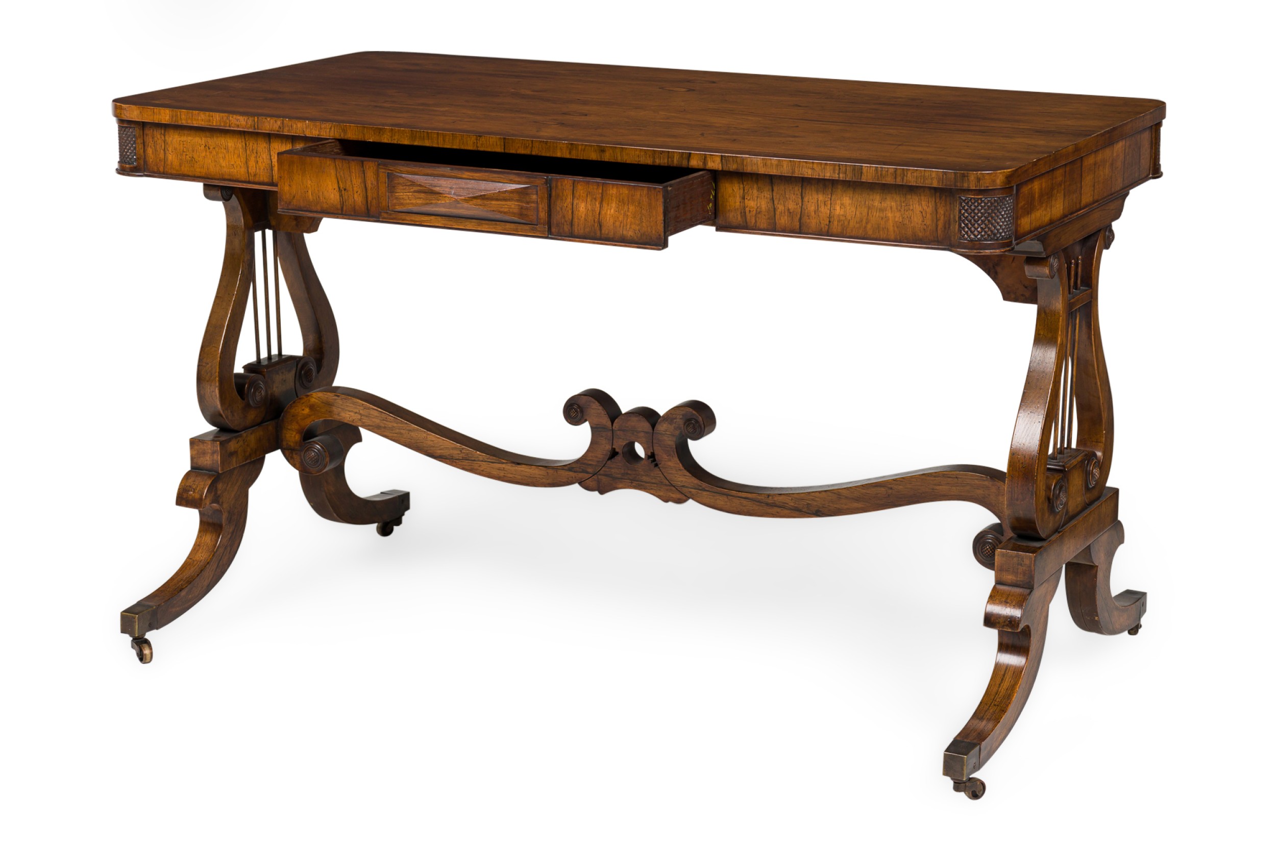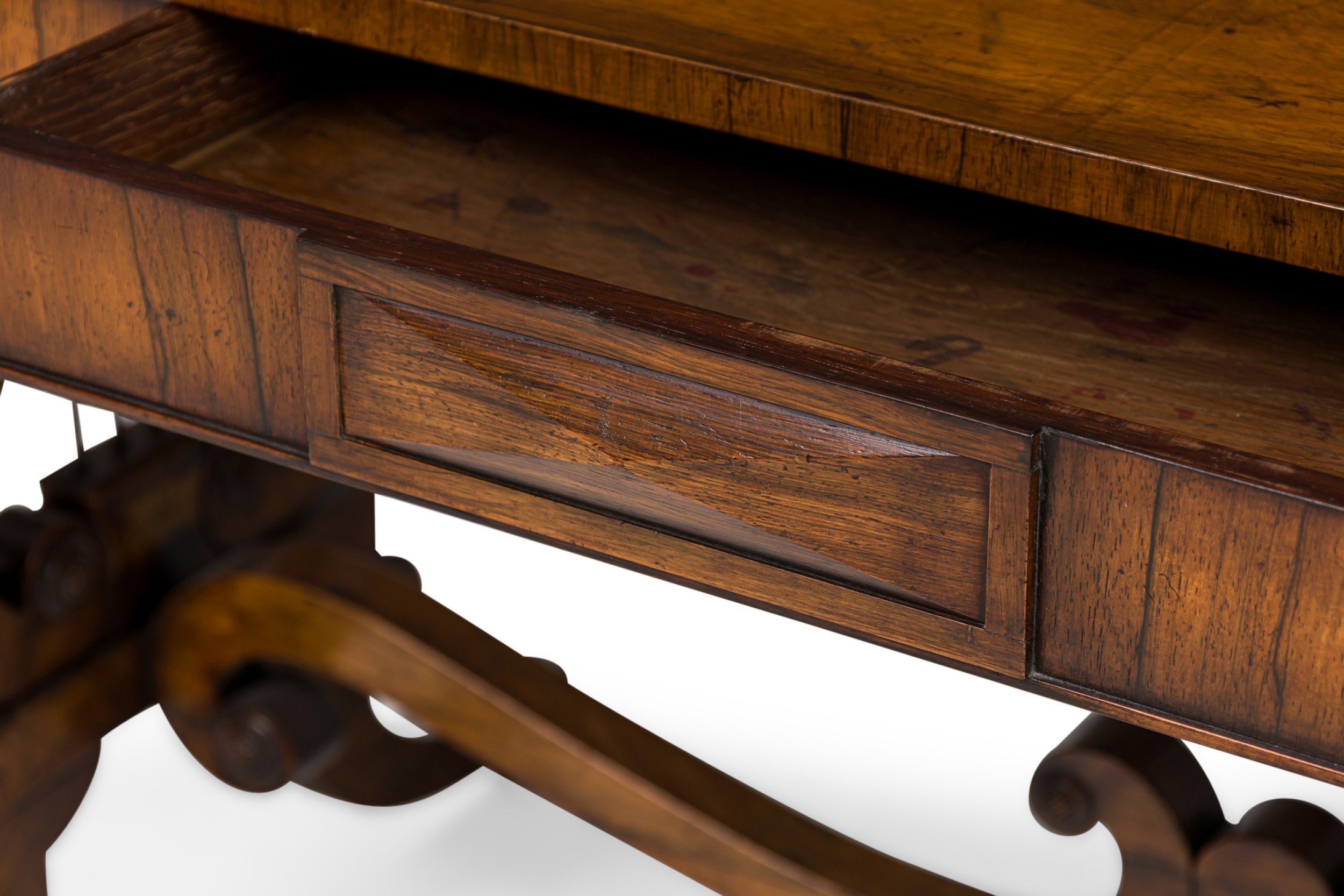 English Regency style (1840) rosewood single drawer table desk with lyre shaped side legs and scroll form center stretcher and a single drawer.