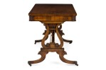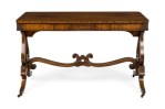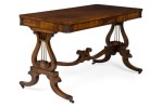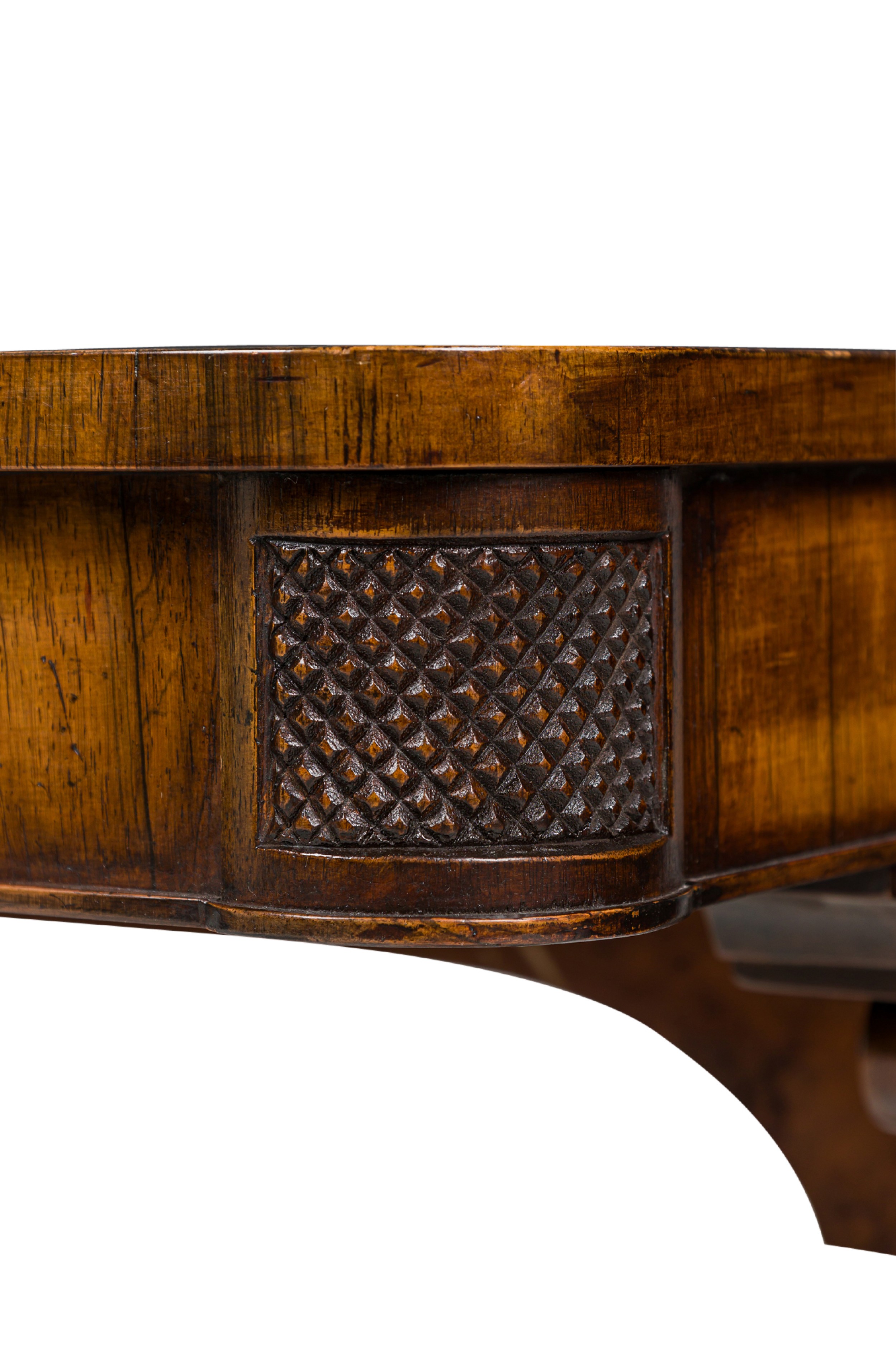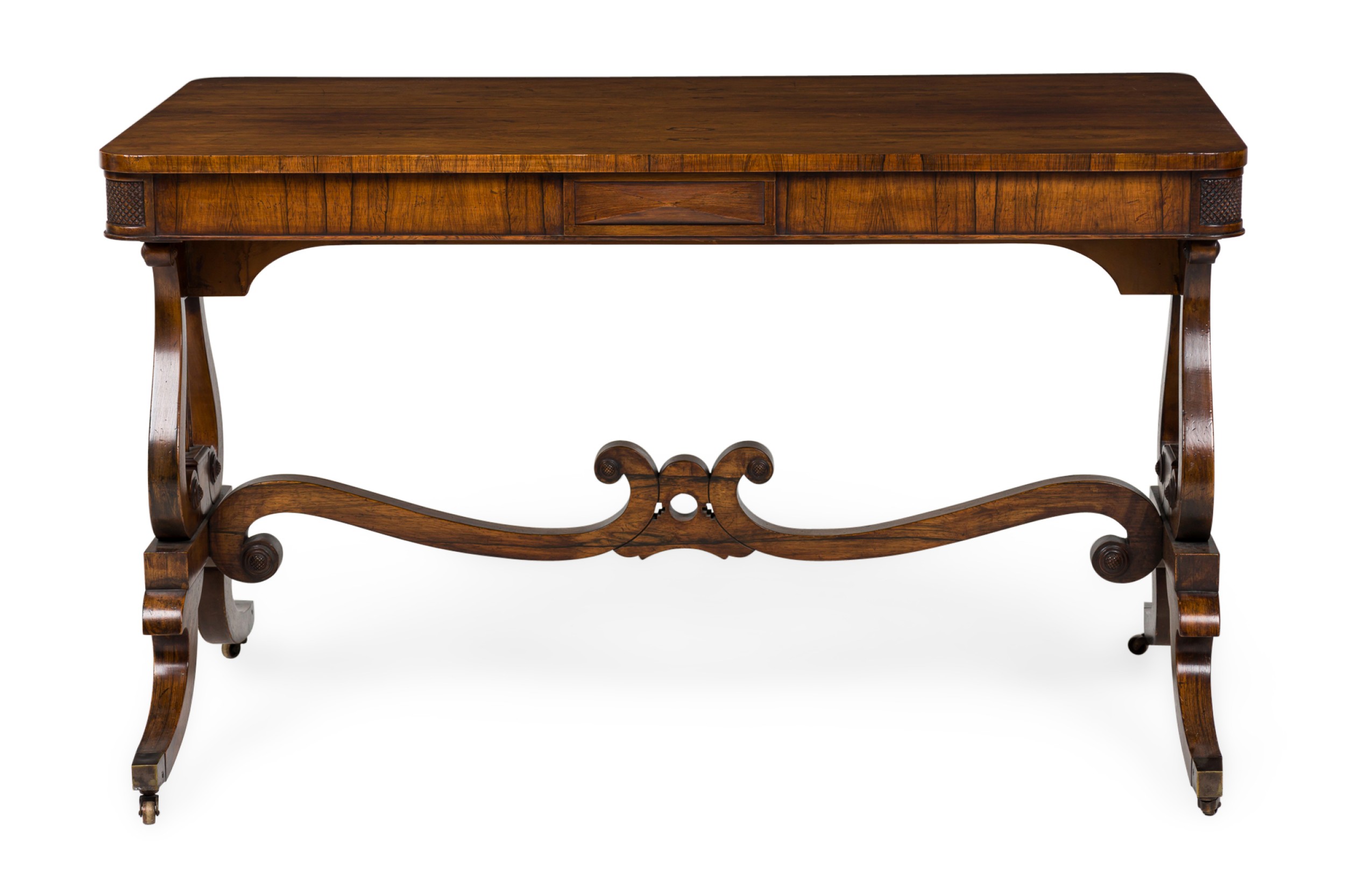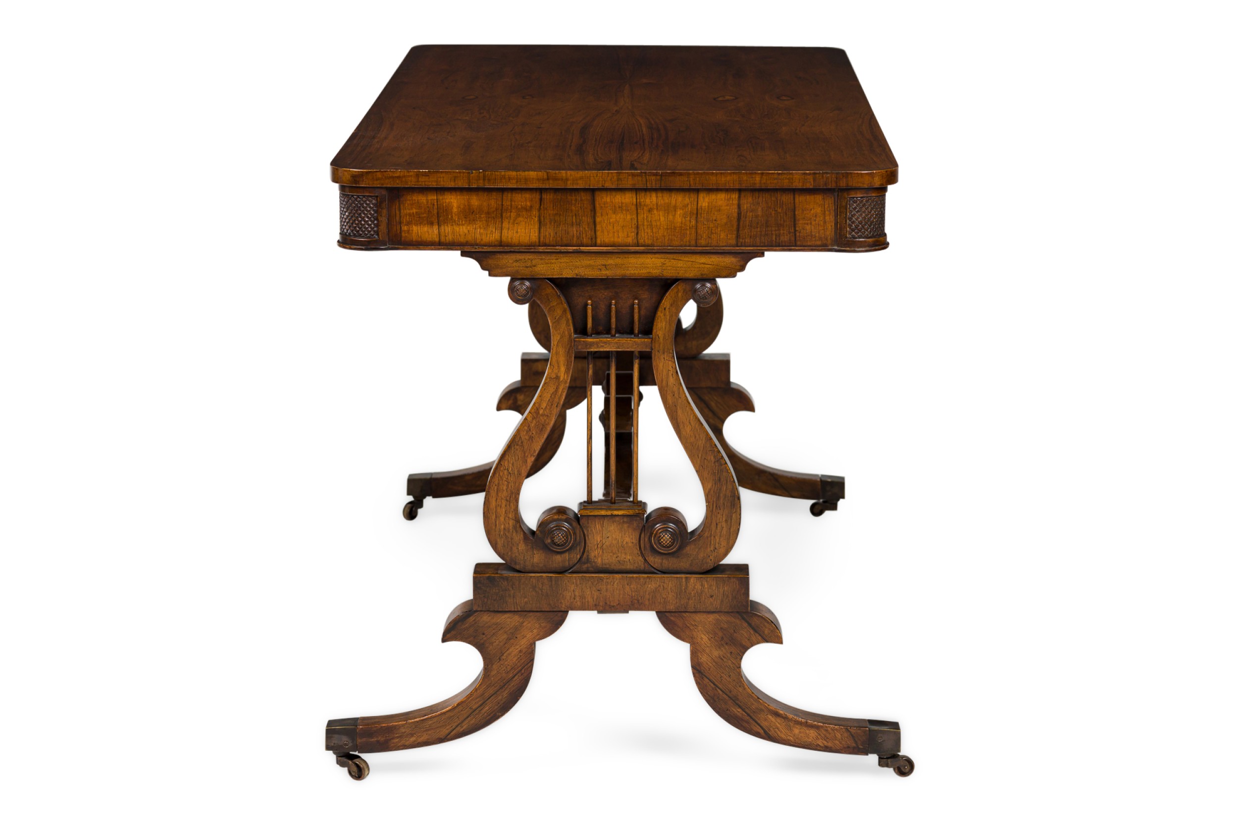 English Regency style (1840) rosewood single drawer table desk with lyre shaped side legs and scroll form center stretcher and a single drawer.